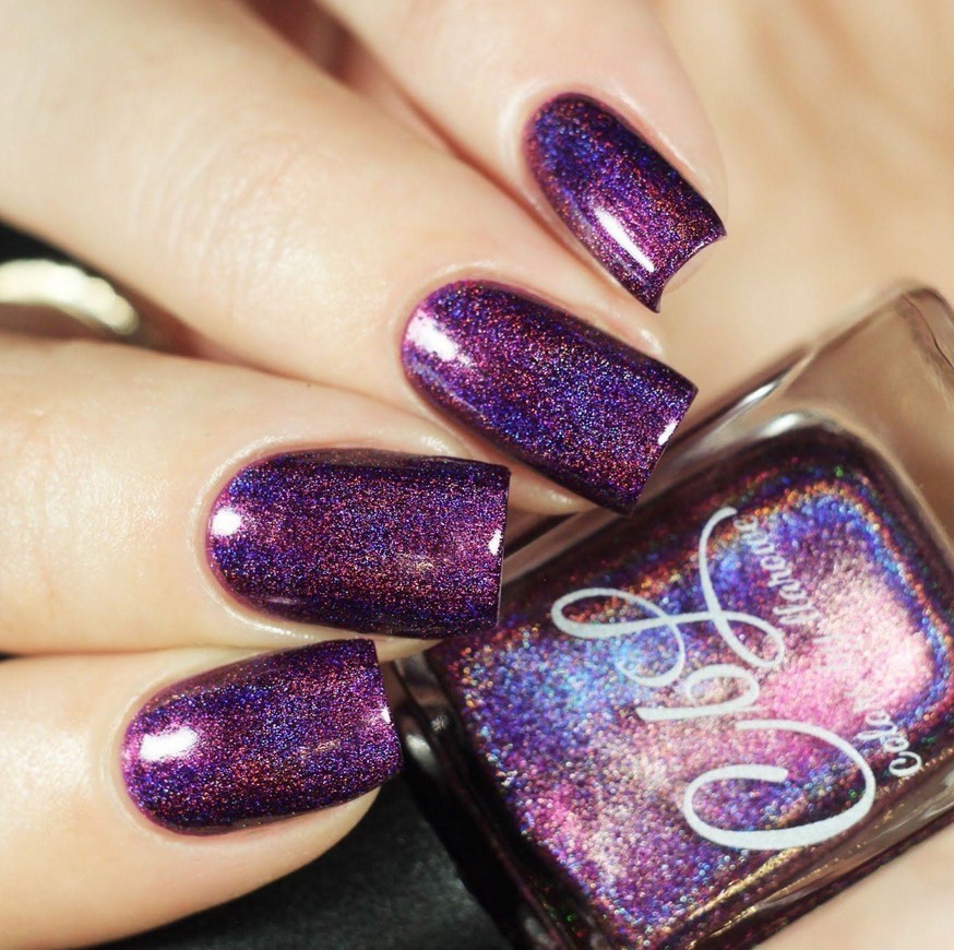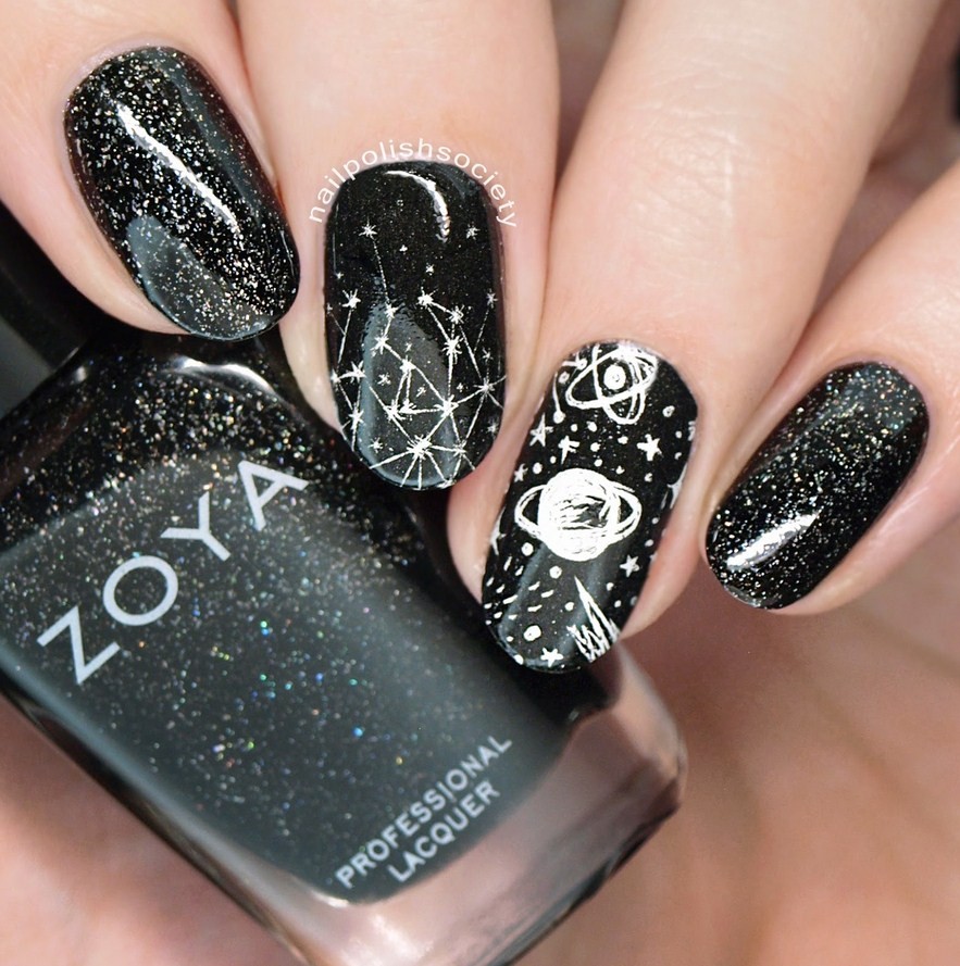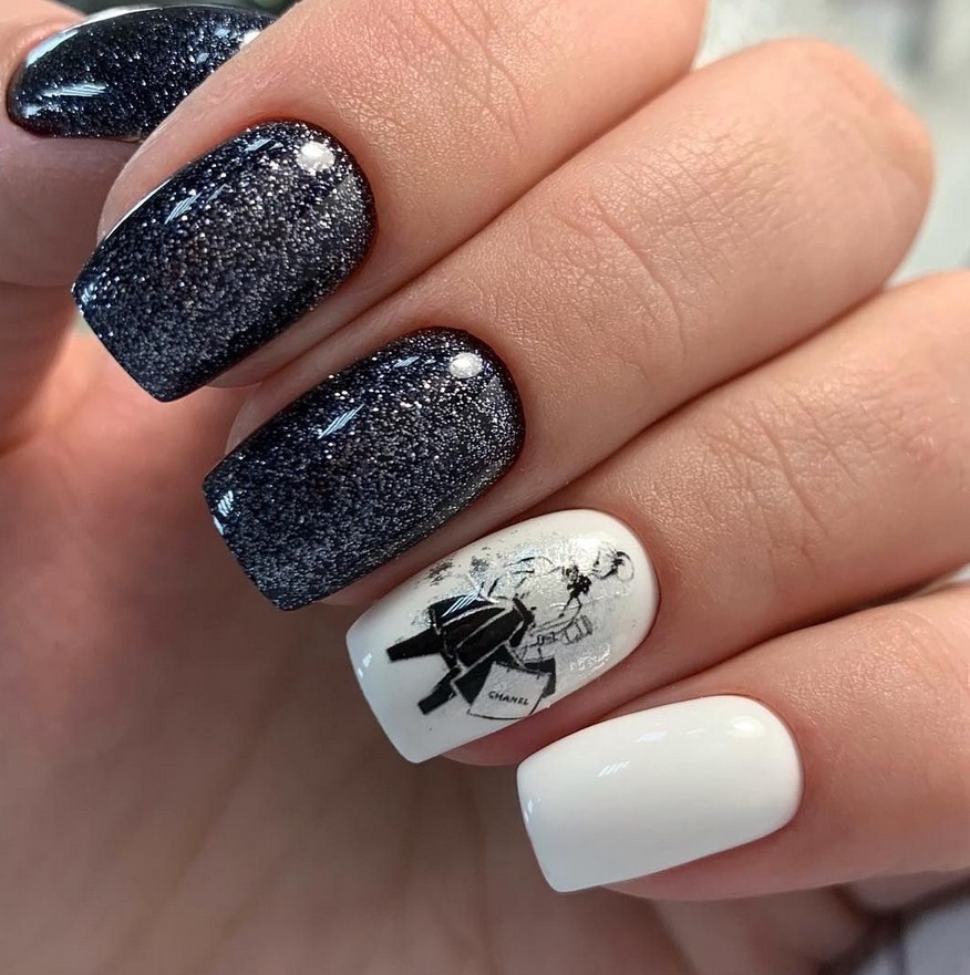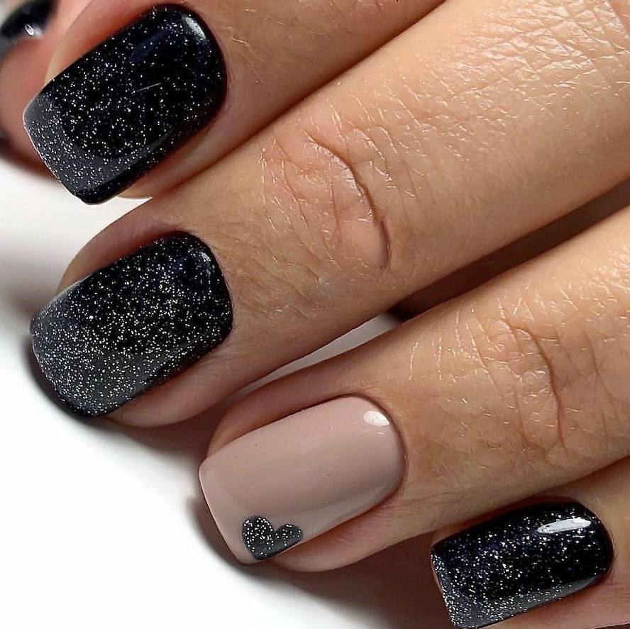 Переливающиеся ногти в чёрном цвете выглядят загадочно и даже магически. Также можно скомбинировать бархатный чёрный лак с блёстками и глиттером или тёмный френч с сияющими кончиками ногтей.