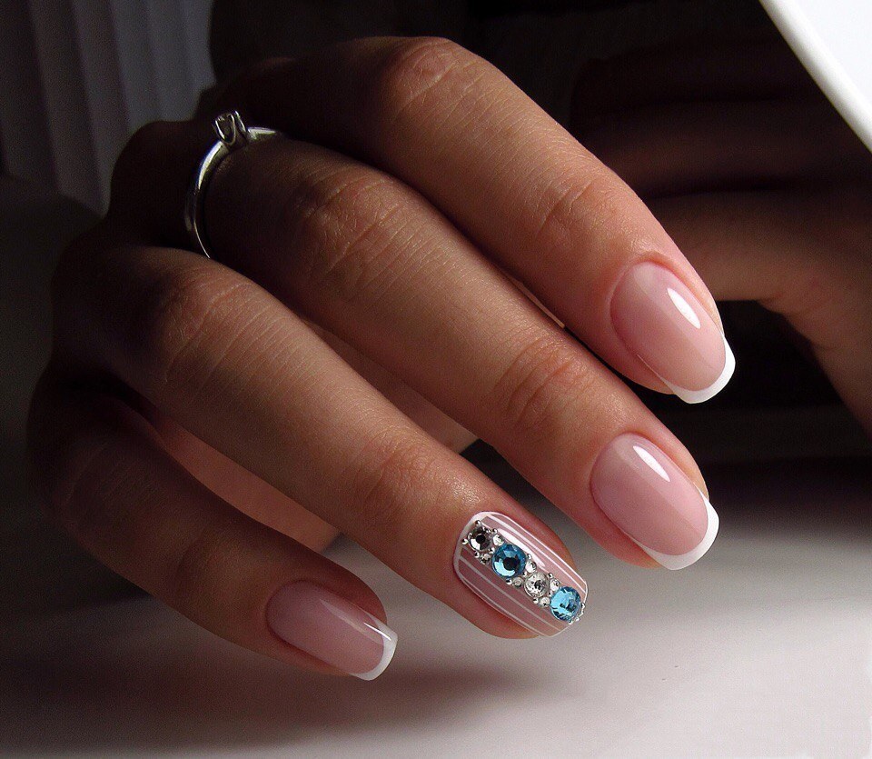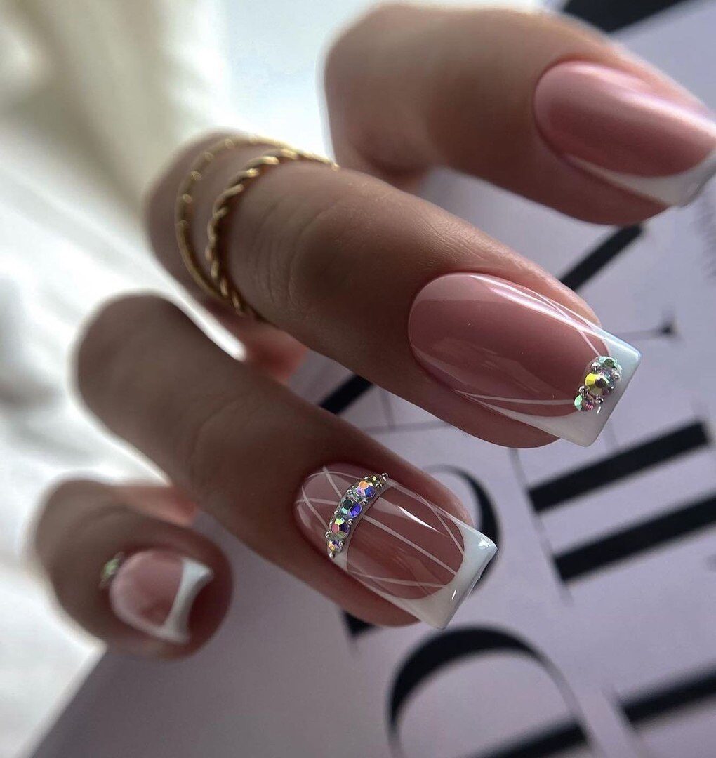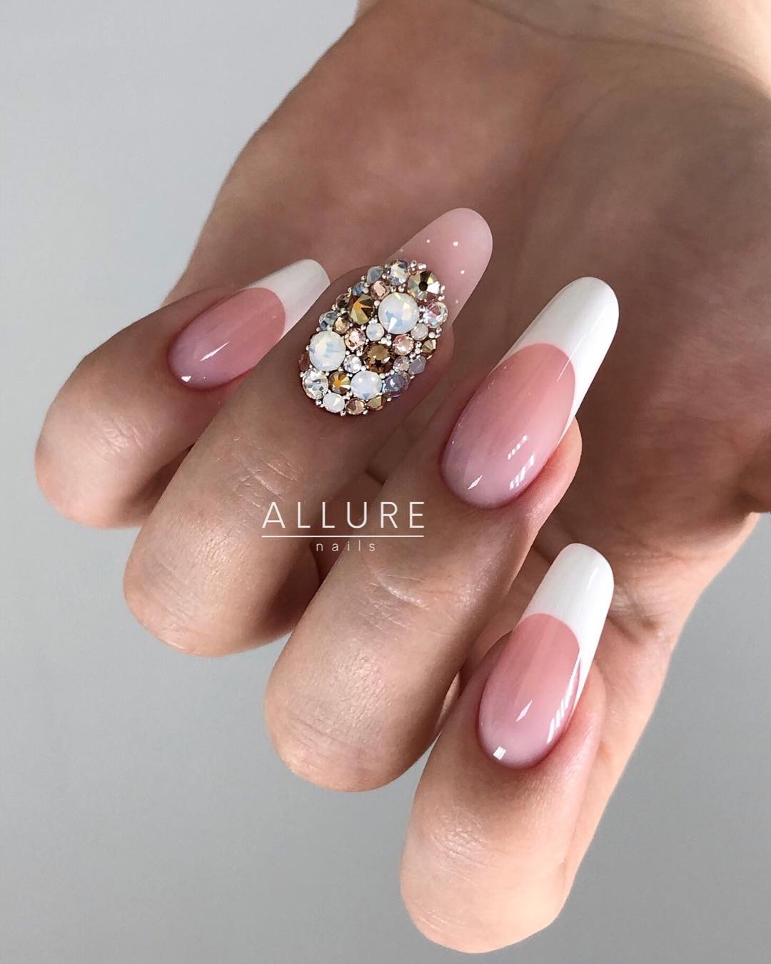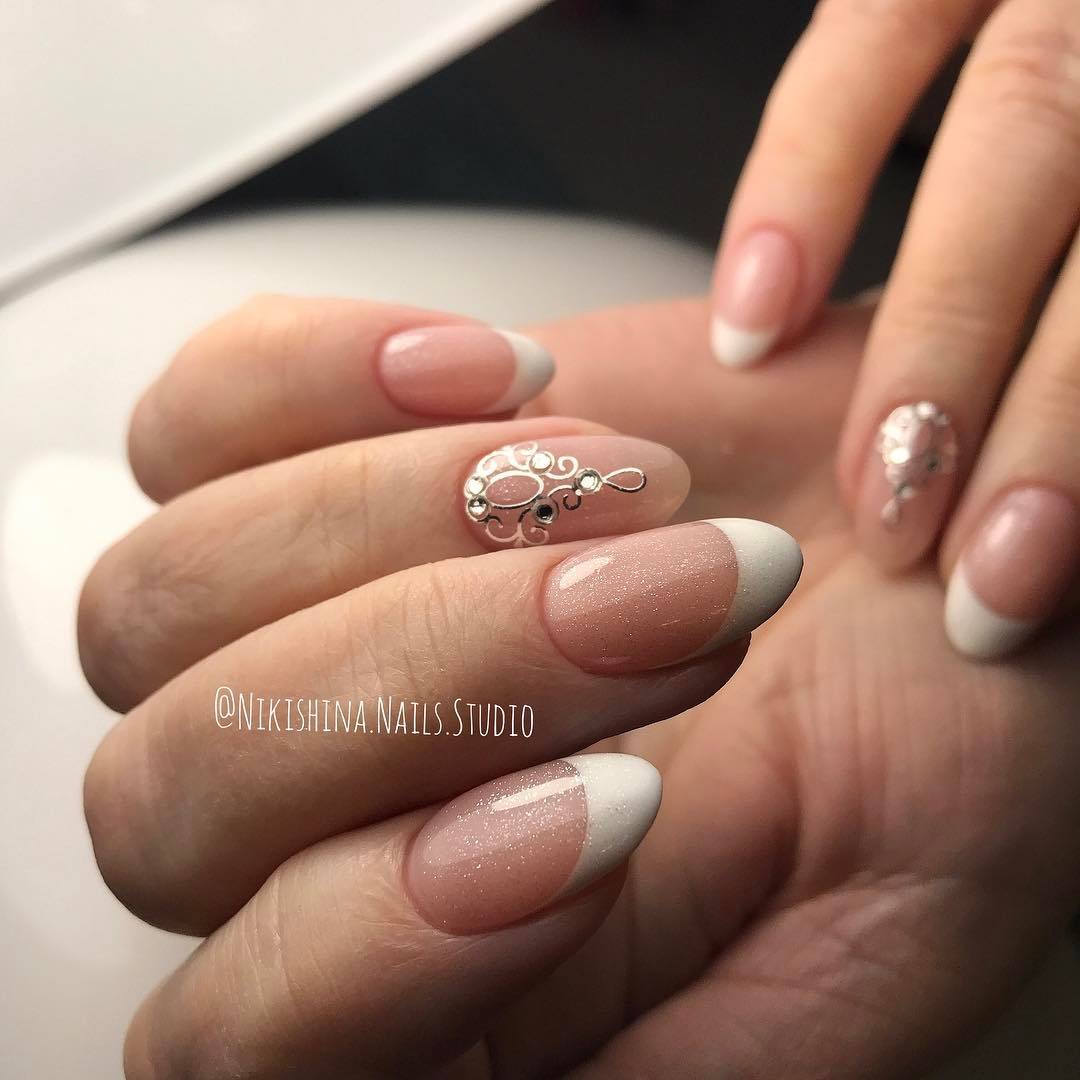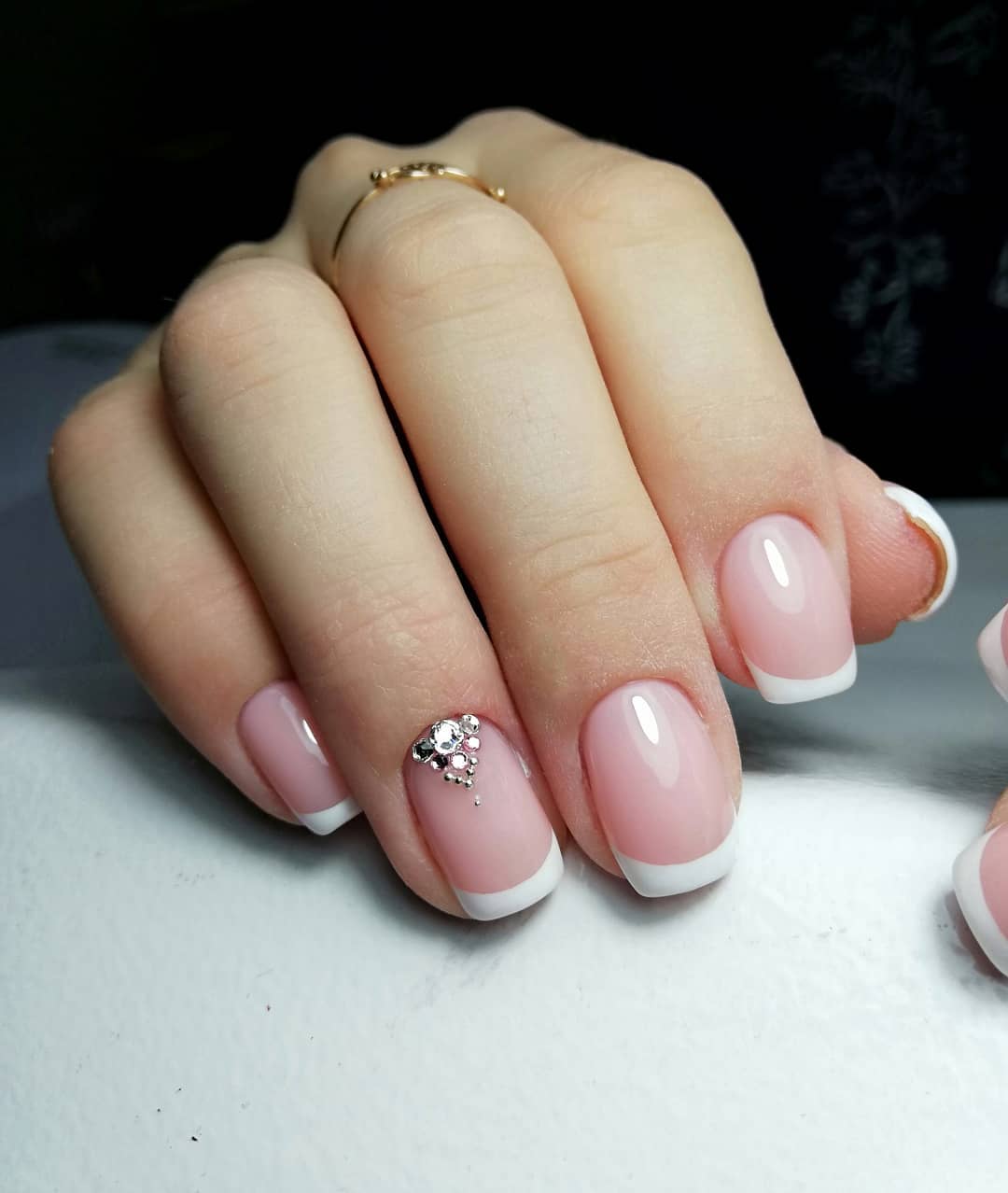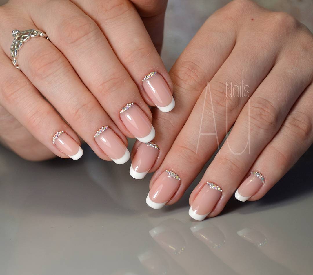 Французский маникюр со стразами в светлых и нюдовых тонах, прежде всего, ассоциируется со свадебными дизайнами.