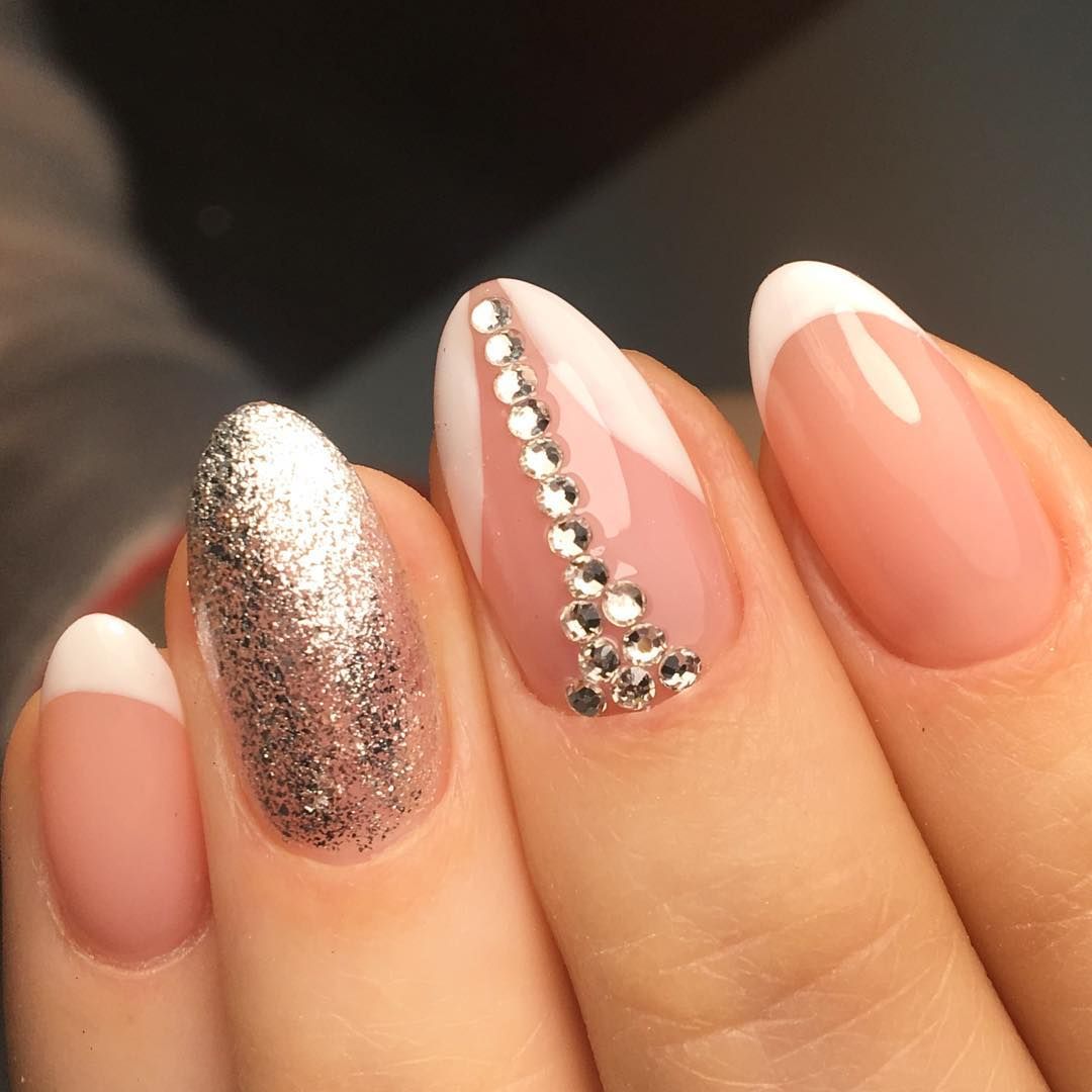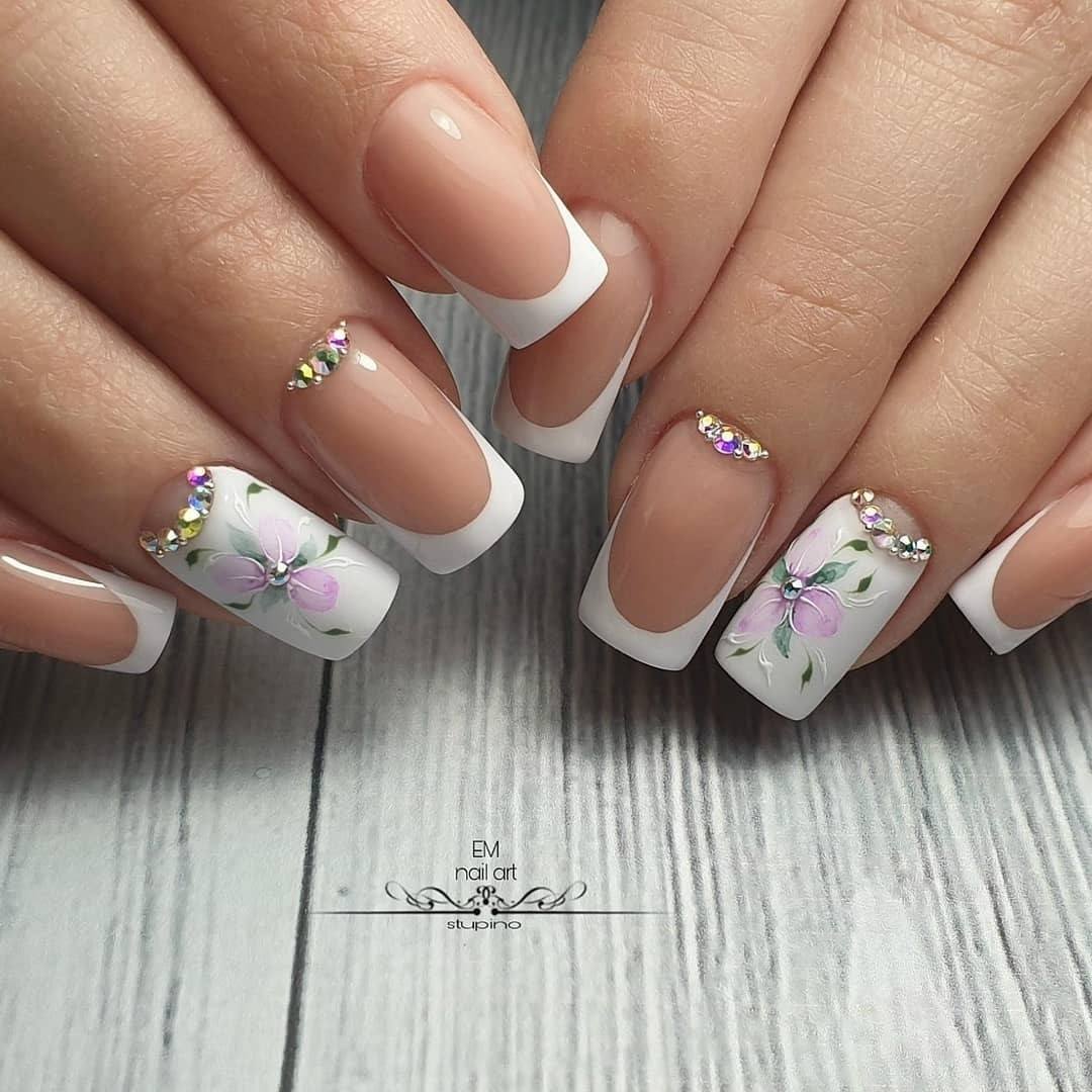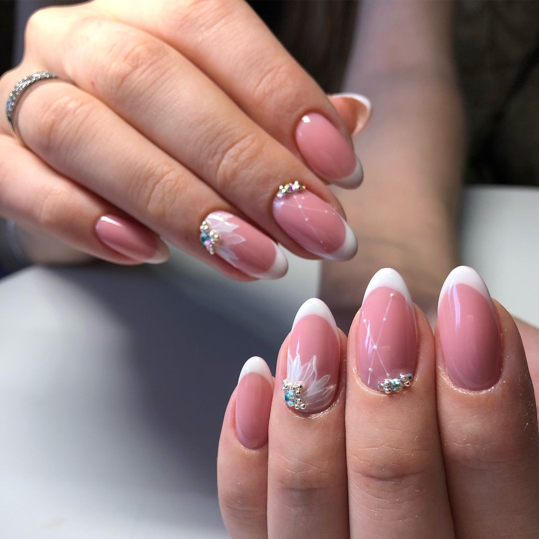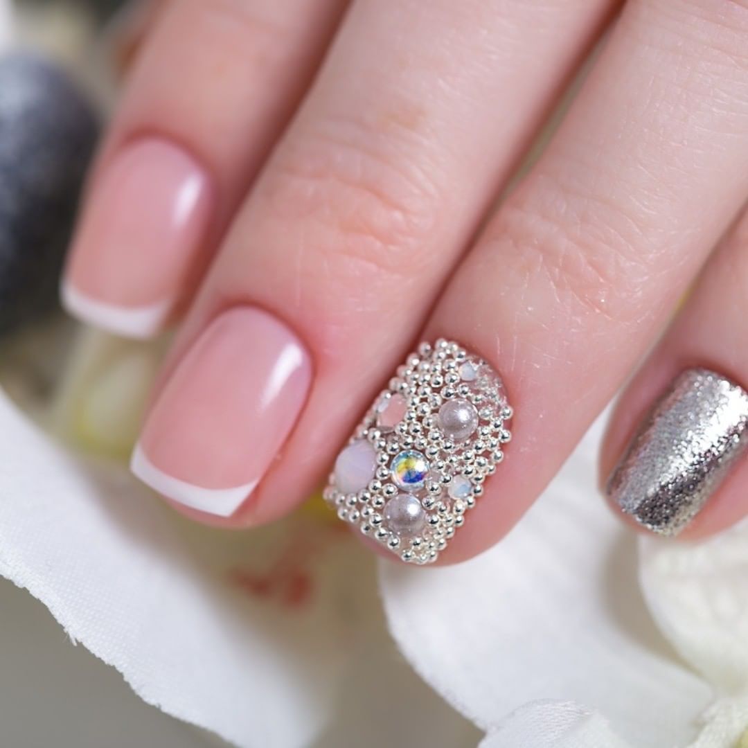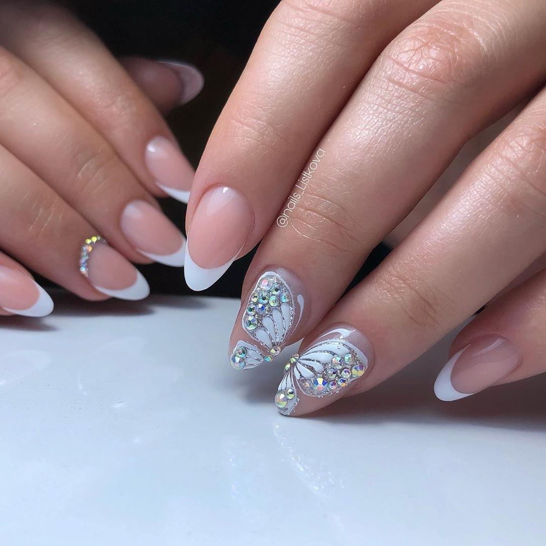 Французский маникюр со стразами в светлых и нюдовых тонах, прежде всего, ассоциируется со свадебными дизайнами.