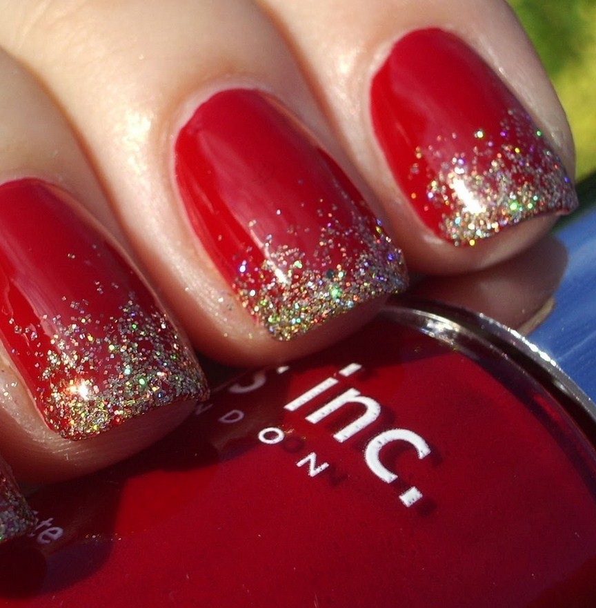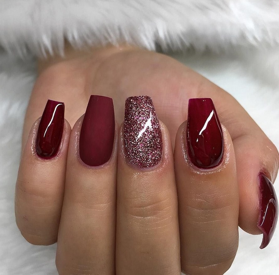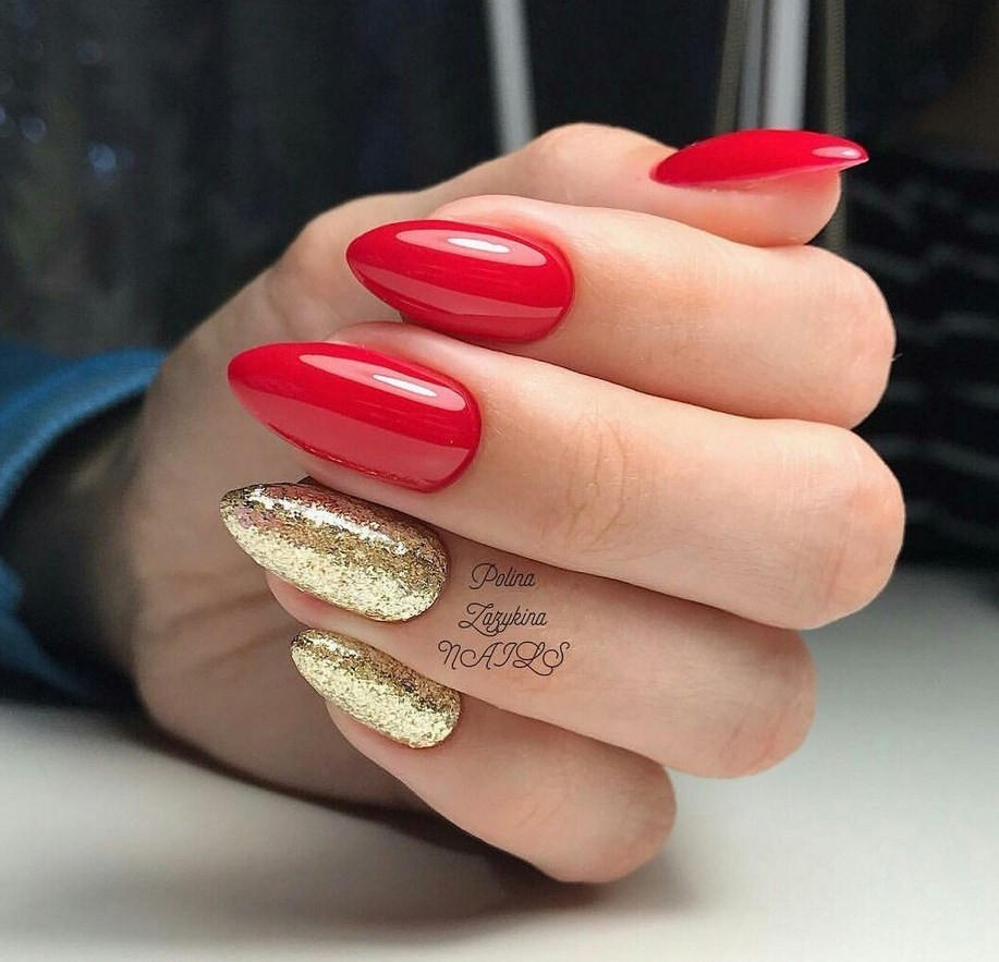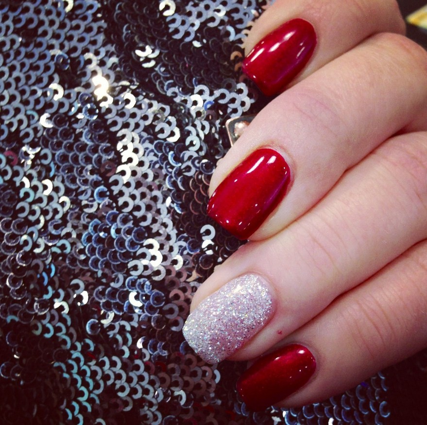 Красивый красный дизайн с блестящим декором уже несколько лет относится к модным нейл-тенденциям. Глиттер отлично сочетается со всеми тонами красной гаммы – бордовым маникюром, винным, брусничным.