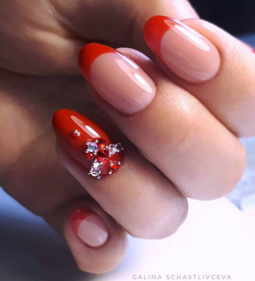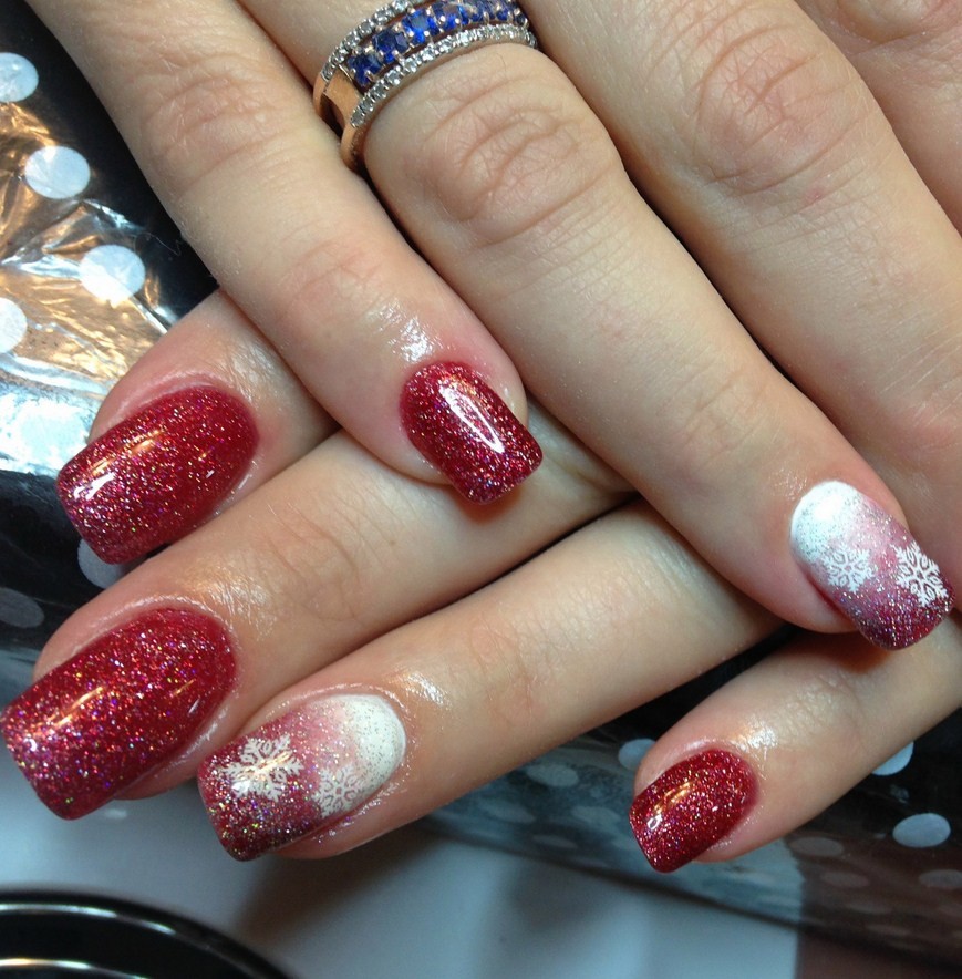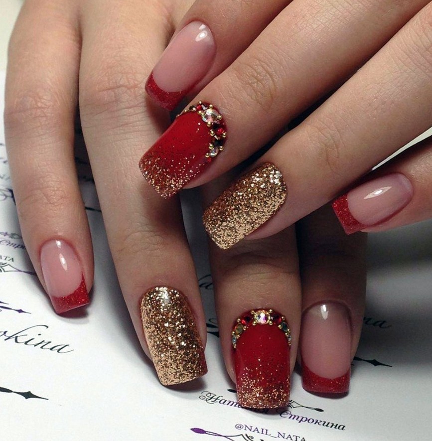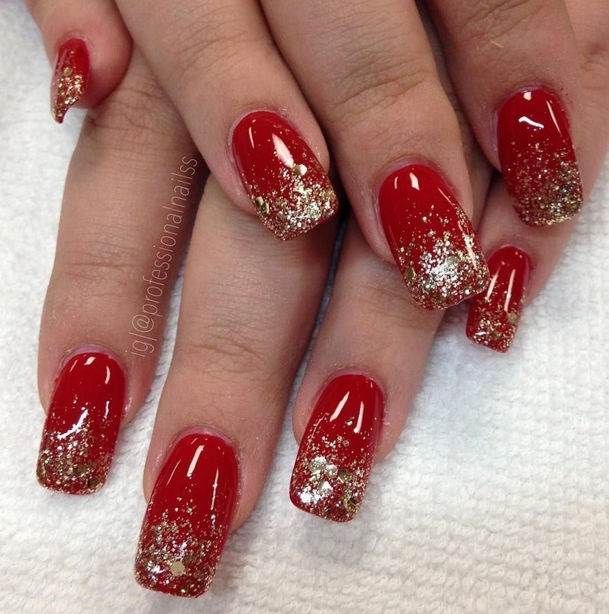 Красивый красный дизайн с блестящим декором уже несколько лет относится к модным нейл-тенденциям. Глиттер отлично сочетается со всеми тонами красной гаммы – бордовым маникюром, винным, брусничным.