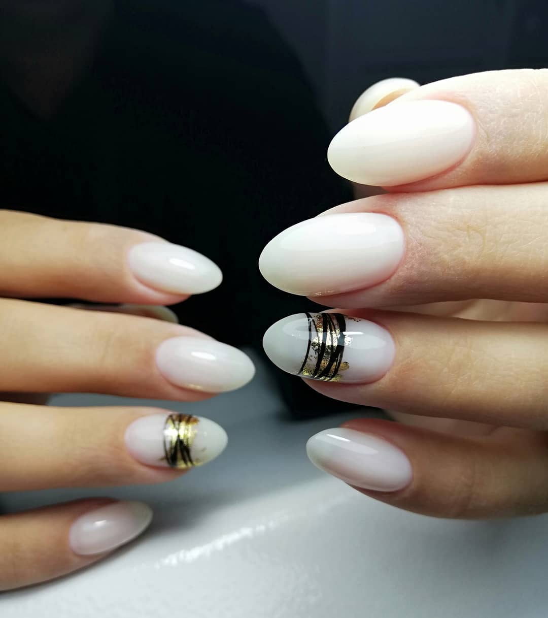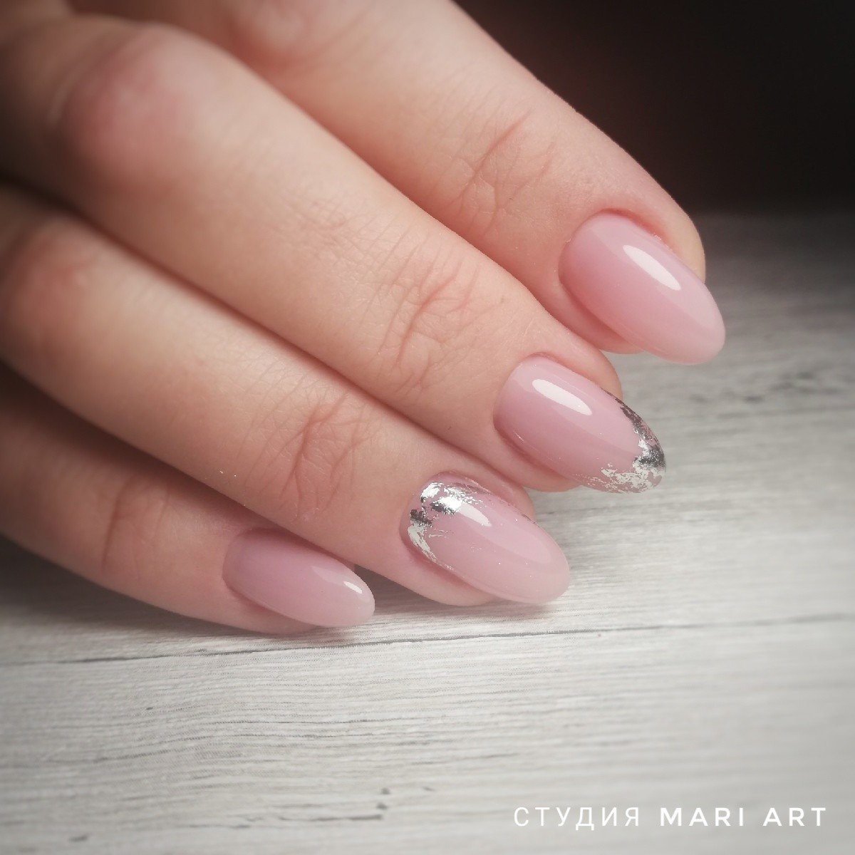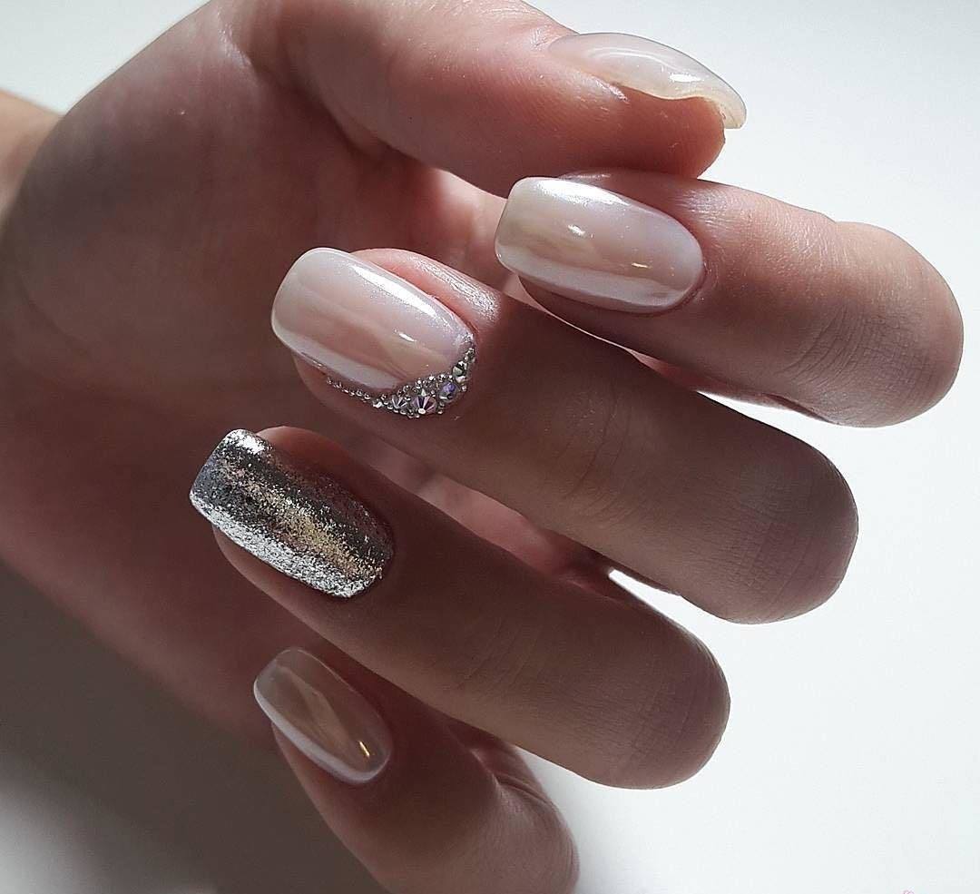 Оригинально и необычно будет смотреться дизайн в стиле «разные руки», одну из которых можно сделать в молочном оттенке с чуть заметными серебристыми лунками, а другую полностью покрыть гель-лаком металлического цвета.