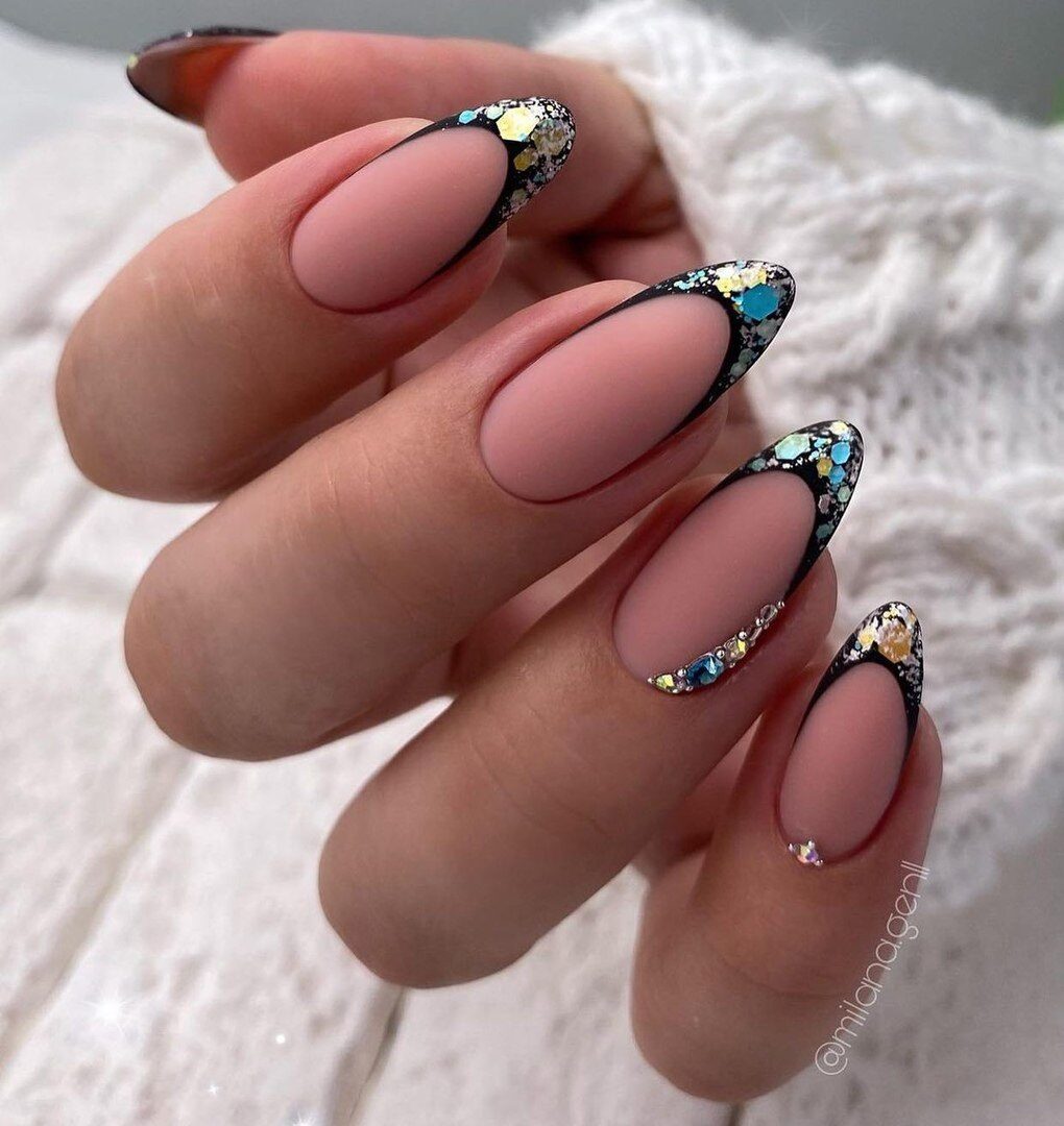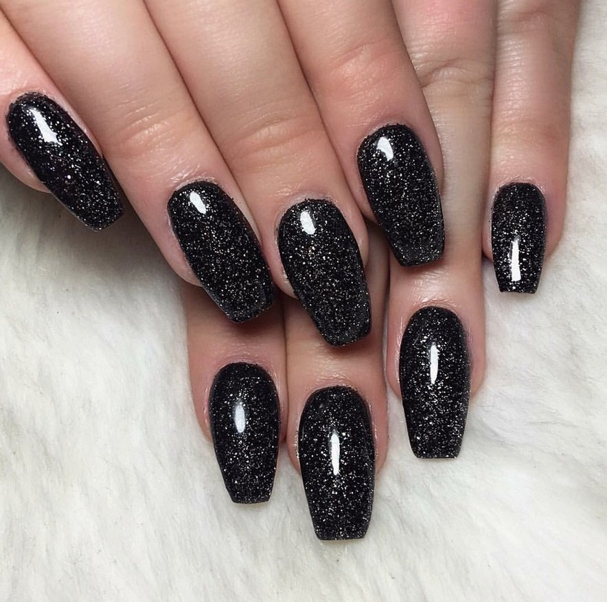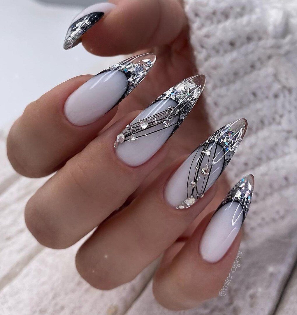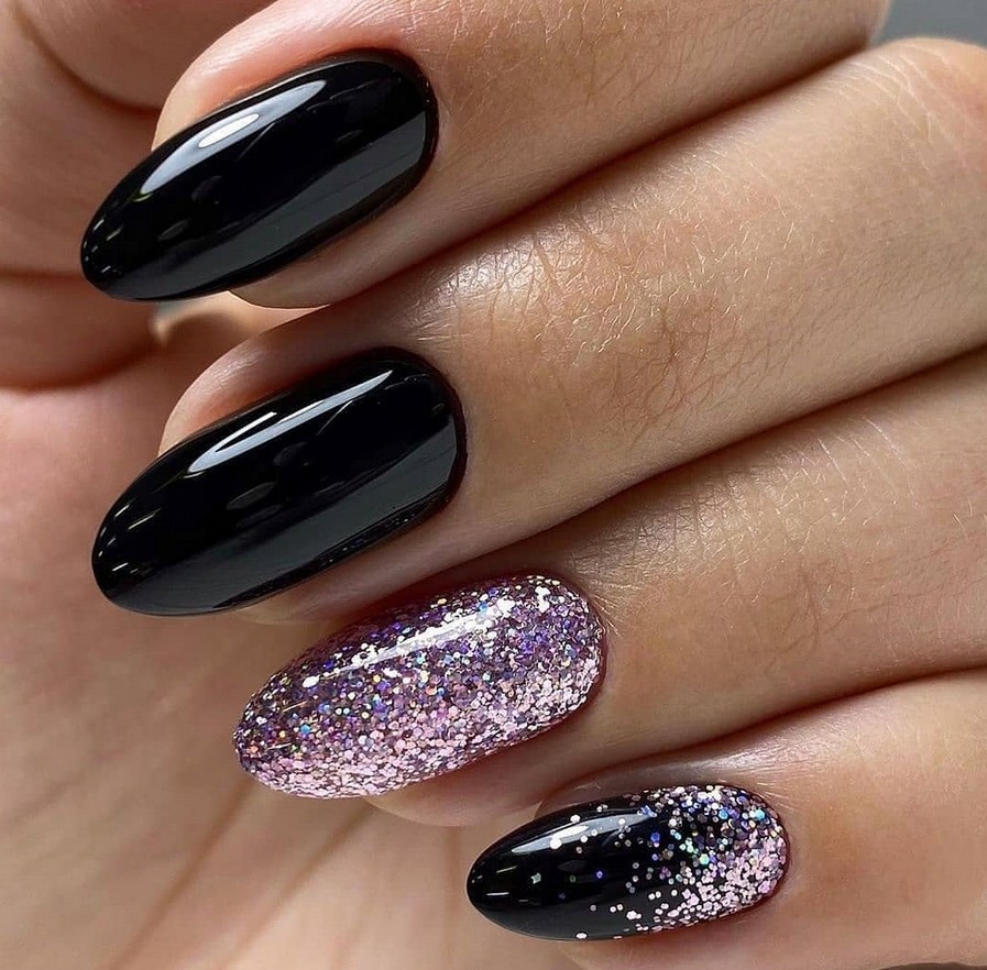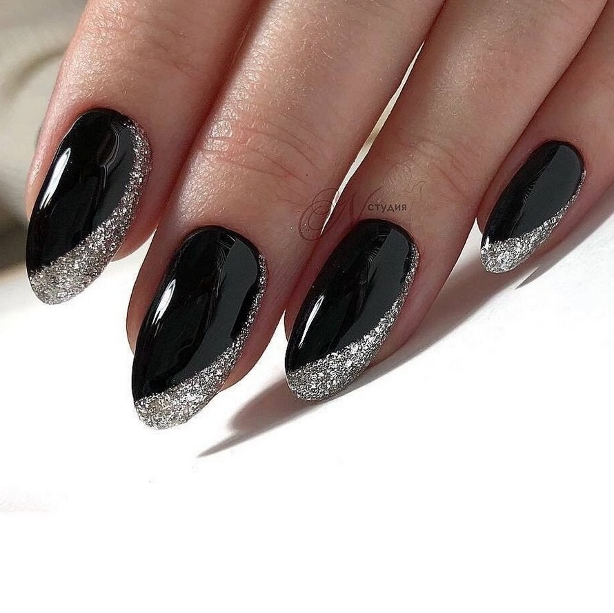 Стильно и эффектно будут смотреться длинные миндалевидные ноготки черного цвета, украшенные серебристыми блестками.