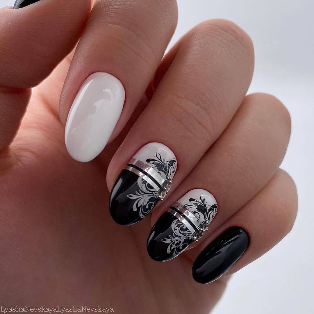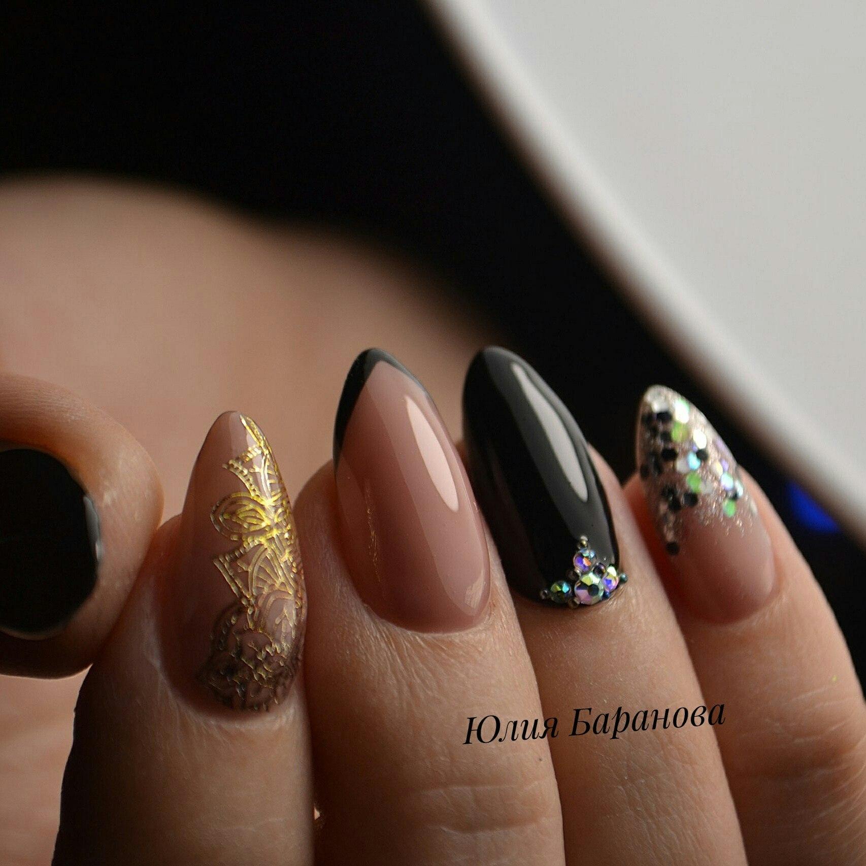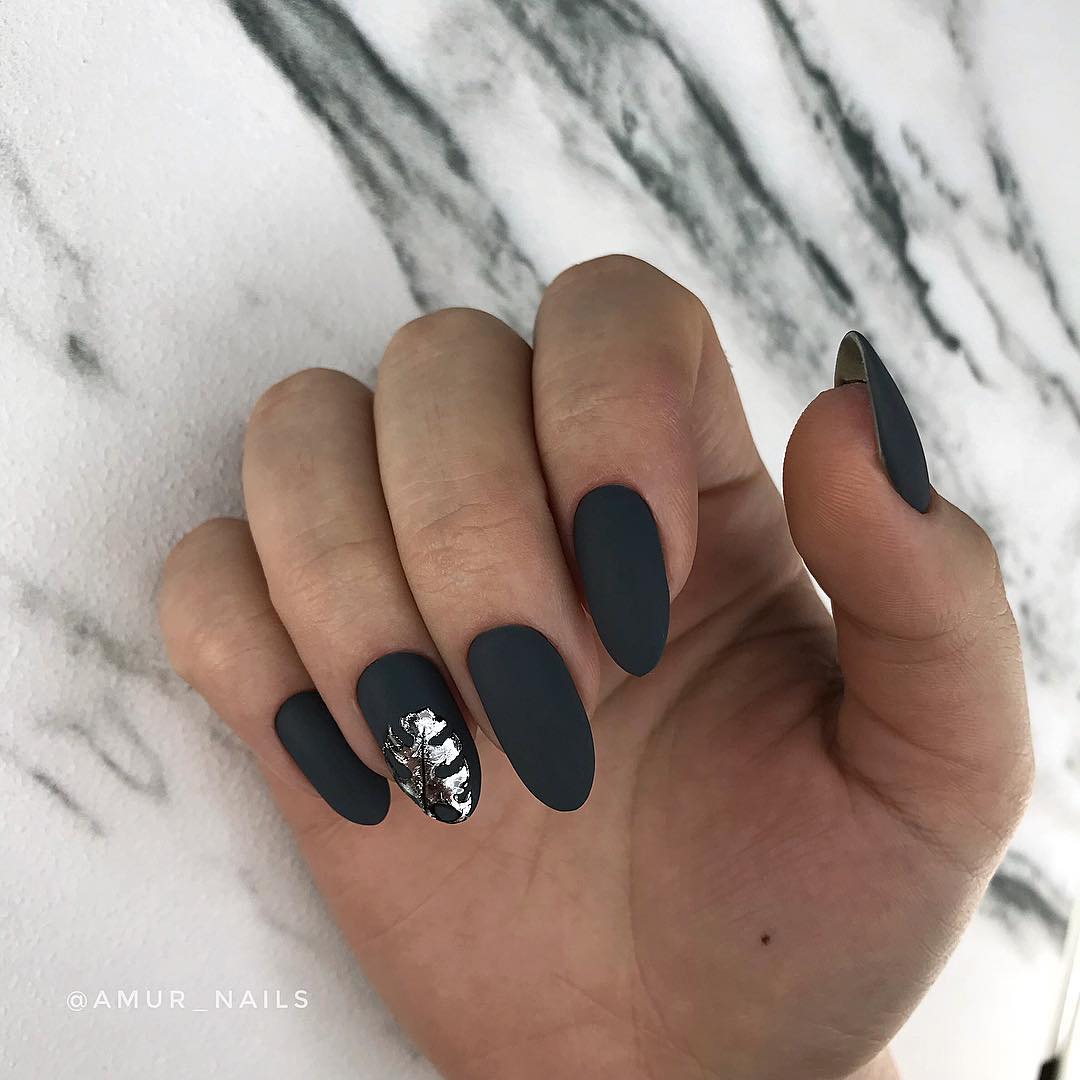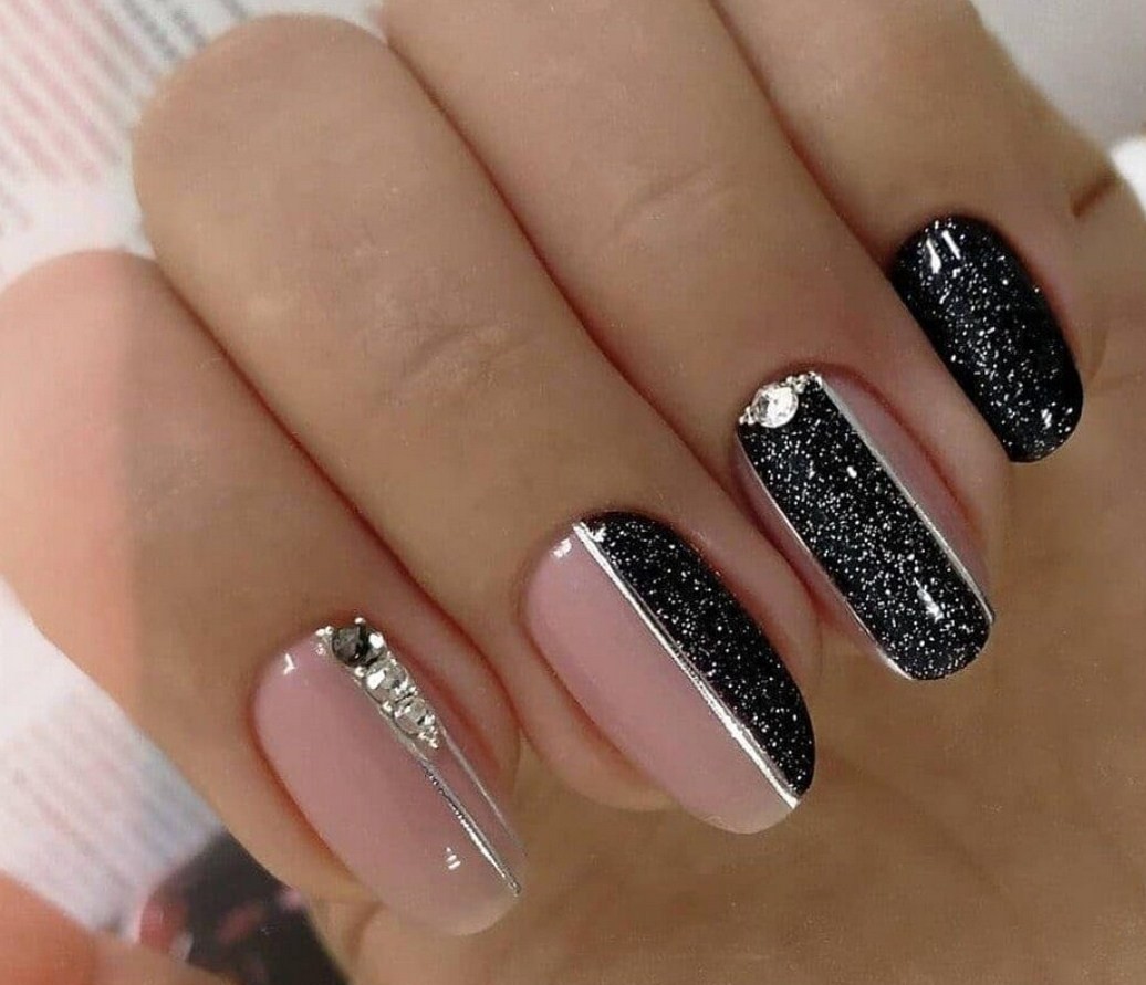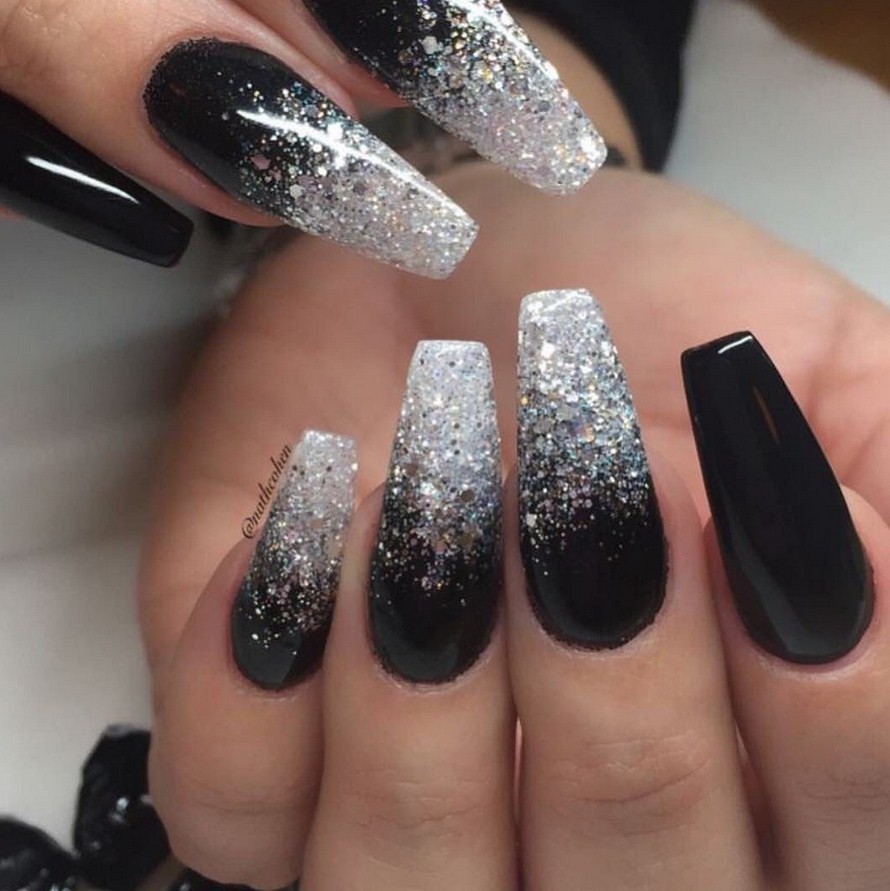Стильно и эффектно будут смотреться длинные миндалевидные ноготки черного цвета, украшенные серебристыми блестками.