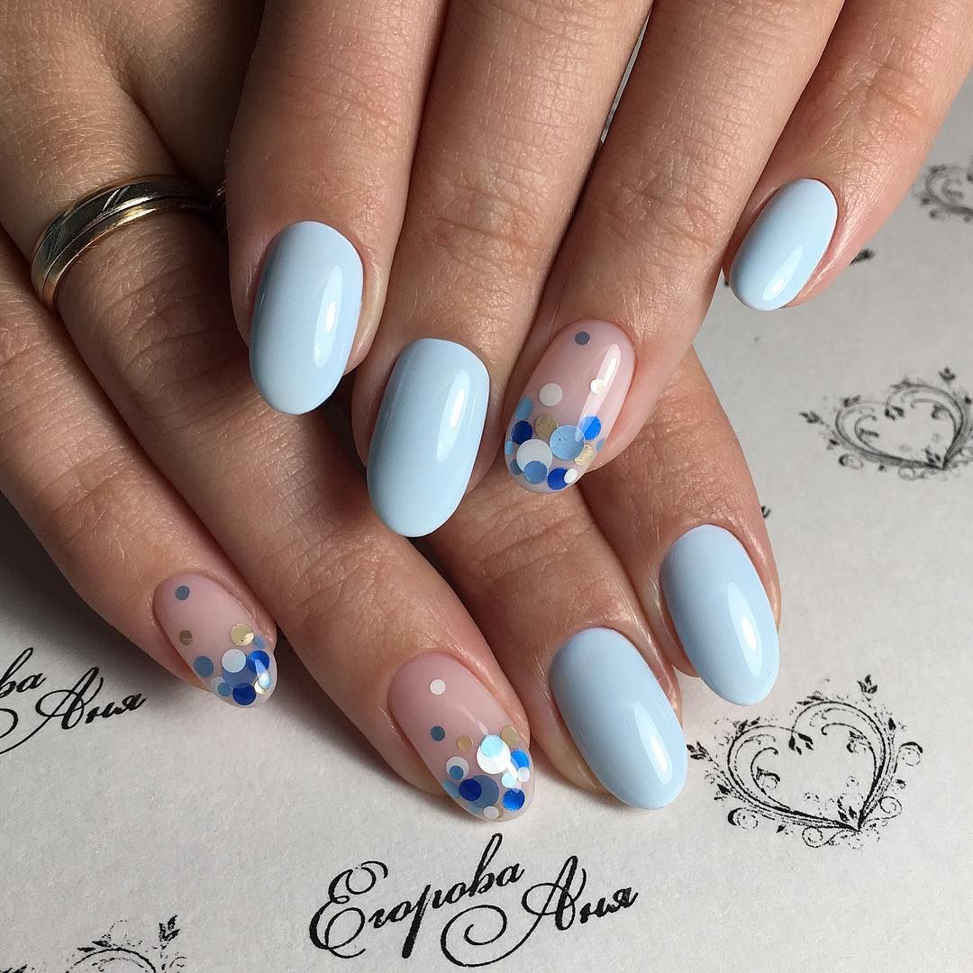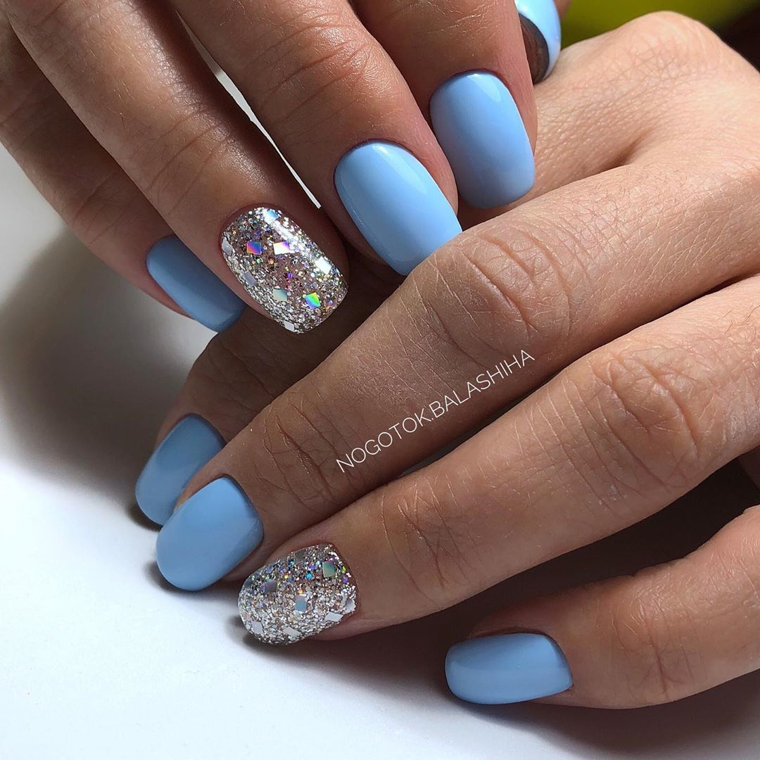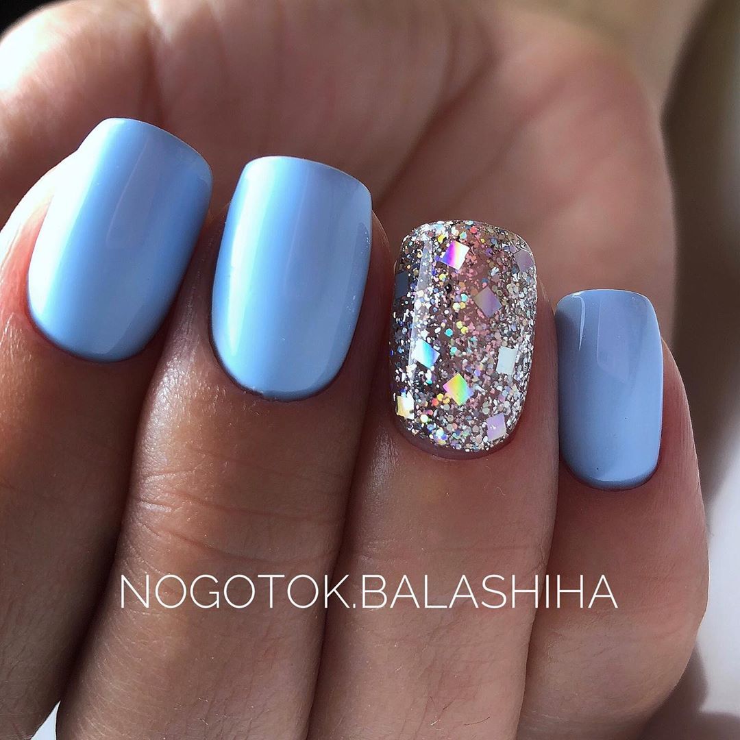 Нежные, но сочные краски как нельзя кстати придутся для оформления ноготков летом и весной. Сейчас в моде все оттенки голубого, которые применяются в техниках омбре, френч. Блеск глиттера только придаст им игривости.