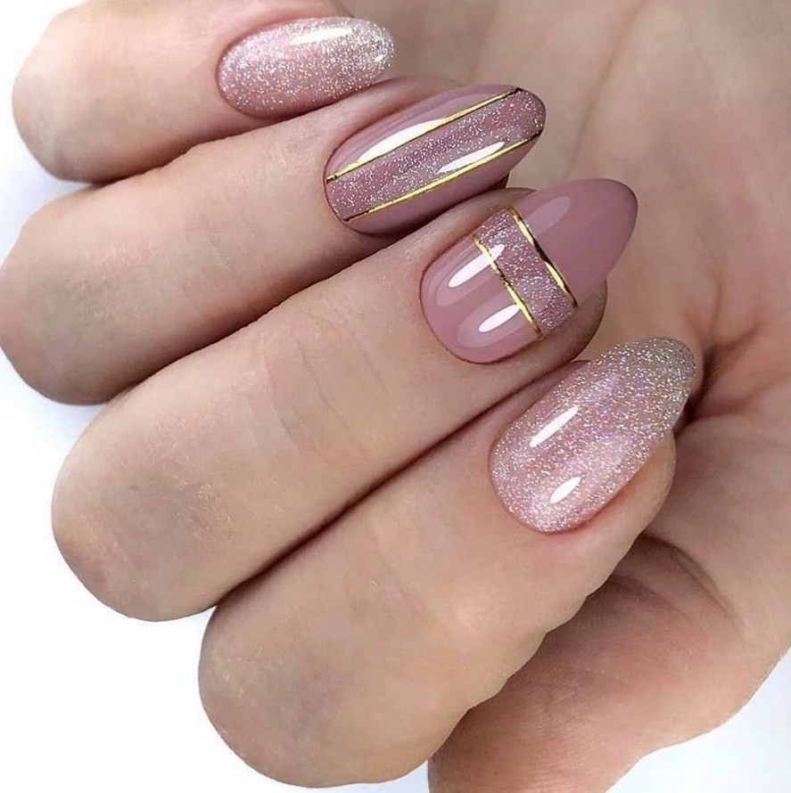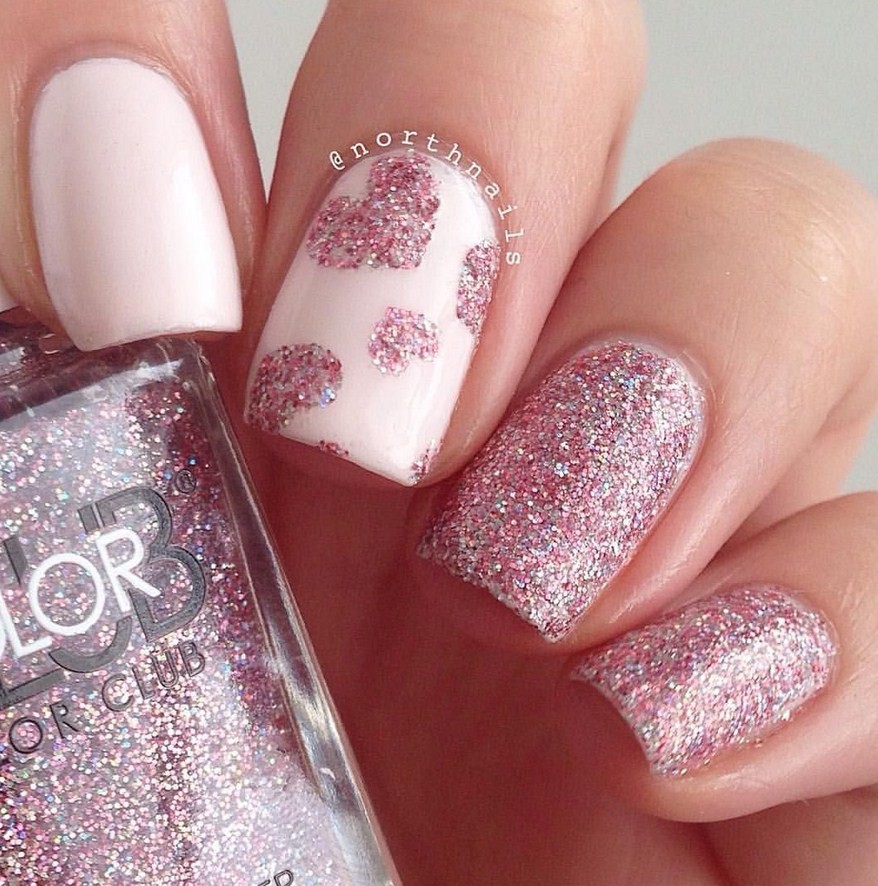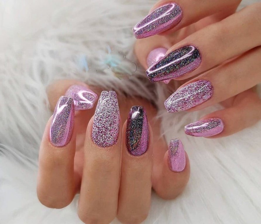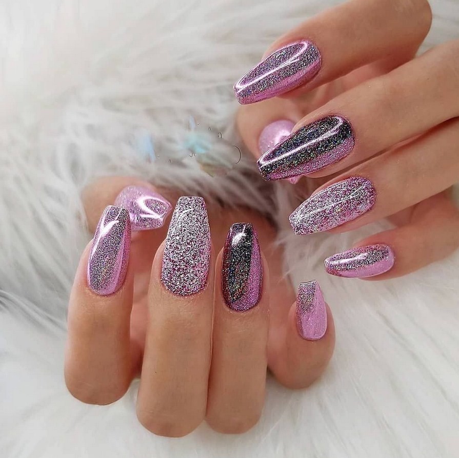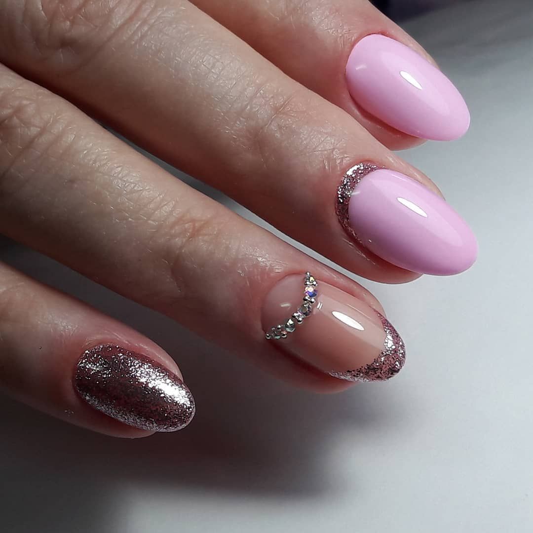 Розовый лак лучше всего сочетается с глиттером серебристого и золотистого оттенков, причём такой дизайн отлично подойдёт для любого праздника.