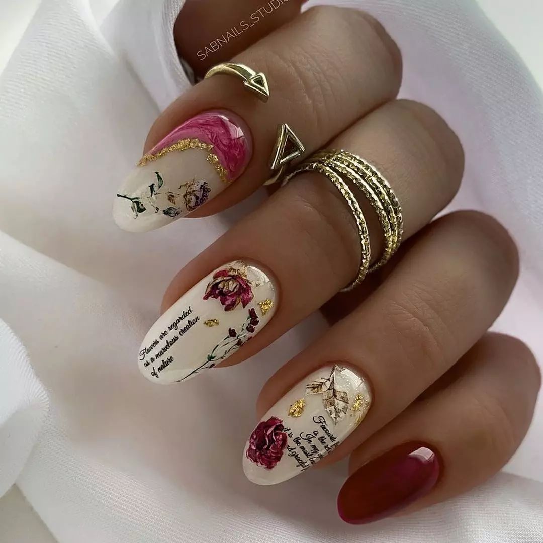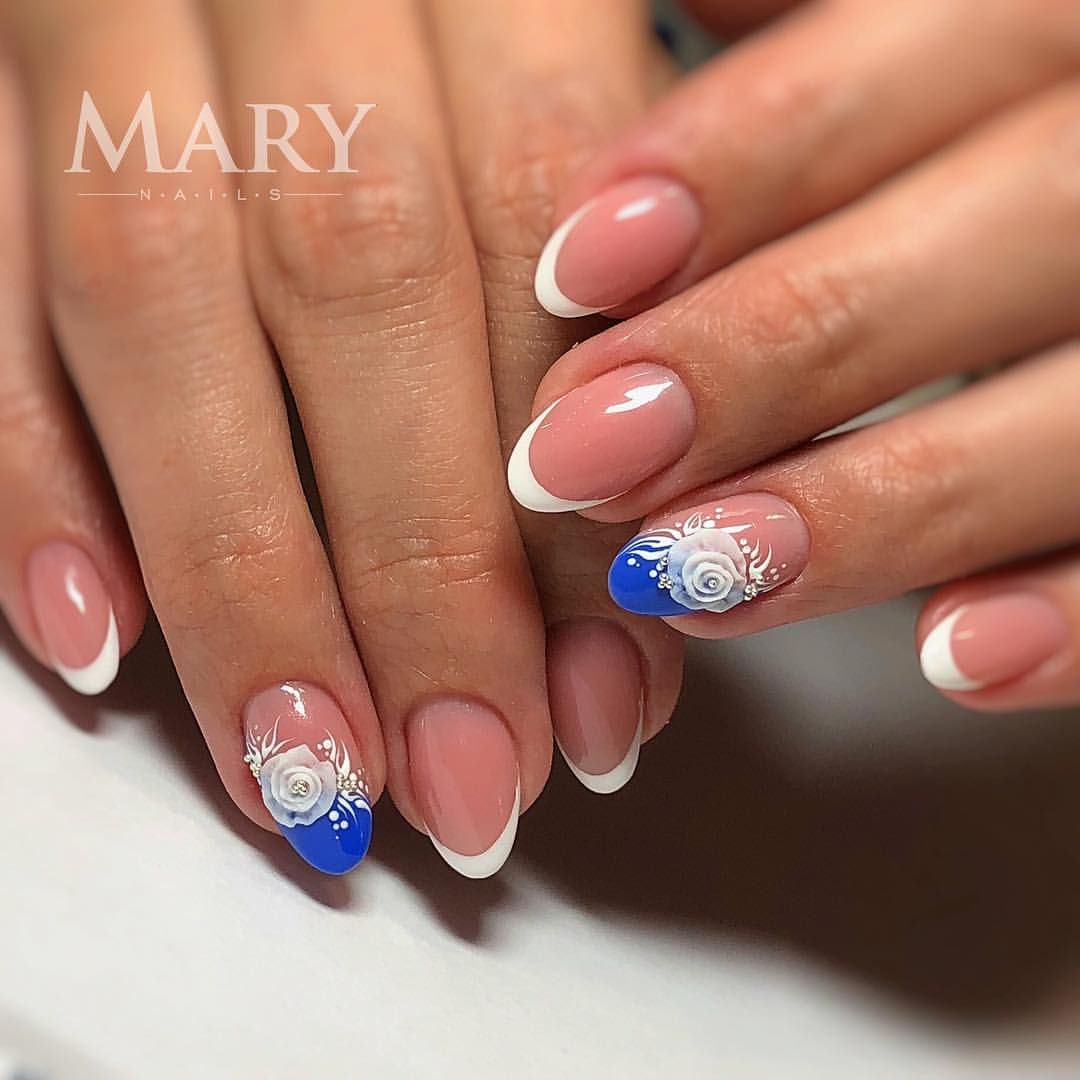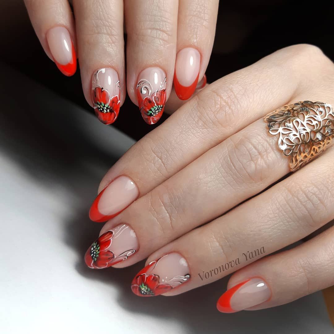 Здесь речь идет не просто о френче, дополненным рисунком, а о дизайне самого кончика нейл-артом, благодаря которому маникюр с рисунком и будет напоминать френч. Чаще всего в подобном варианте френча используется флористическая тематика, новинкой стали узоры напоминающие морские волны и необычные абстрактные наброски.