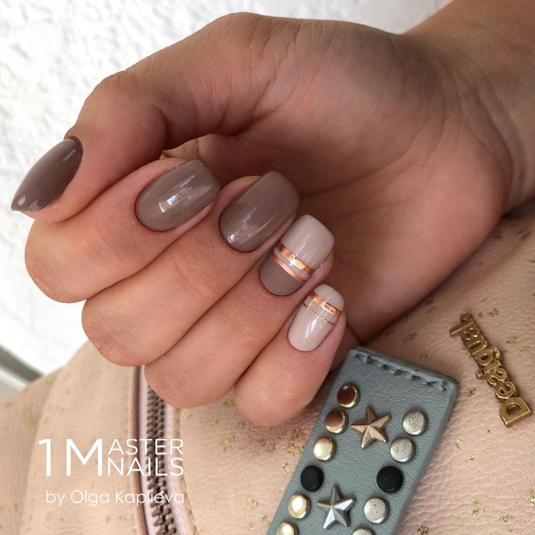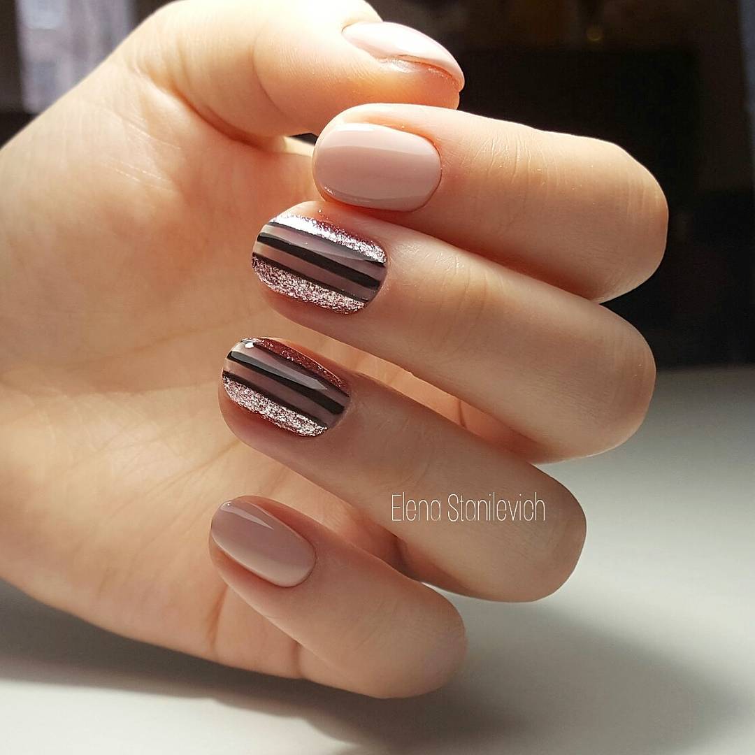 Подобный минималистичный нейл-арт хорошо сочетается с офисными нарядами строгого покроя серых, черных, темно-синих тонов.