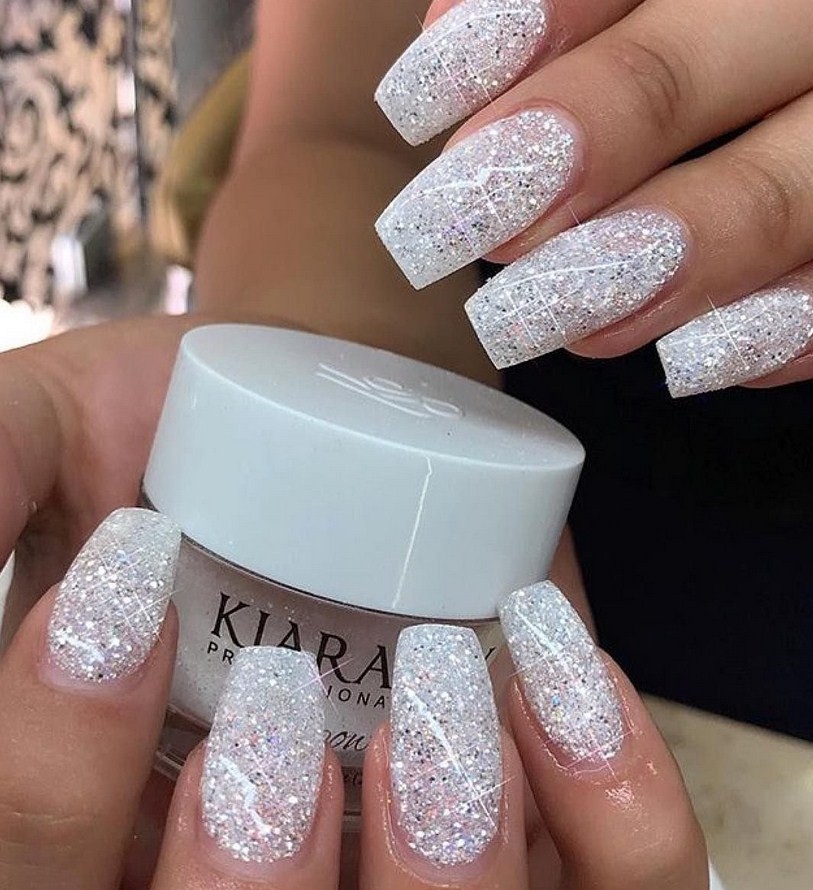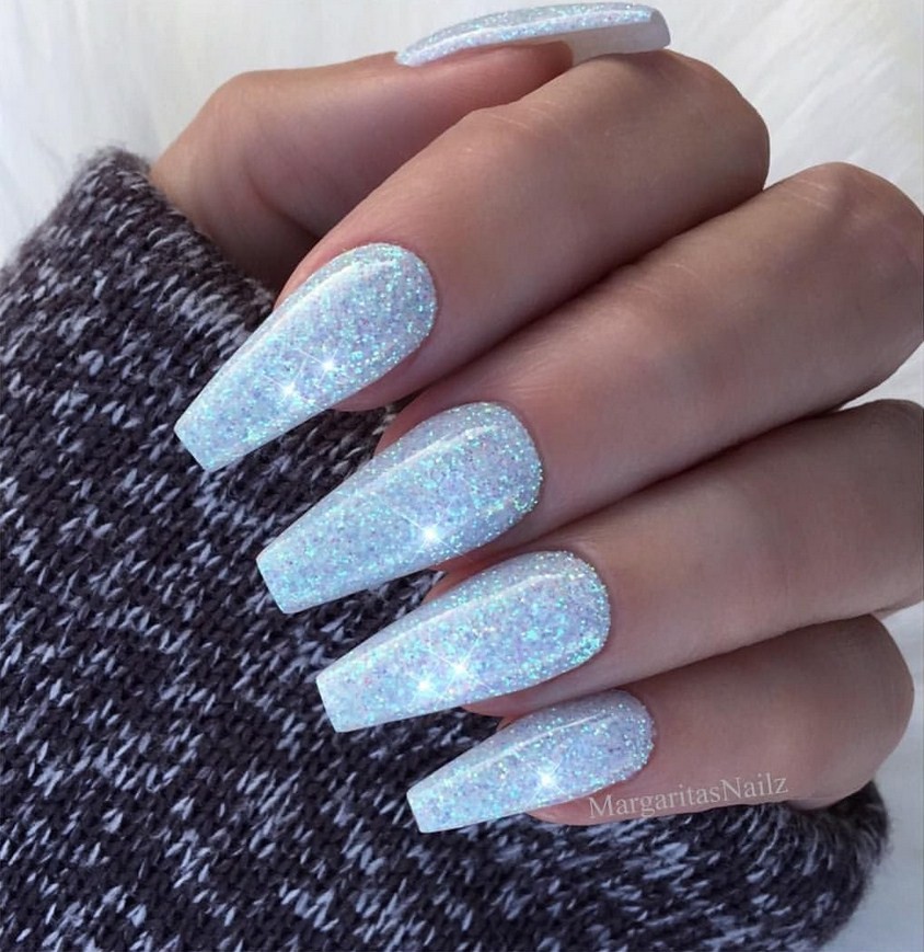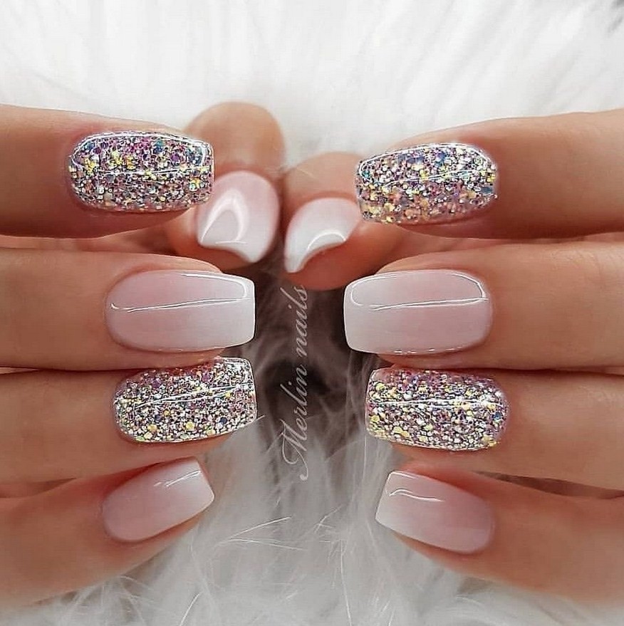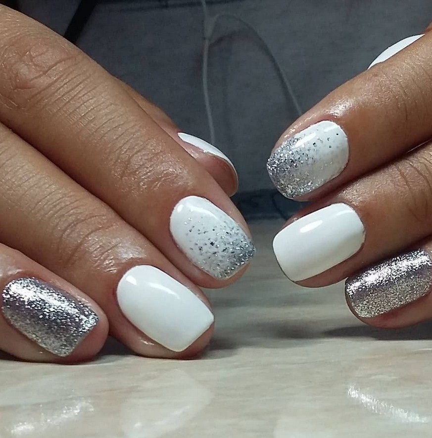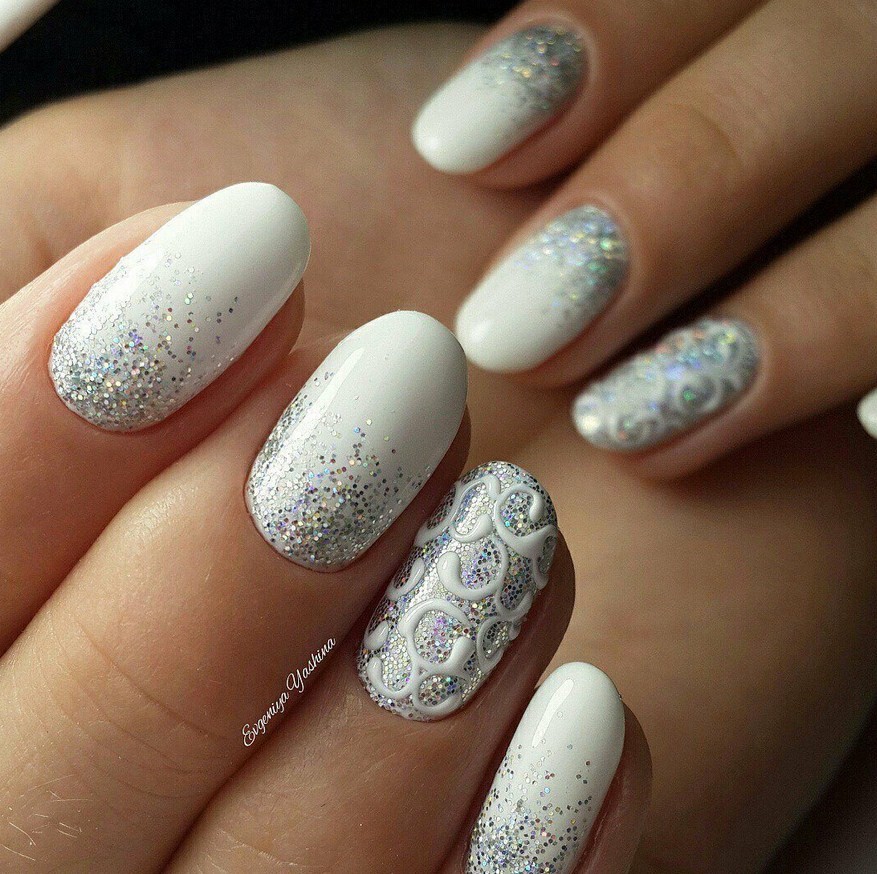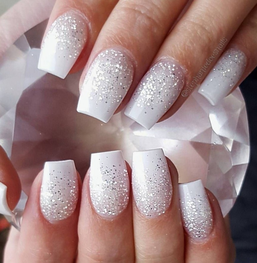 Блёстки на ногтях белого цвета выглядят необычно, нежно и романтично. Особенно удачной будет комбинация с мерцающей пудрой на кончиках ноготков и вариант френча с глиттером.