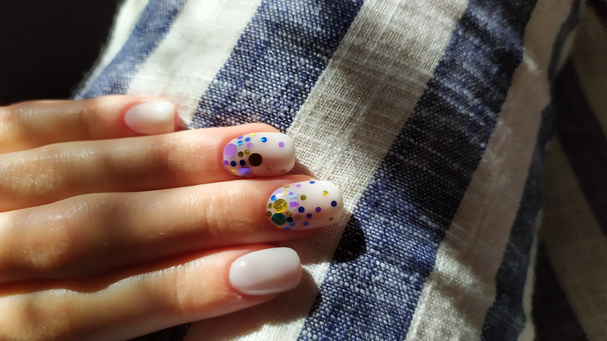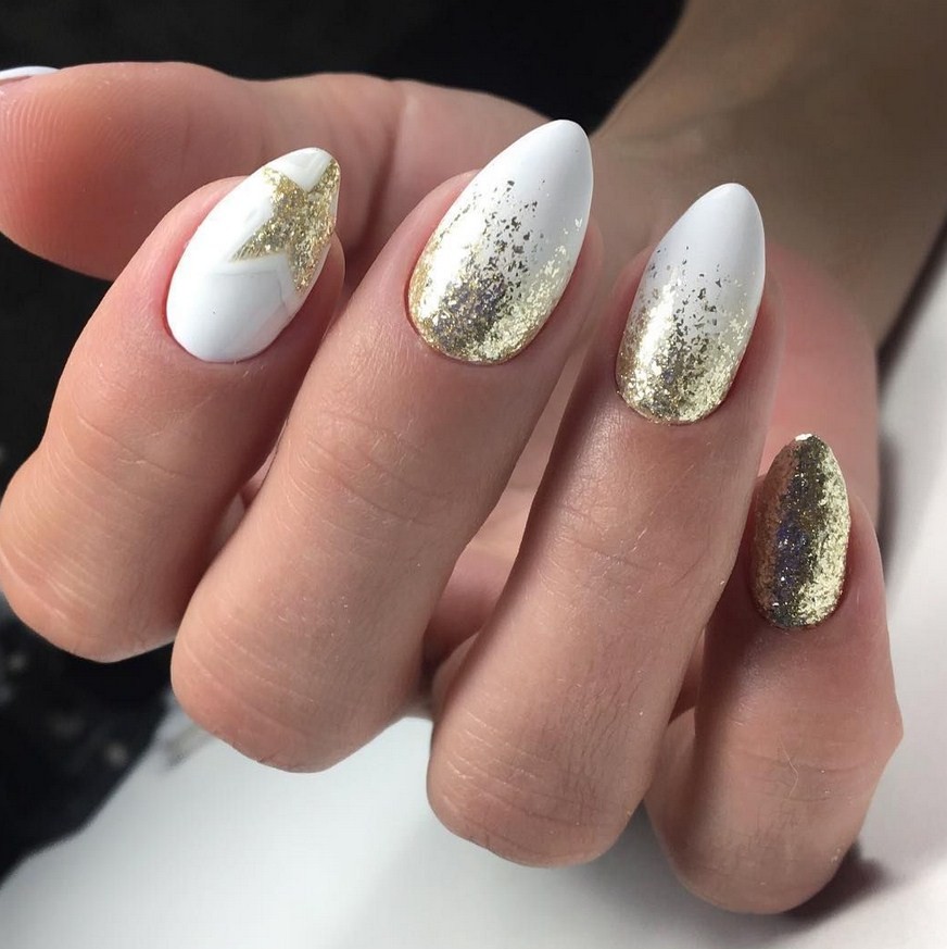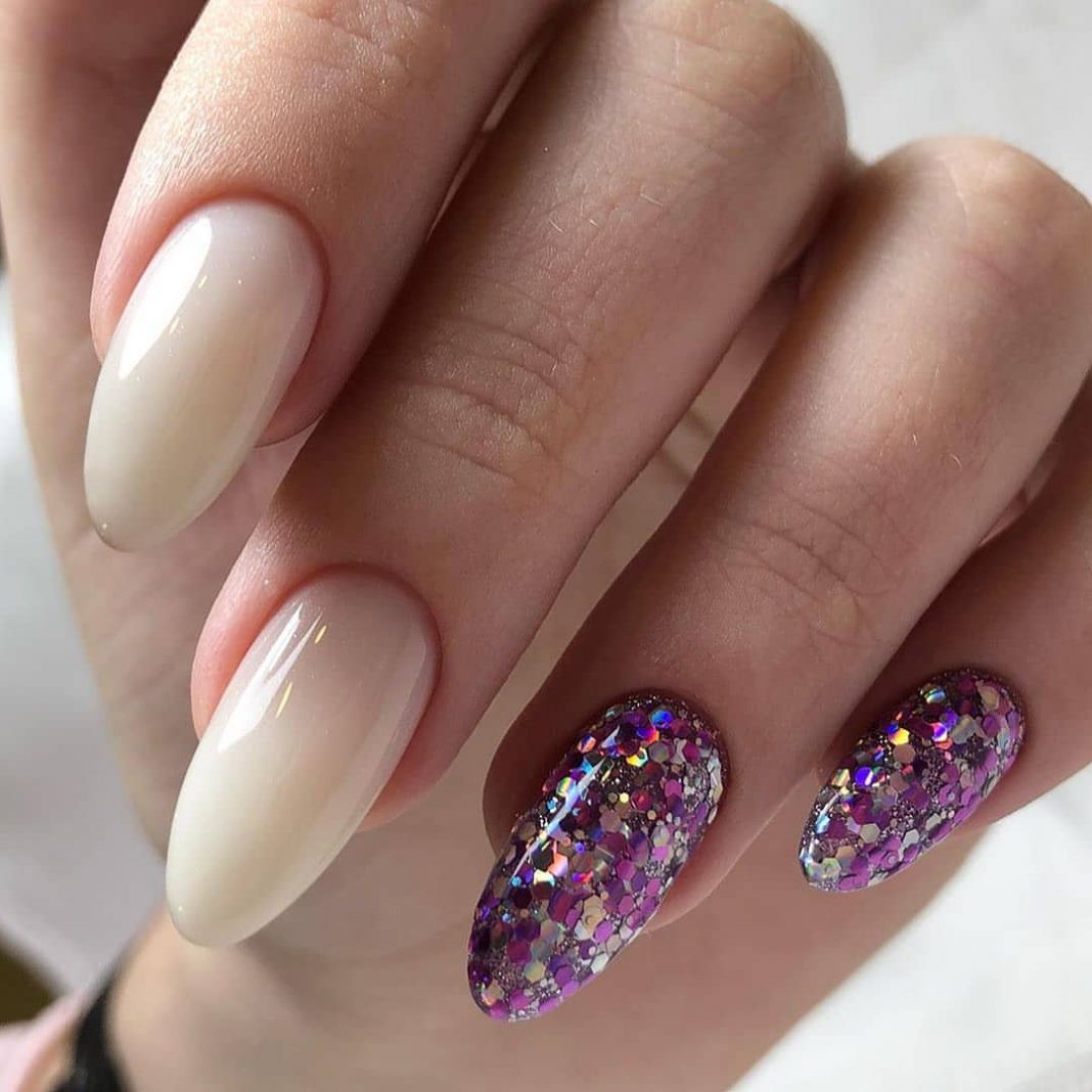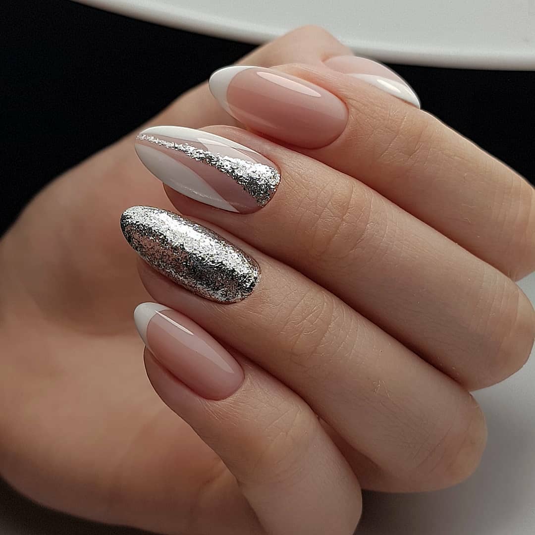 Блёстки на ногтях белого цвета выглядят необычно, нежно и романтично. Особенно удачной будет комбинация с мерцающей пудрой на кончиках ноготков и вариант френча с глиттером.