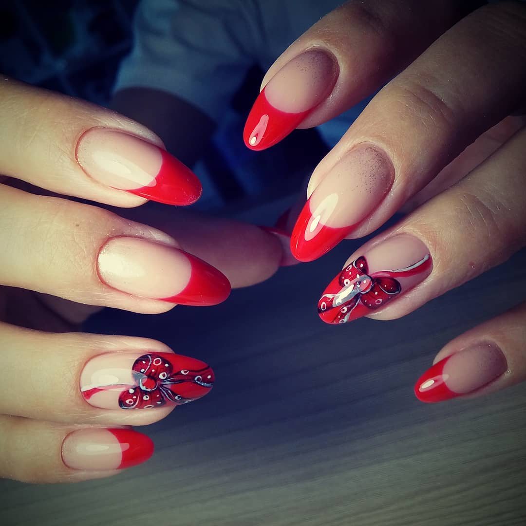 Очень красиво и празднично смотрится френч на длинных миндалевидных ноготках.