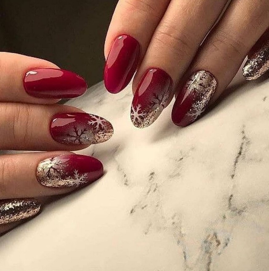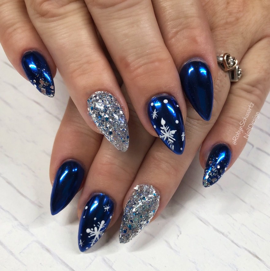 Также, довольно популярный тренд этого Новогоднего сезона — это серебро на ногтях. Причем, тоже как в чистом виде, так и в сочетании с разными цветами гель-лаков. И чем больше серебряного цвета на ваших ноготках, тем более крутым и модным будет считаться ваш дизайн. Ноготки полностью стального блестящего цвета будут выглядеть очень эффектно, ярко и точно выделят вас из толпы.