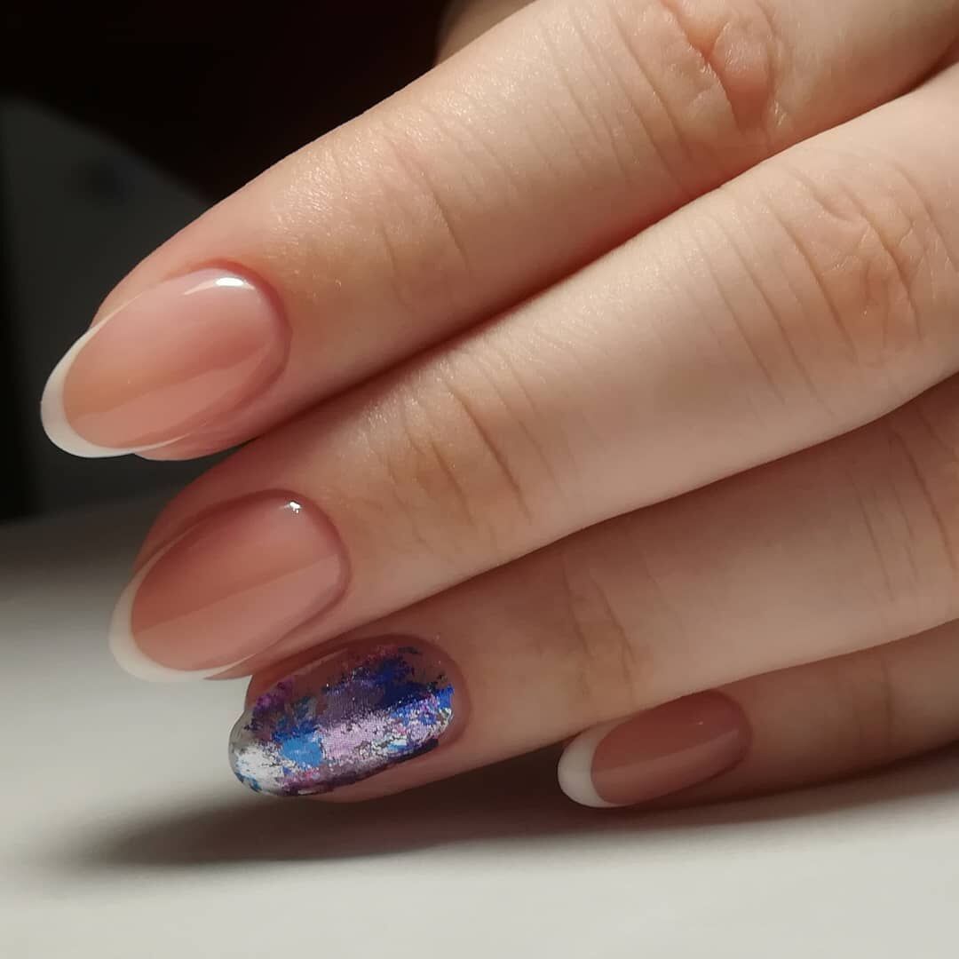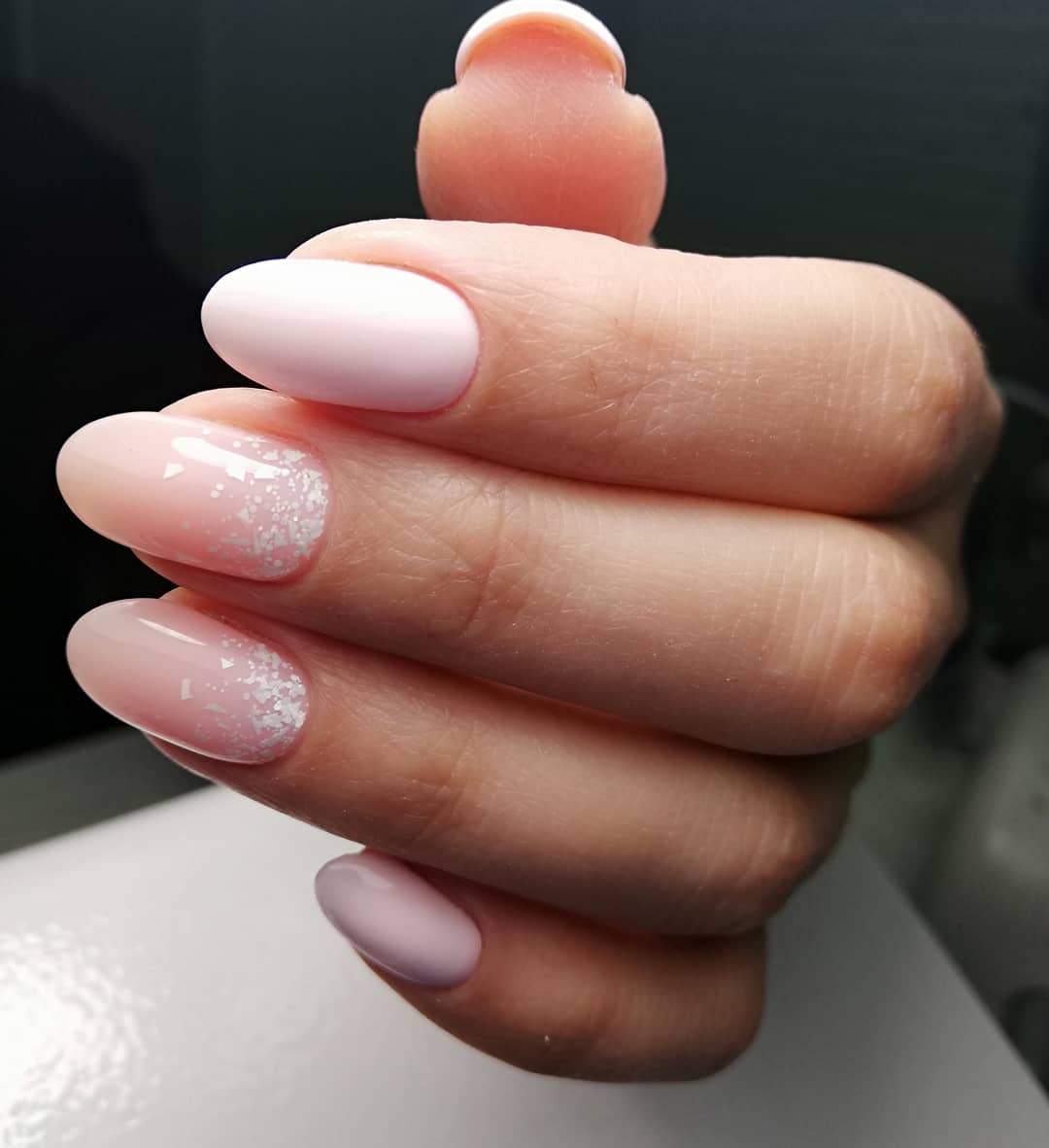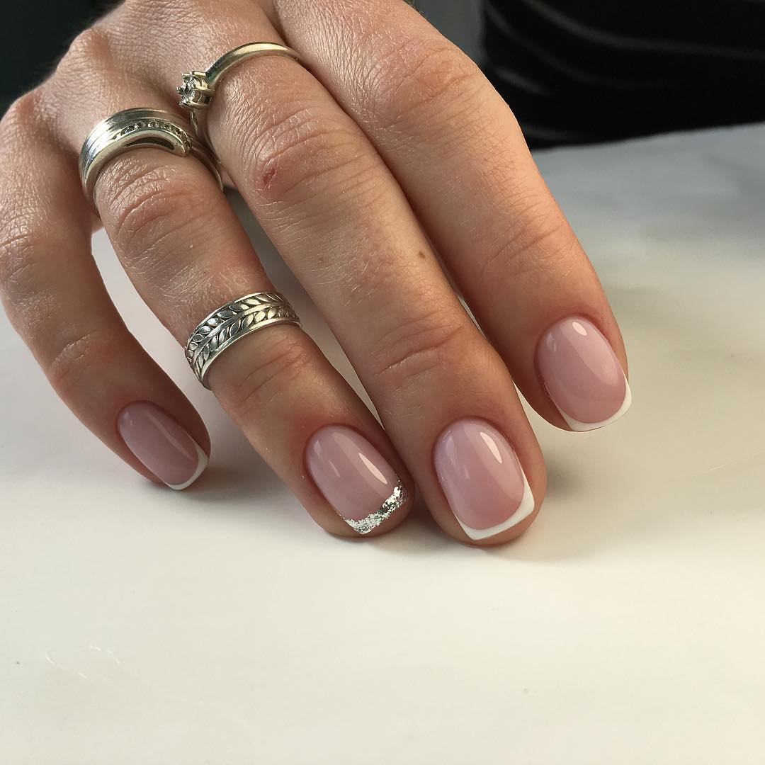 - Если у вас короткие ногти, то рекомендуется использовать сдержанные цвета и оттенки — например, белый, телесный, розовый, светло-синий, молочный, бежевый и другие. Линия «улыбки» должна быть тонкой, а блестящими втирками рекомендуется покрывать не более половины ногтевой пластины.