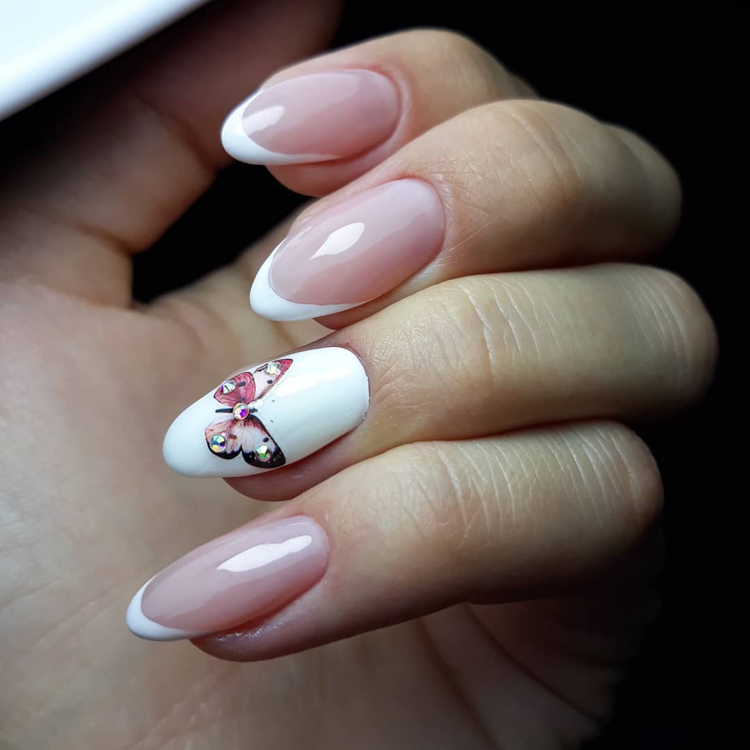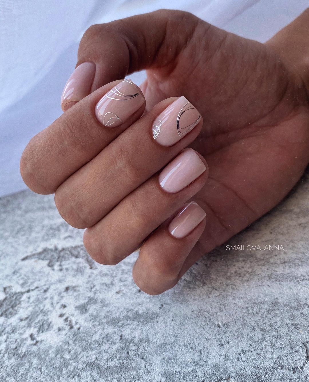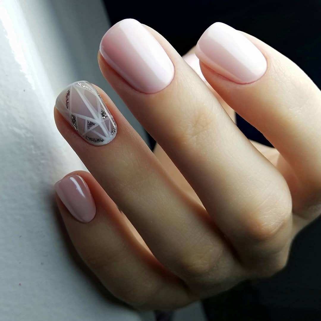 - Если у вас короткие ногти, то рекомендуется использовать сдержанные цвета и оттенки — например, белый, телесный, розовый, светло-синий, молочный, бежевый и другие. Линия «улыбки» должна быть тонкой, а блестящими втирками рекомендуется покрывать не более половины ногтевой пластины.