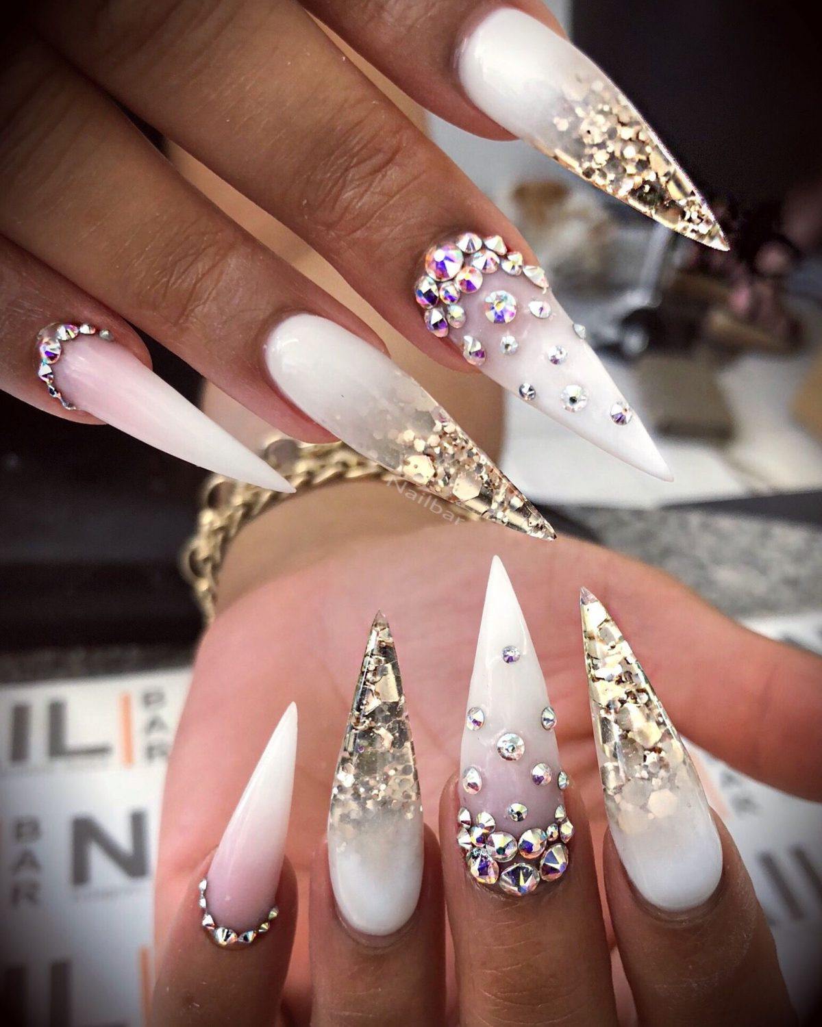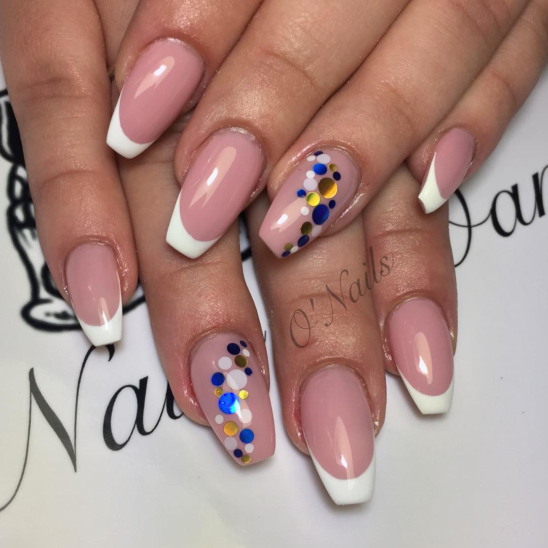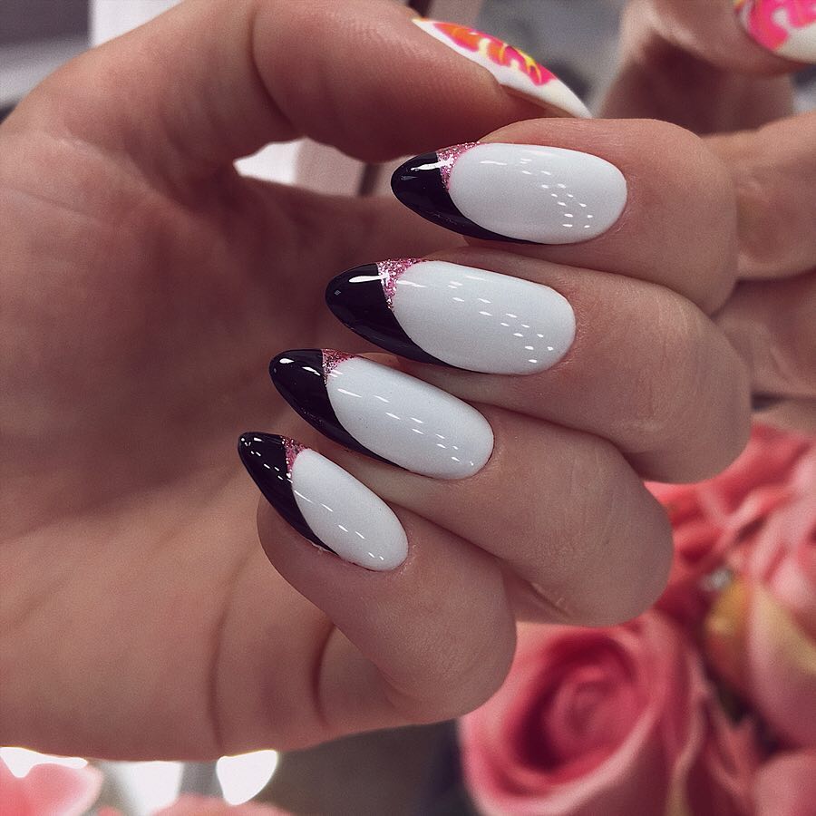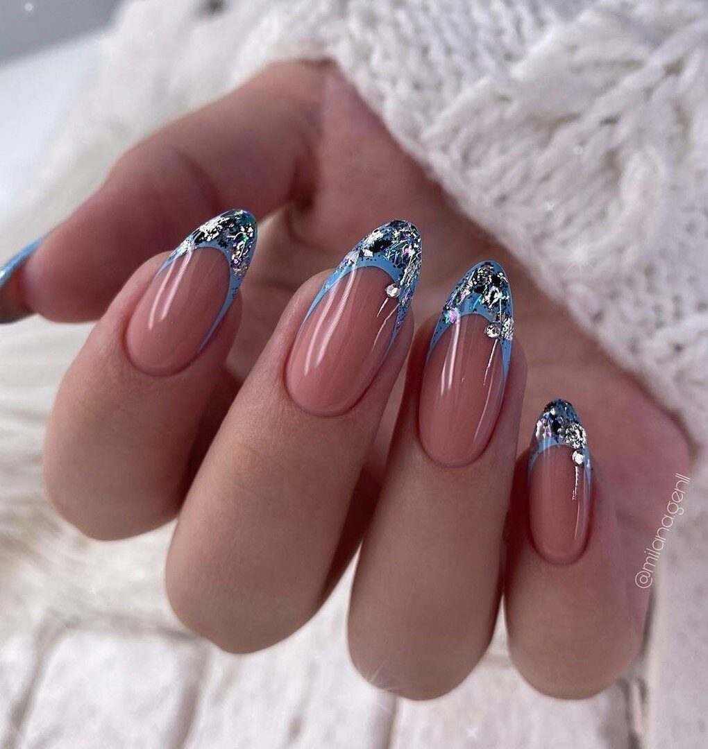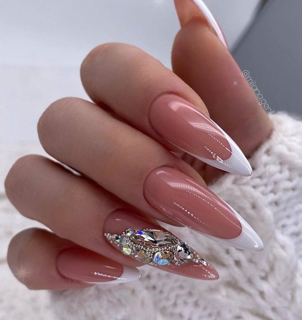 Очень современно и оригинально будет выглядеть блестящий французский маникюр на длинных острых ноготках или на ноготках формы балерина.