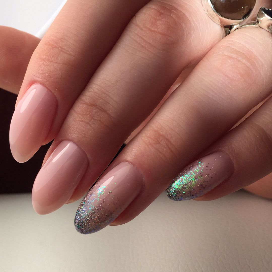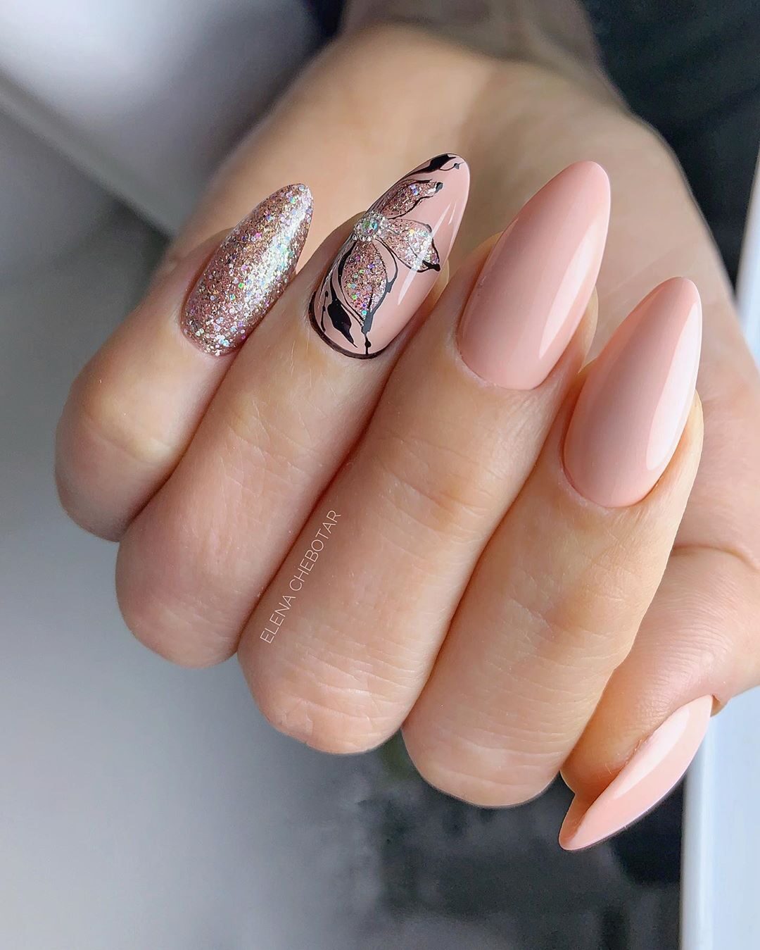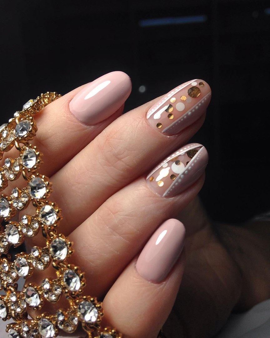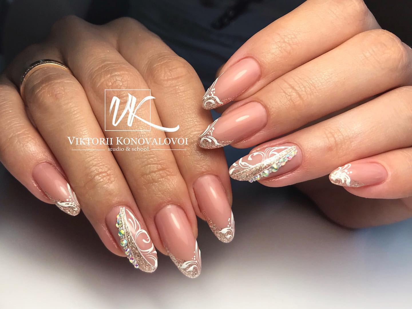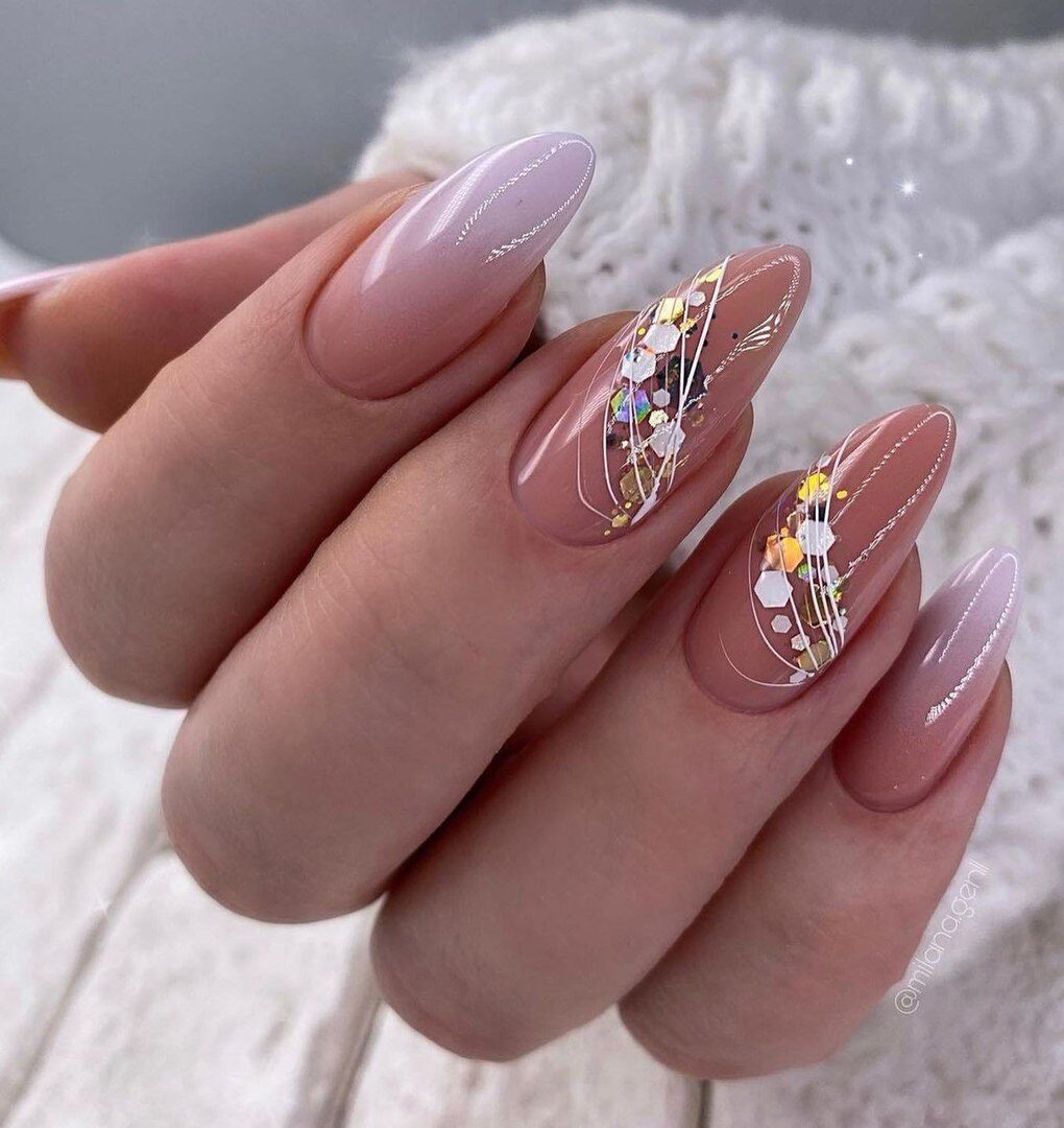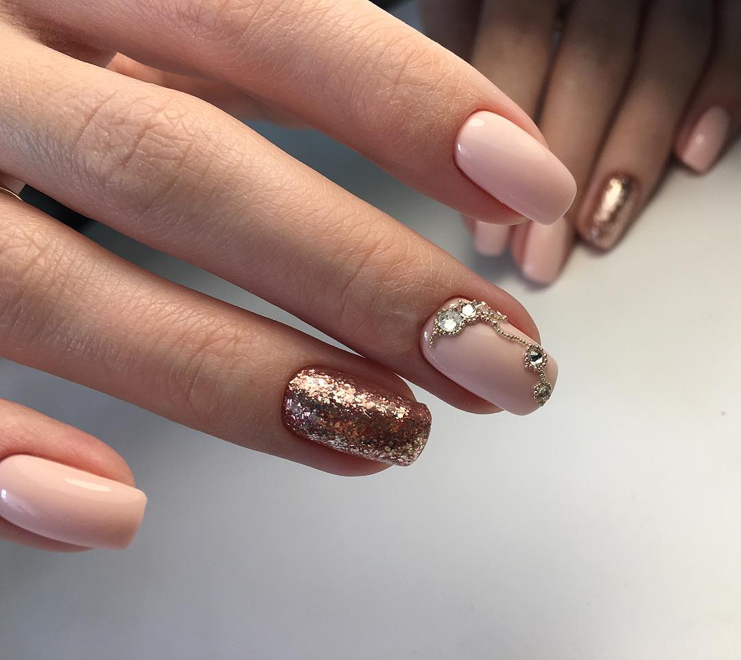 Также, очень празднично и нежно будут смотреться нюдовые ноготки с блестками и рисунками.
