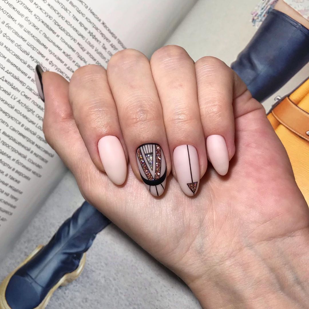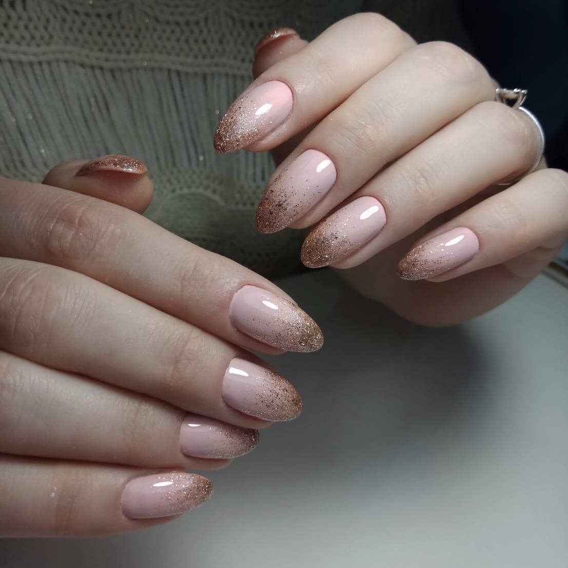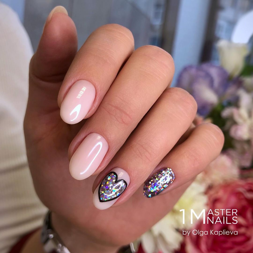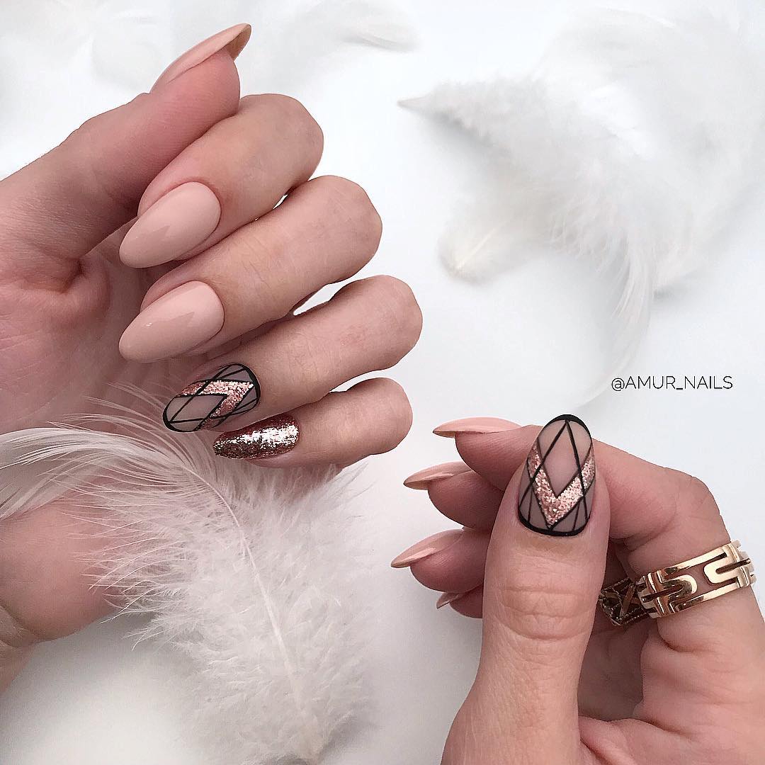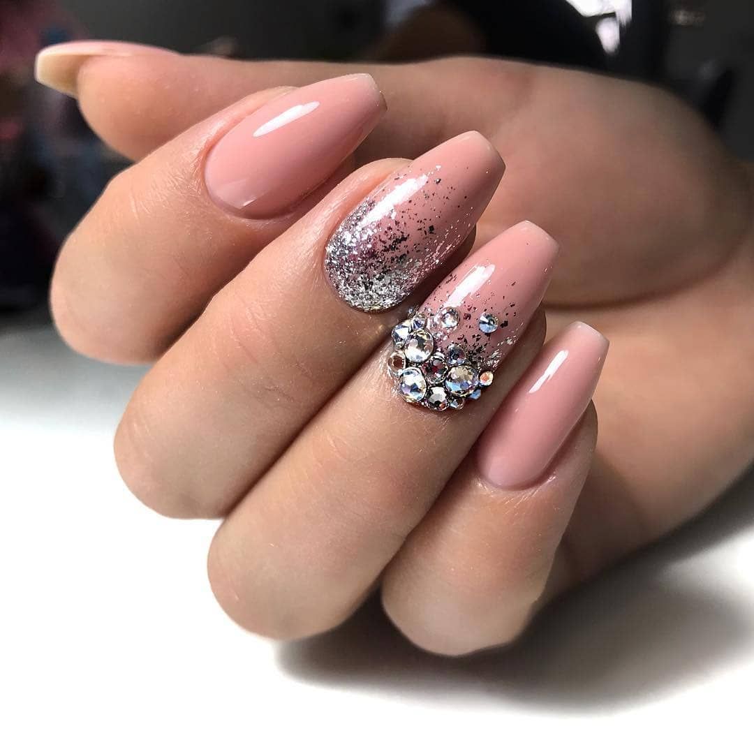 Также, очень празднично и нежно будут смотреться нюдовые ноготки с блестками и рисунками.