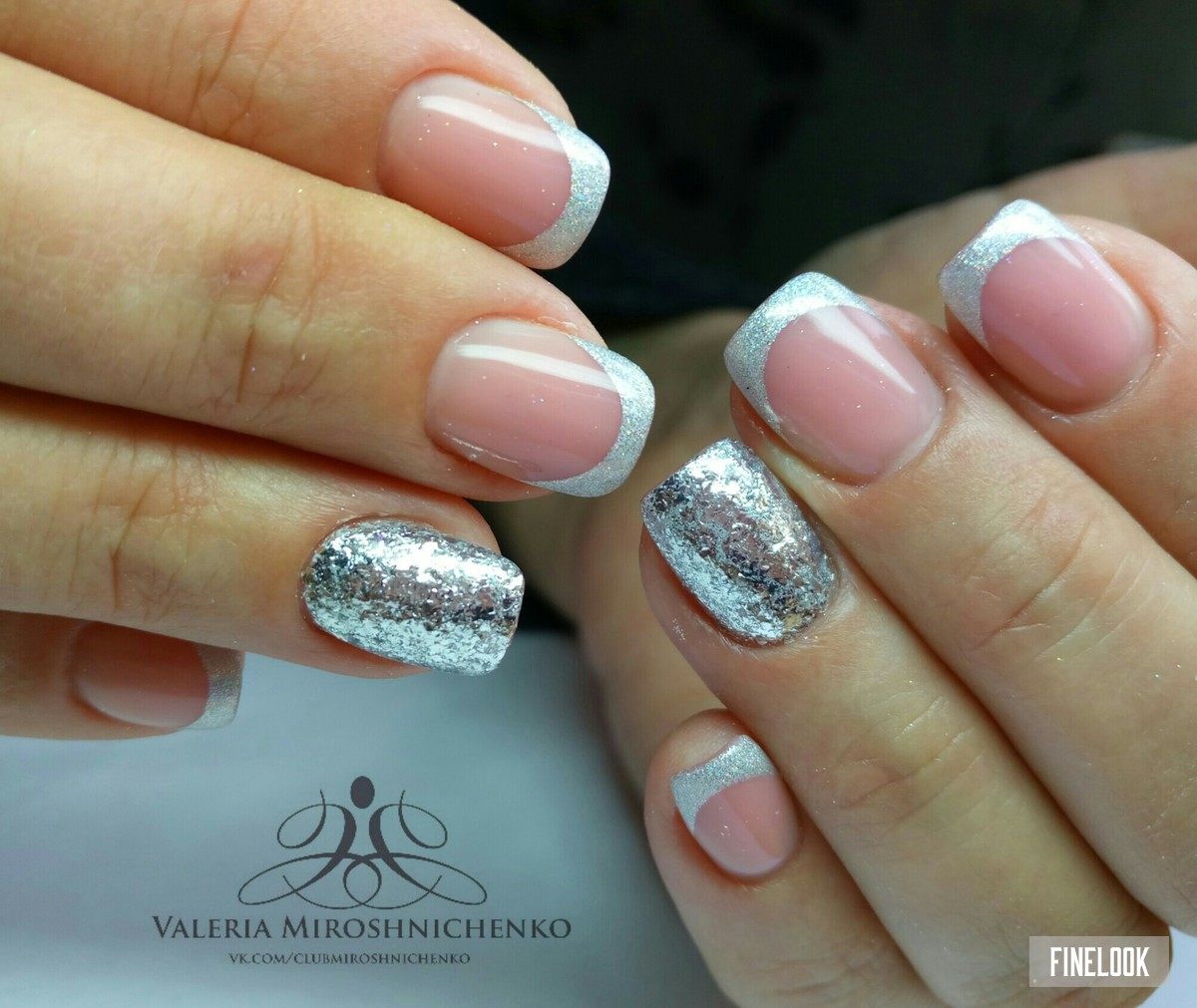 Стильно и празднично будет смотреться серебристый френч на прозрачных или полупрозрачных ноготках. Кроме того, к дизайну можно добавить стразы, рисунки снежинок или гель паутинку.