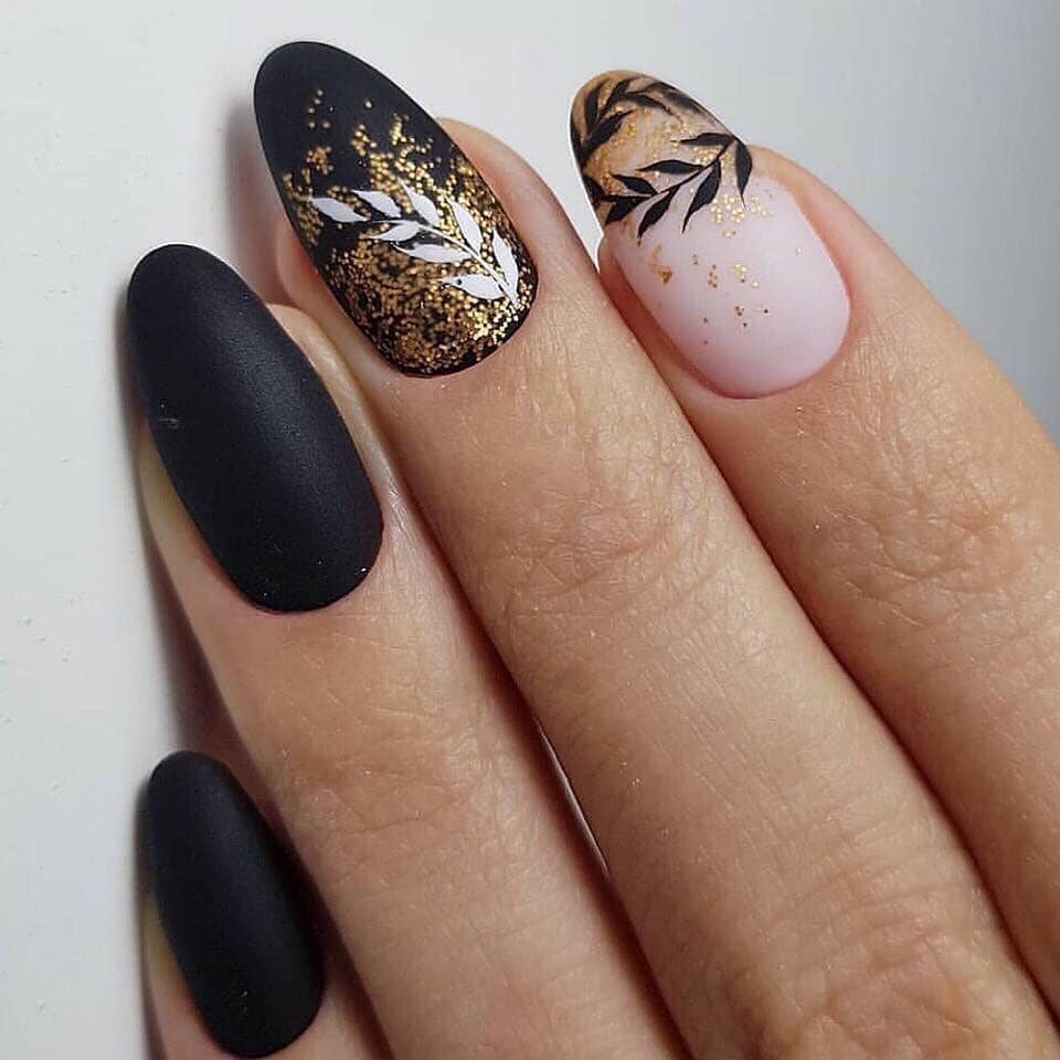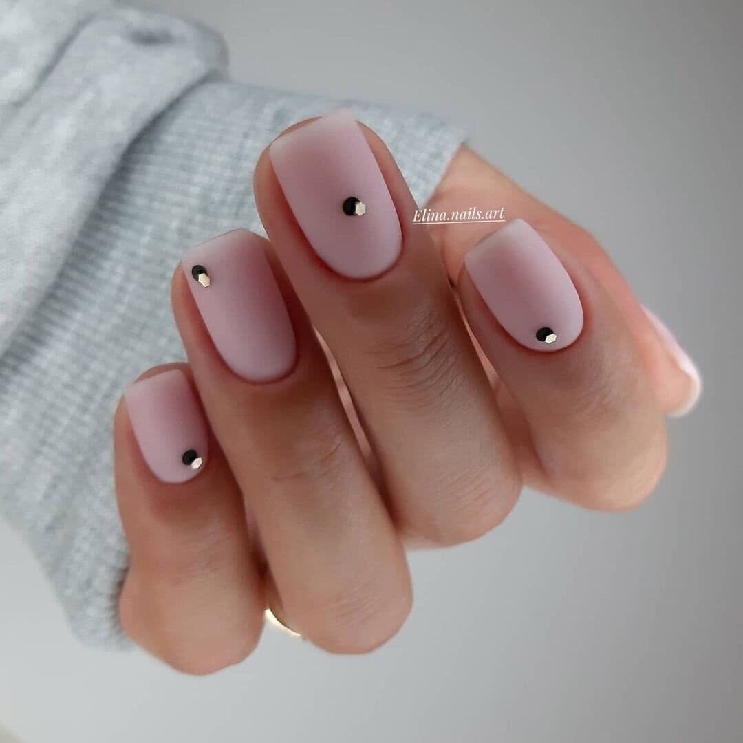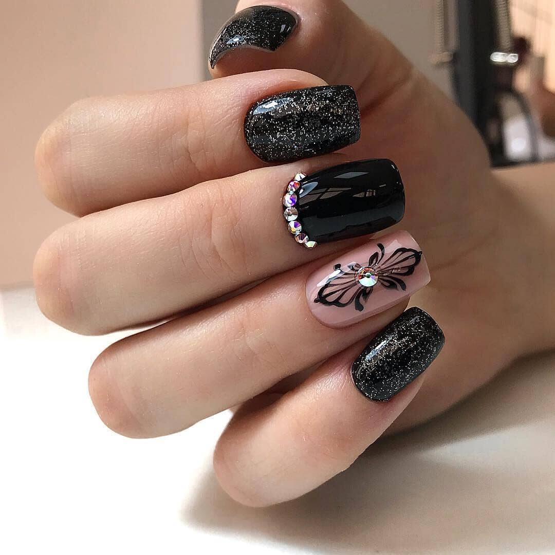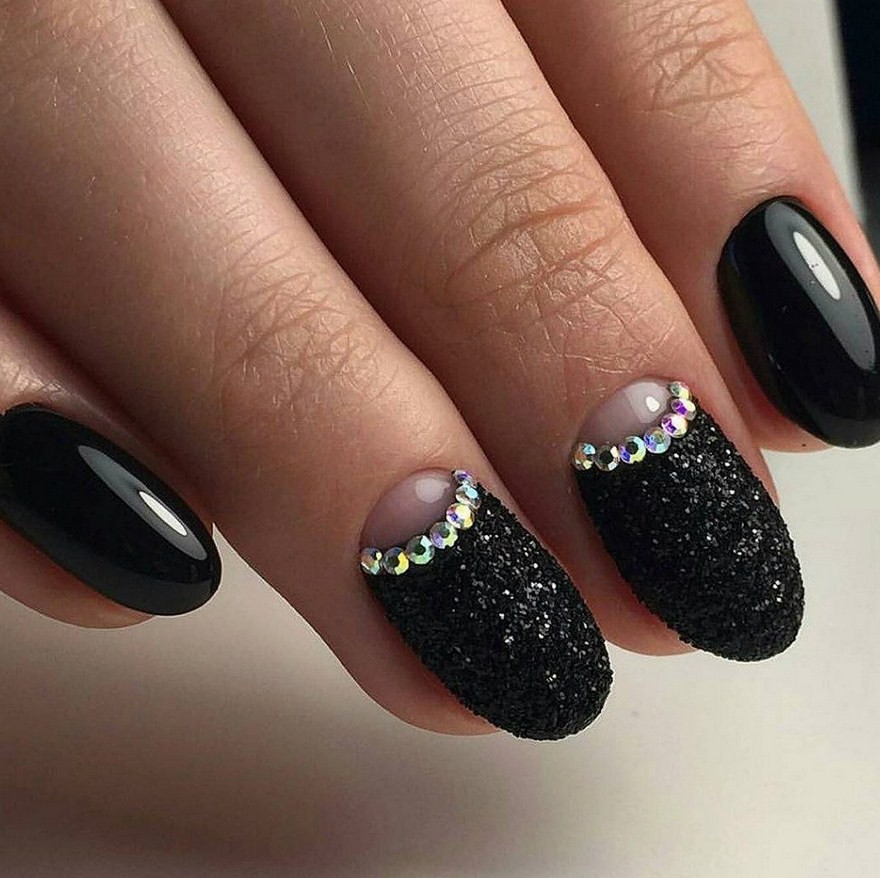 Эффектный черный дизайн с матовым покрытием и стразами – беспроигрышная идея для вечернего лука.