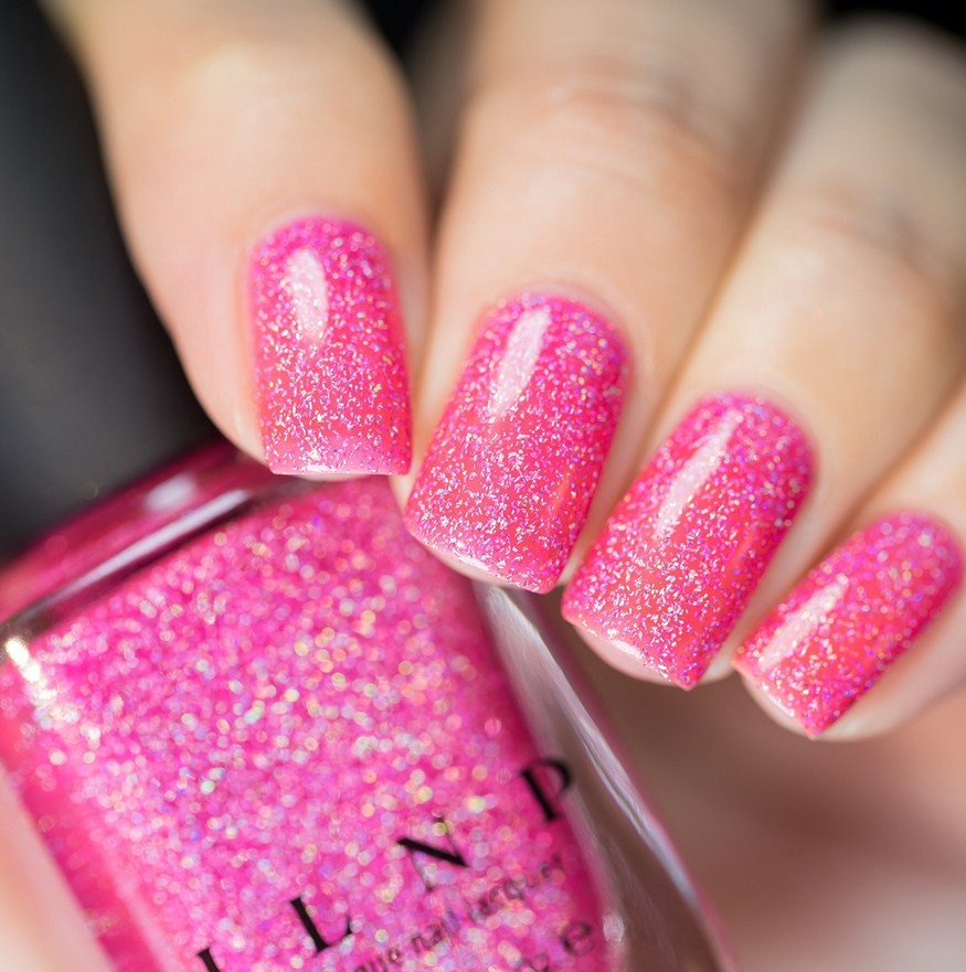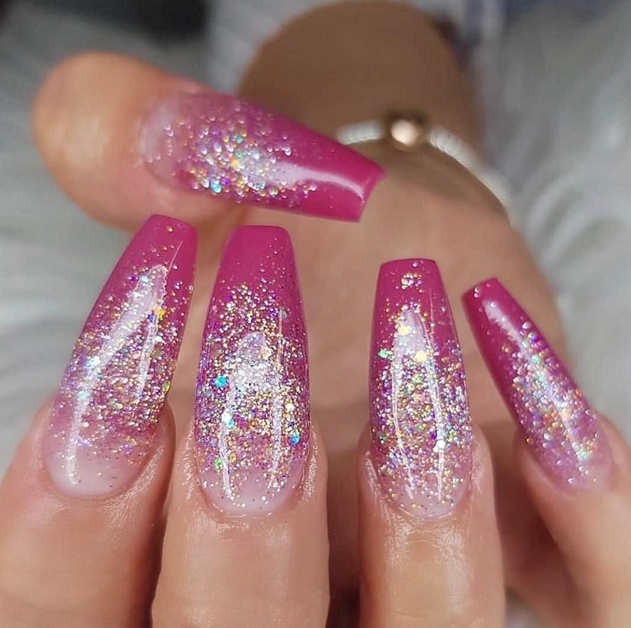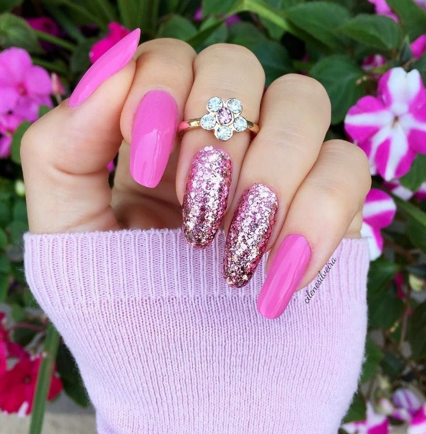 Существует огромное количество оттенков розового цвета – от нежных, пастельных до ярких, кислотных. Все они прекрасно дополняются блёстками для создания завораживающего летнего маникюра.