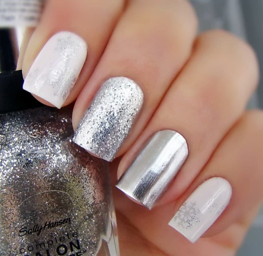 Также, очень эффектно будет смотреться сочетание серебра с нюдовыми матовыми ноготками или с парой белых ноготков. Плюс к этому дизайну, можно смело добавить рисунок снежинки белого или металлического цвета на один или два ногтя.