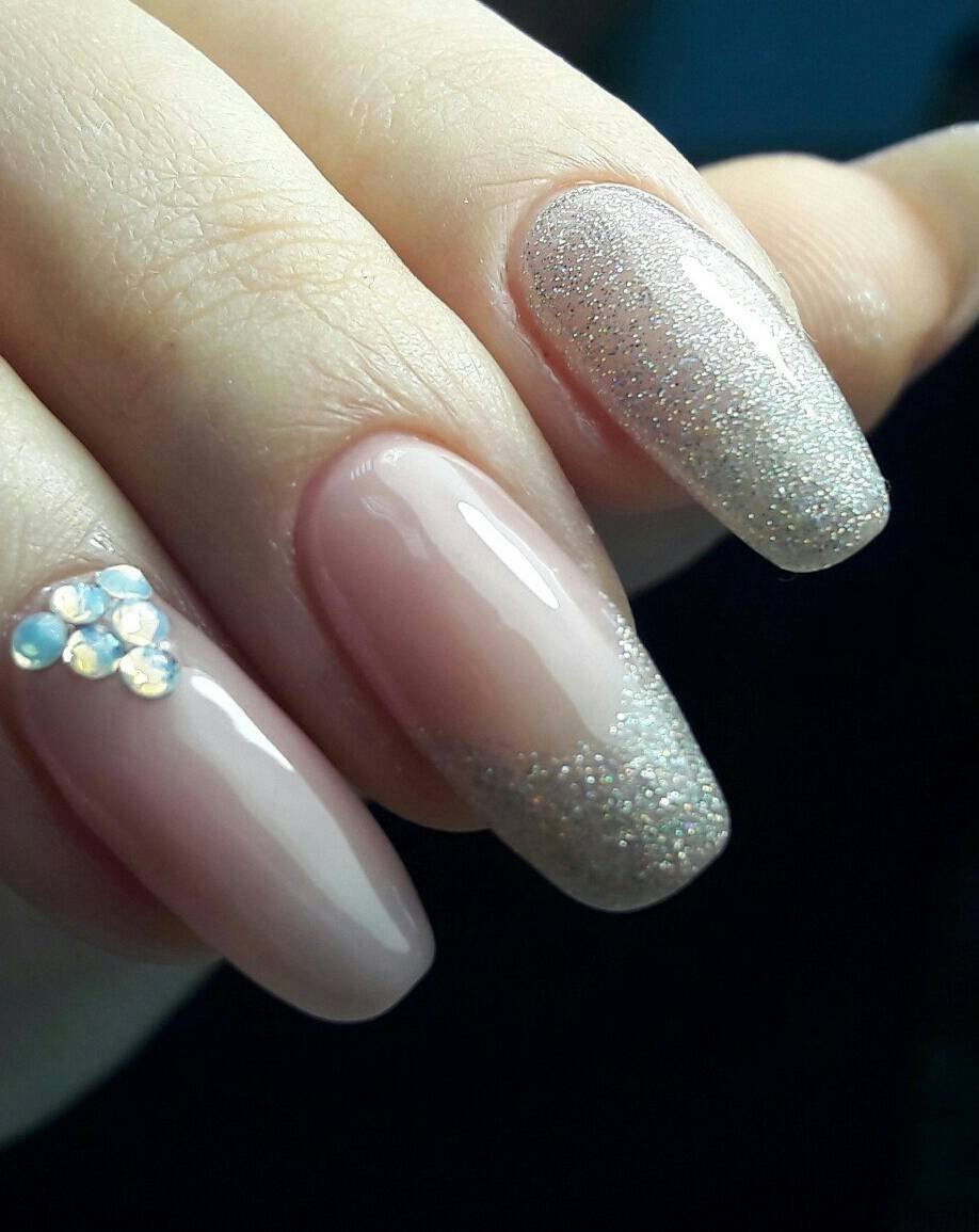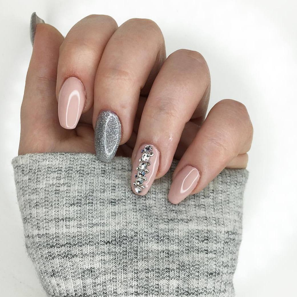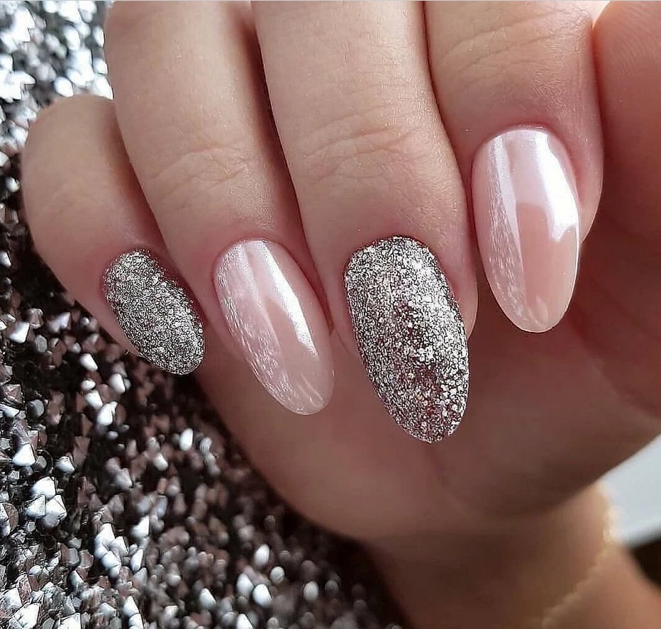 Если хочется чего-то более легкого, то можно полупрозрачные ноготки слегка присыпать серебряными блестками, а один ноготок сделать акцентным, и полностью выложить его такими же блестками. Будет и празднично и легко.