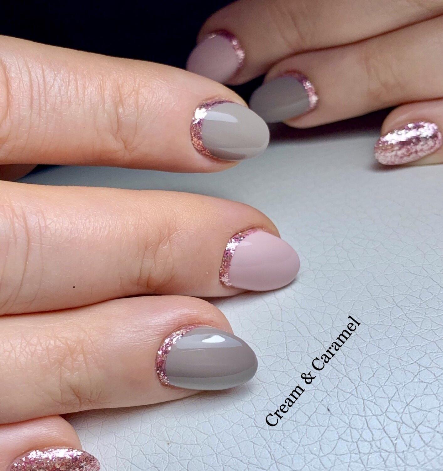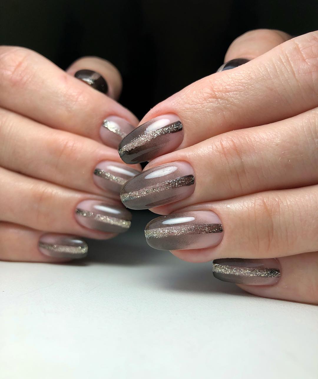 Гель-лак с глиттером используется для прорисовки края ногтевой пластины. Сочетайте глиттер с розовым, бежевым, серым, прозрачным фоном. Технология создания такого френча идентична цветному маникюру. Используйте для декора классические формы «улыбки»: овальную, треугольную.