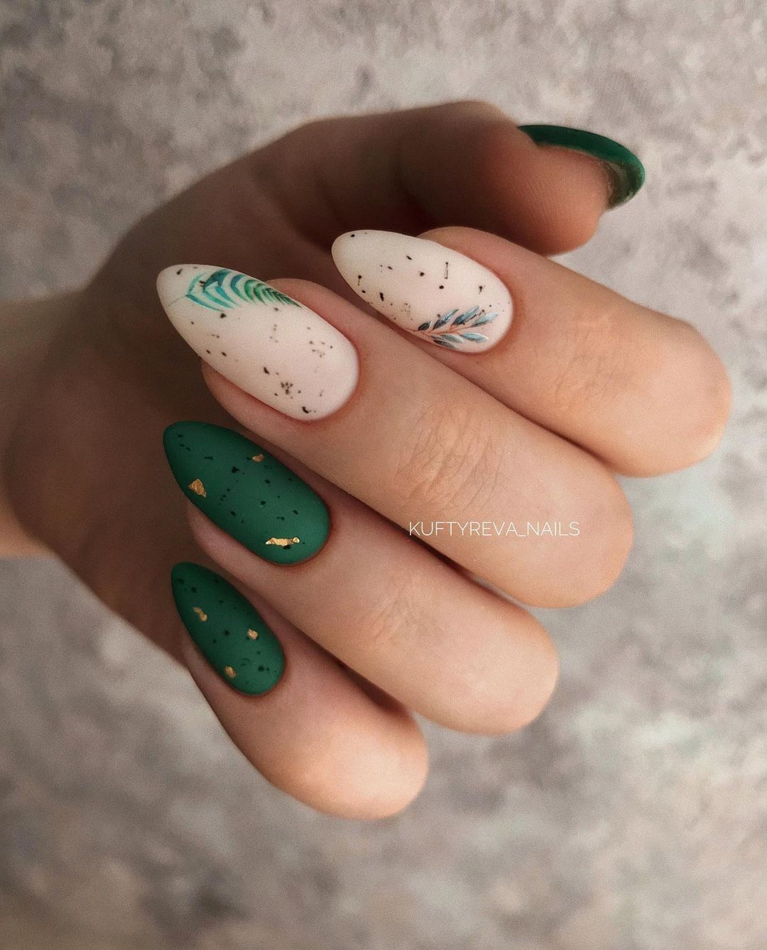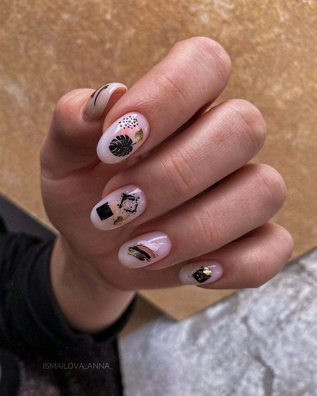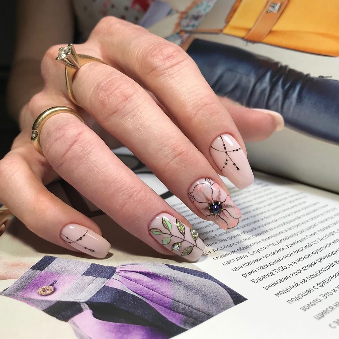 Для создания маникюра подойдут практически любые цвета — от черного окраса до телесных оттенков.