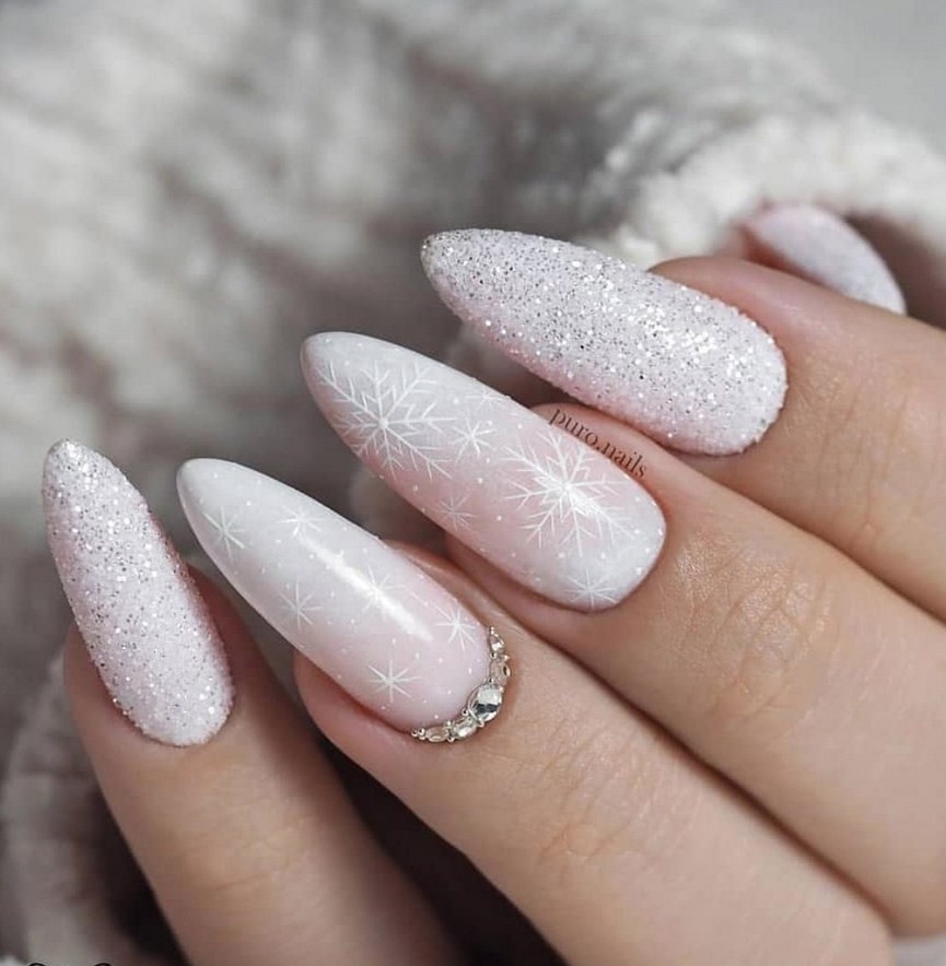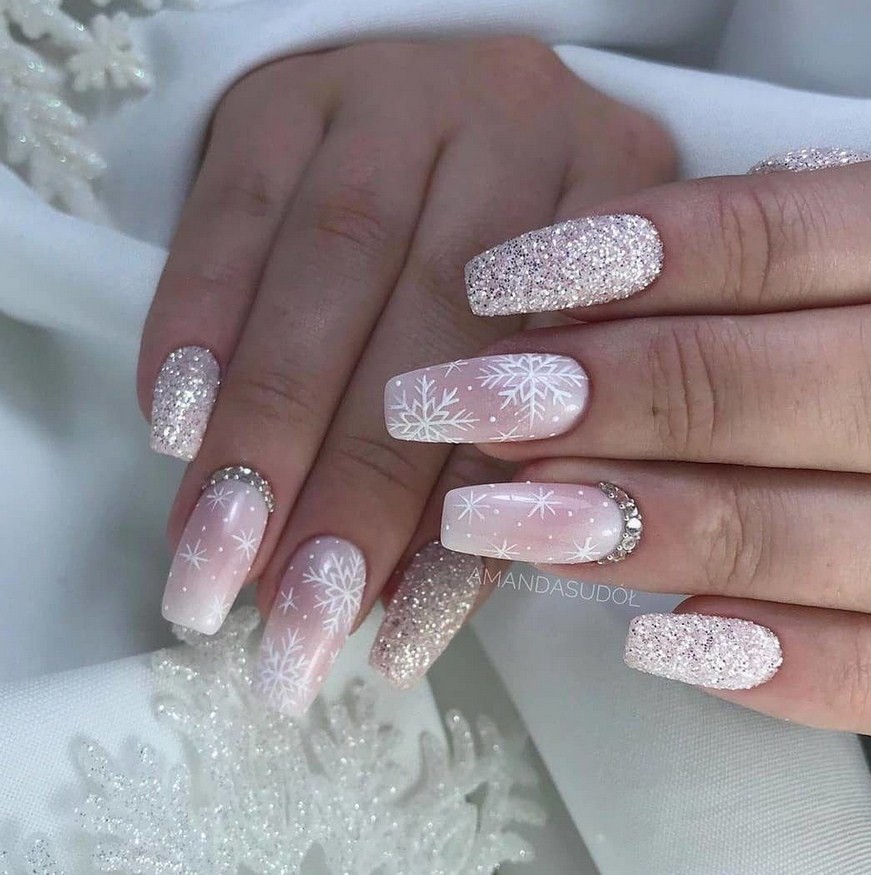 Снежинки отлично комбинируются со стразами и глиттером – так они будут ещё больше напоминать настоящие.