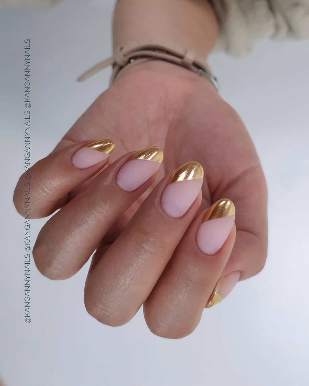 Блестящим рекомендуется сделать только кончик ногтевой пластины, хотя если хотите создать роскошный образ, можете сделать ногтевую пластину полностью блестящей.