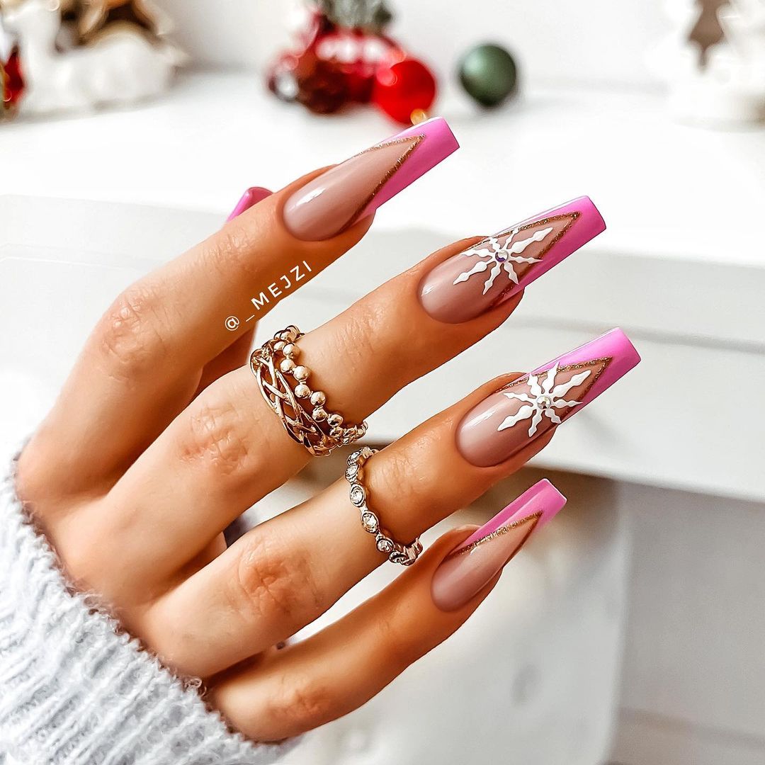 Новогодний маникюр френч со снежинками обладает невероятной притягательностью и изящным видом. Белые или серебристые снежинки делают образ воздушным и нарядным.