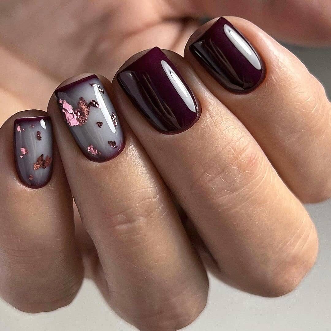 Бордовый френч с блестками – вариант исключительно для торжественного случая. Бордовый – великолепная альтернатива категоричному и порой неуместному черному цвету. Используйте блестки для акцентирования безымянного пальца или мизинца, прорисовывайте с помощью блесток тонкие линии. Для декора бордового маникюра подойдут как классические серебряные блестки, так и золотые. Вместо блесток используйте оттиски фольгой или фольгированные полосы.
