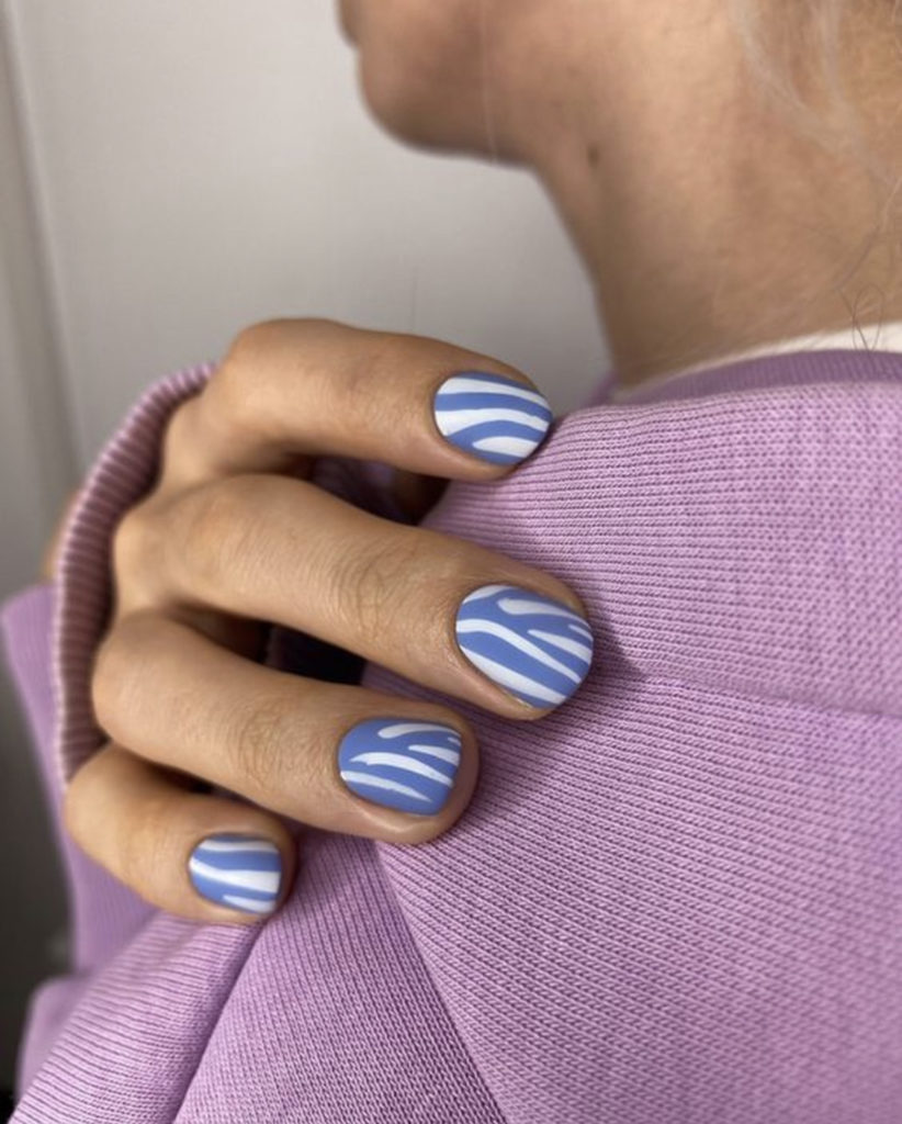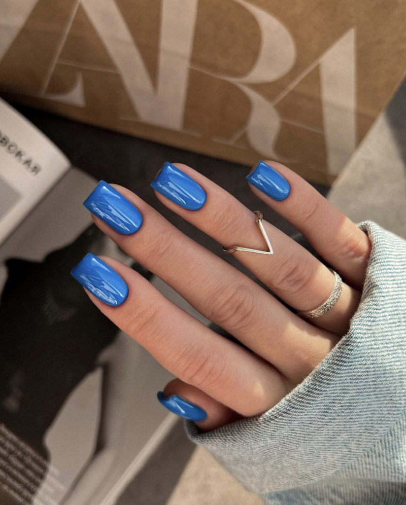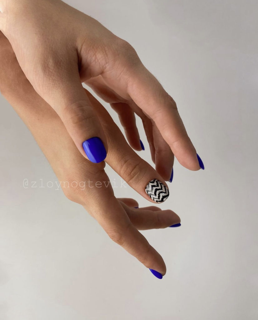 Самый глубокий цвет, комбинируется с белым тоном. Синий оригинально смотрится в маникюре с красным и чёрным. Светло-серый и синий подойдёт для будней и официальных торжеств.