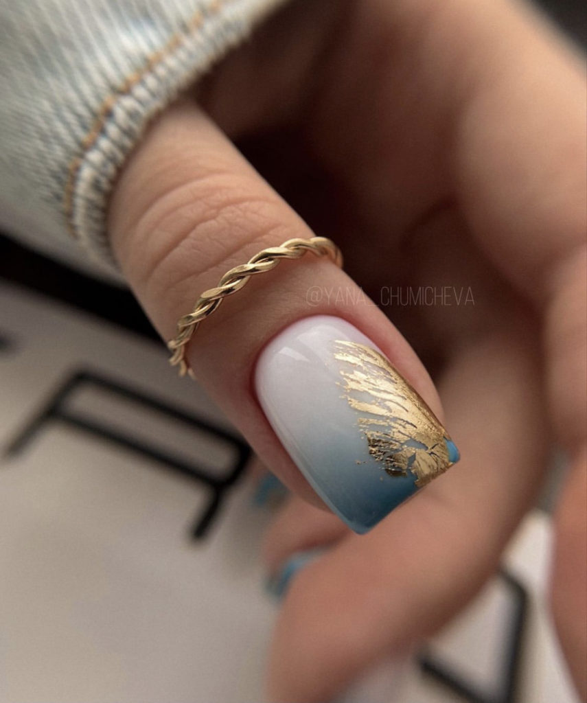 Вот уже на улице тепло и хочется добавить чего-то нежного и светлого в свой образ. Как вам такие нежные и мягкие пастельные оттенки? Небесно-голубой создает спокойную атмосферу. Можно добавить к нейл-арту акцент, сделать это с помощью цветочного узора на одном пальчике.