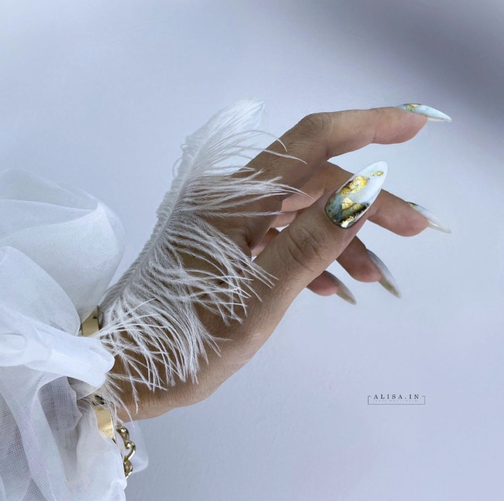 Смесь золота и серебра в каждом ногте – зимний тренд 2024 года. Маникюр принято делать объемным, поэтому можно дополнить его стразами. Чем сложнее дизайн, тем лучше.