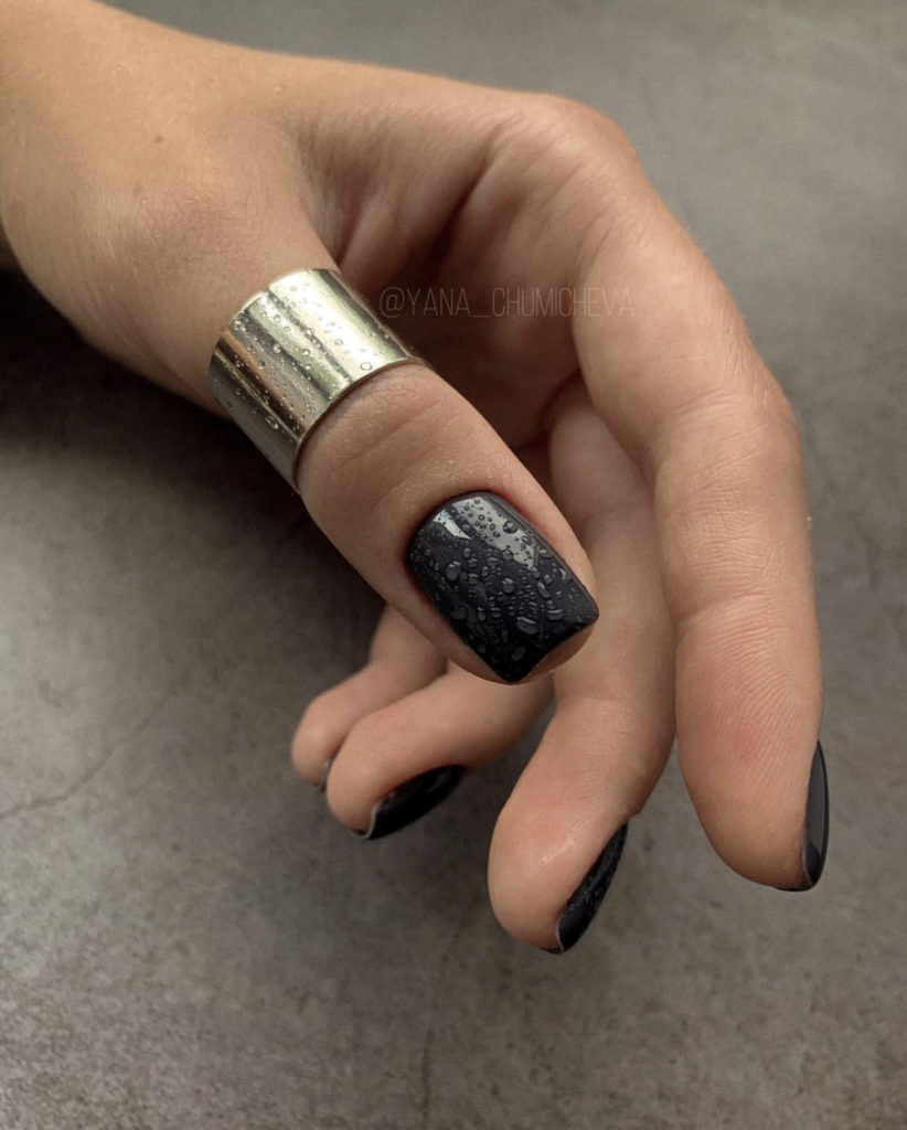 Черные и короткие — это когда простота сочетается с элегантностью. Классический черный маникюр легко подходит и для рабочего дня и для вечернего выхода. Пусть вас не пугает что он темный, на такой длине он смотрится ухоженно и стильно.