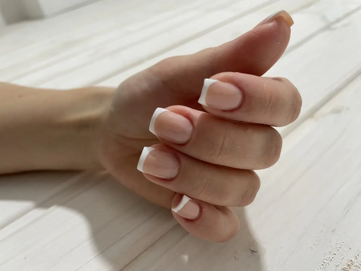 Это один из самых простых и стильных вариантов в стиле «маникюр без маникюра». Ведь дизайн просто повторяет и усиливает эффект натуральных ноготков без покрытия — свободный край пластины белого оттенка, остальная часть ногтя естественного оттенка.