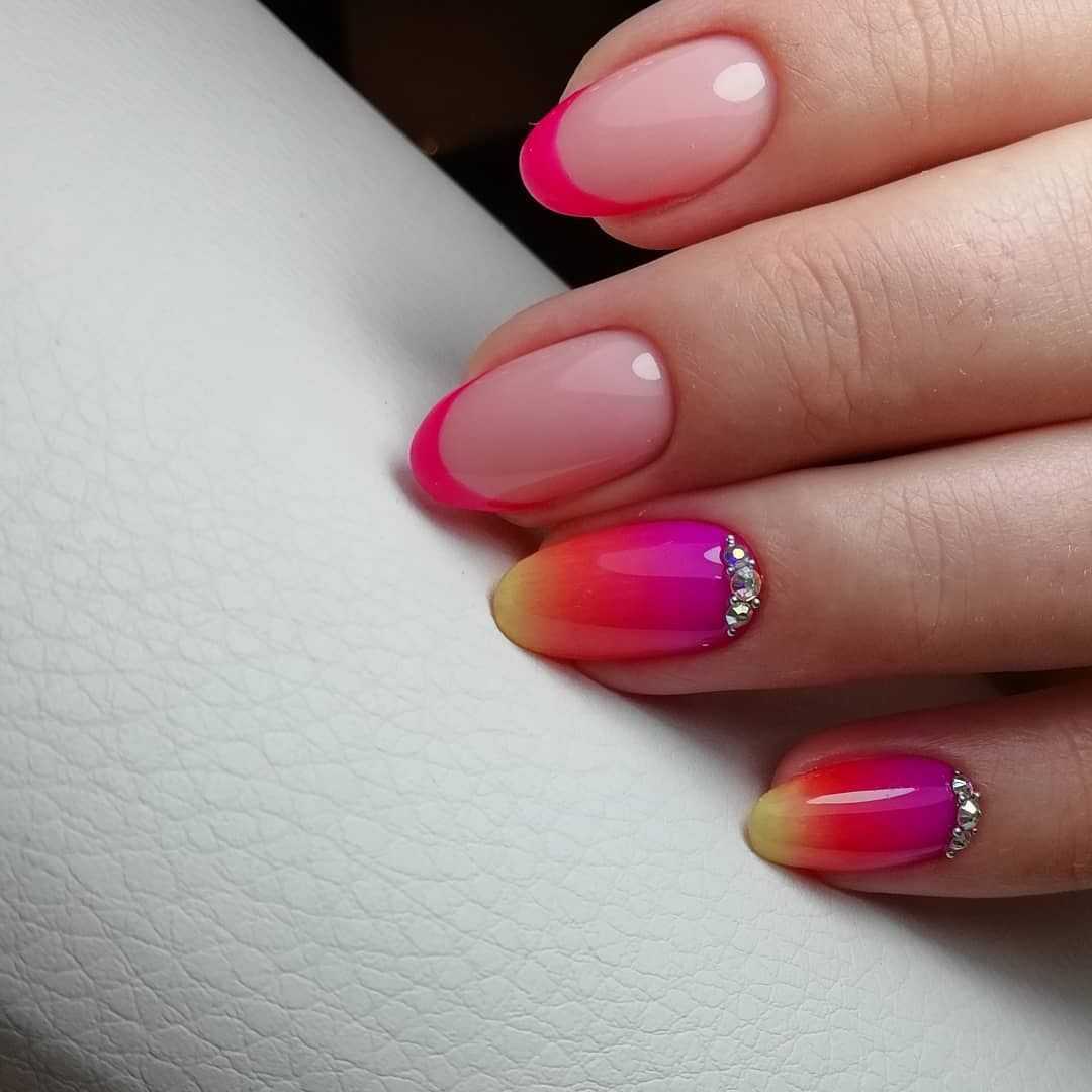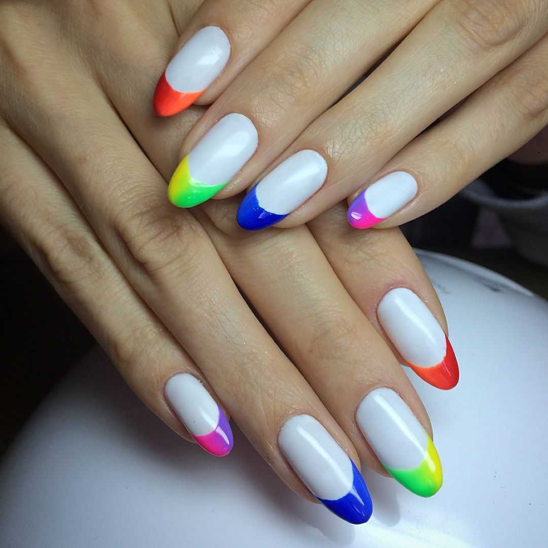 Разные оттенки используются для прорисовки «улыбки» френча или заполняют все пространство ногтевой пластины. Для френча чаще всего используют яркие оттенки с переходом цвета в пределах одного ногтя или по всей руке. Если вы решили прокрасить «улыбку» всеми цветами радуги, то остальное пространство ногтя лучше оставить не окрашенной либо покрыть его белым гель-лаком. Акцент в этом дизайне должен быть только один и это разноцветная линия «улыбки».