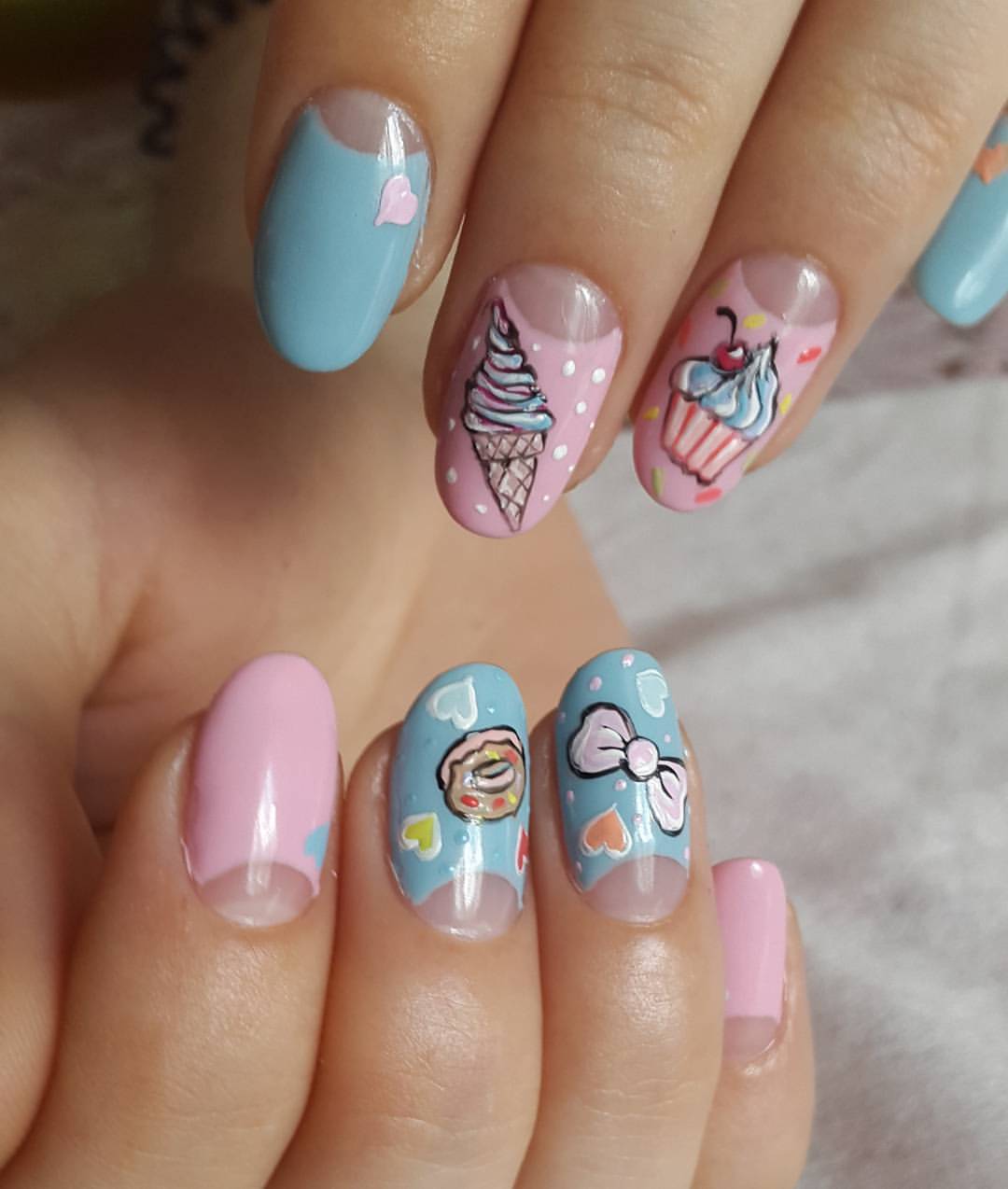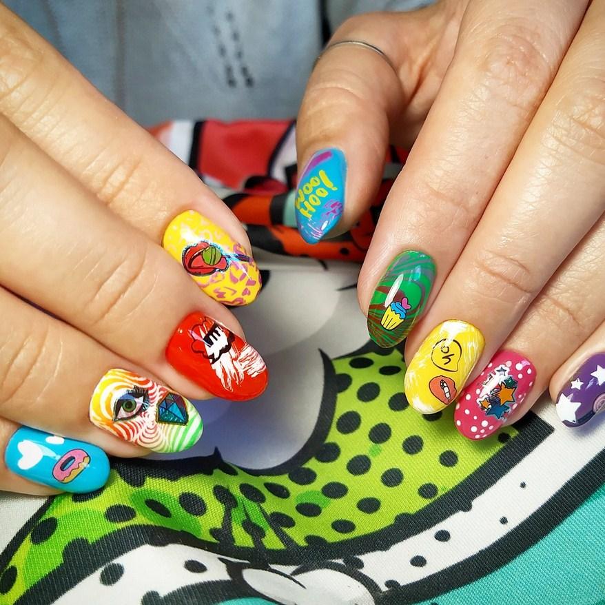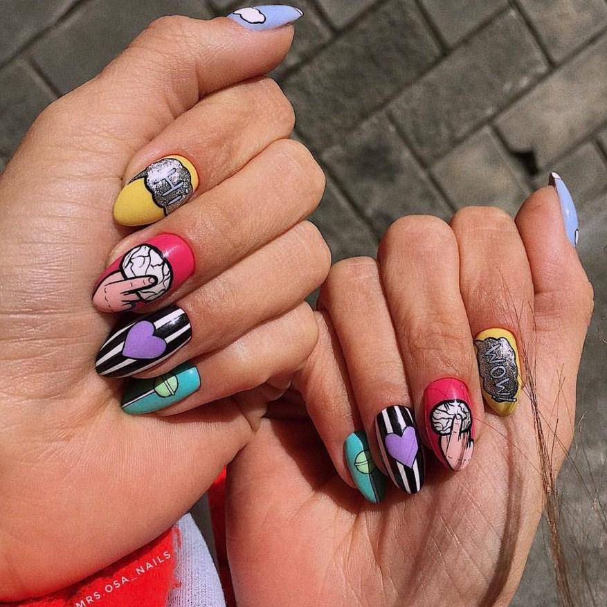 Оформление ногтей в стиле поп-арт – это дополнение основного дизайна надписями, графикой, логотипами, броскими рисунками из детских мультиков и фильмов. Базовое покрытие тоже надо делать ярким: самыми популярными тонами считаются жёлтый, лиловый, сочный розовый, зелёный.