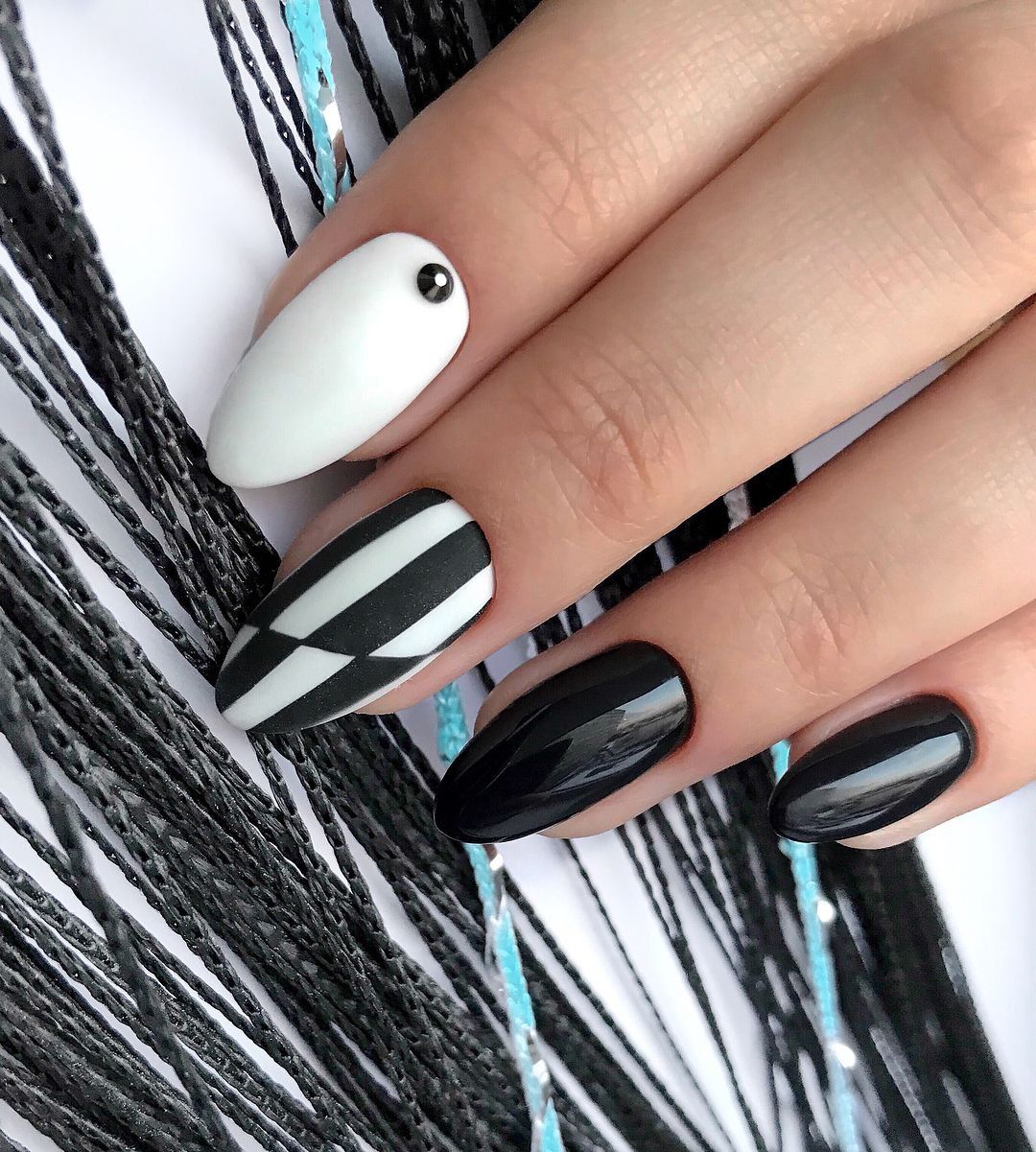 При желании дополняйте контрастный маникюр в черно-белом цвете легким декором.