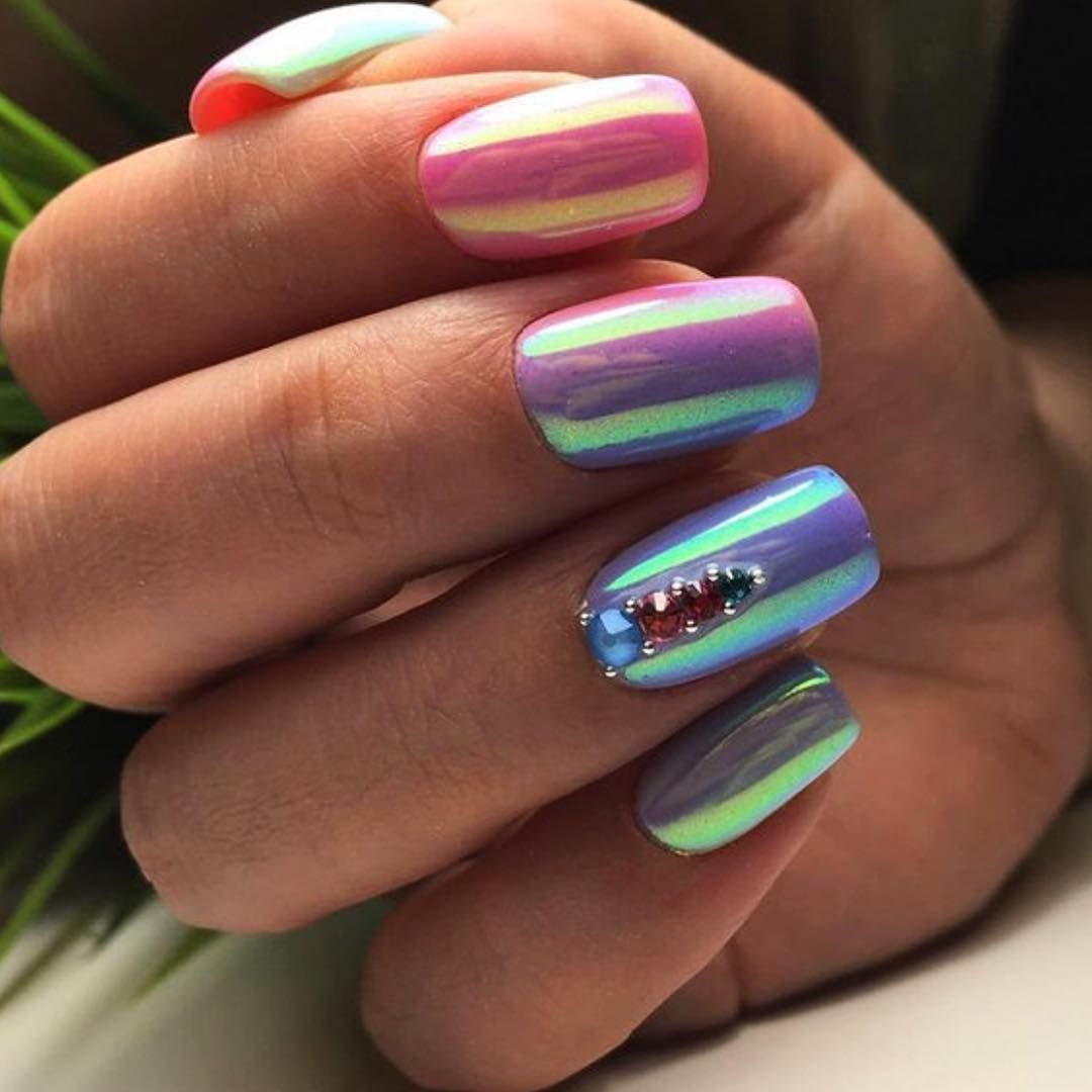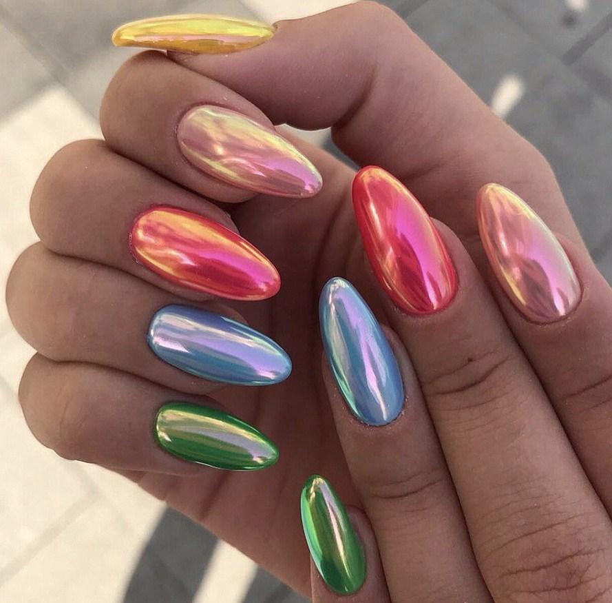 На фото в модных журналах нередко можно увидеть сияющие покрытия с голографическим или зеркальным эффектом. Их даёт акриловая пудра, которая наносится на не подсохшую основу. Можно выбрать два тона и выполнить покрытие с втиркой в технике разноцветные руки. Также втиркой можно делать рисунки, отдельные жемчужные акценты, эффект негативного пространства.