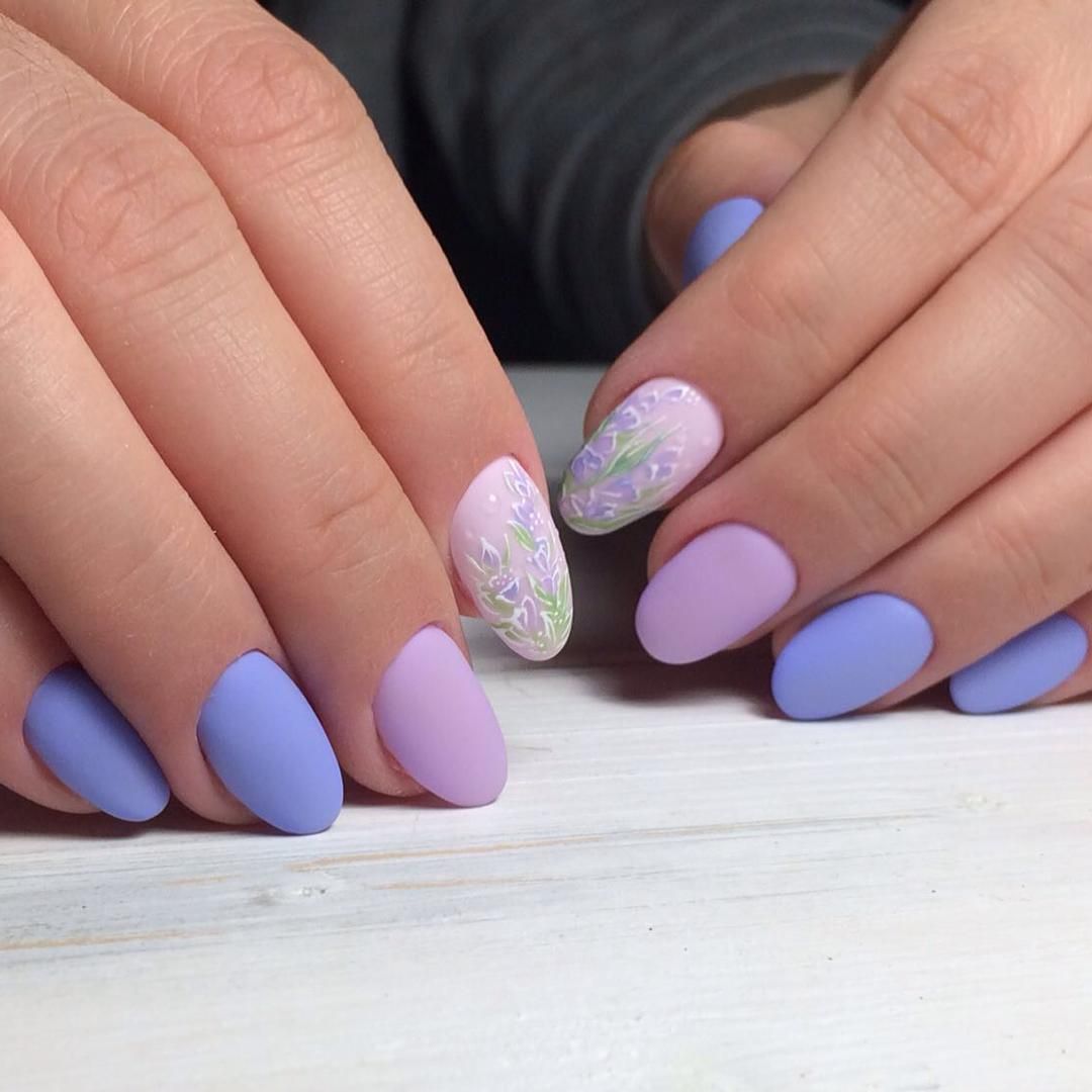 Изображения цветка, листьев, другие флористические принты очень стильно и нежно смотрятся на фоне однотонной базы. Можно скомбинировать их с разноцветным стилем несколькими способами: менять тон основы, отдельных рисунков, чередовать цвет ноготков. Цветочный дизайн отлично сочетается с фольгой, стразами, втиркой, флоком.