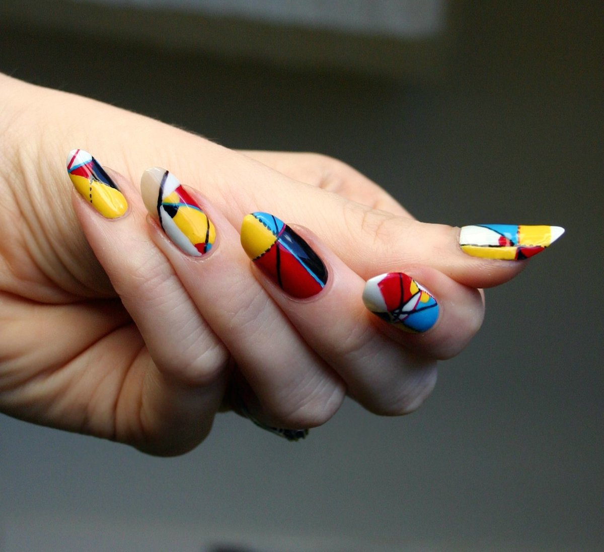 Геометрические формы, чёткие линии, лаконичные принты – шикарное решение для оформления в технике разноцветные руки. Такой декор выглядит довольно минималистично, но стильно и модно. На одной руке можно использовать пастельные тона лака, а на другой – яркие, либо покрыть ногти близкими по тональности цветами. Самые популярные изображения из геометрии – круги, ромбы, треугольники.