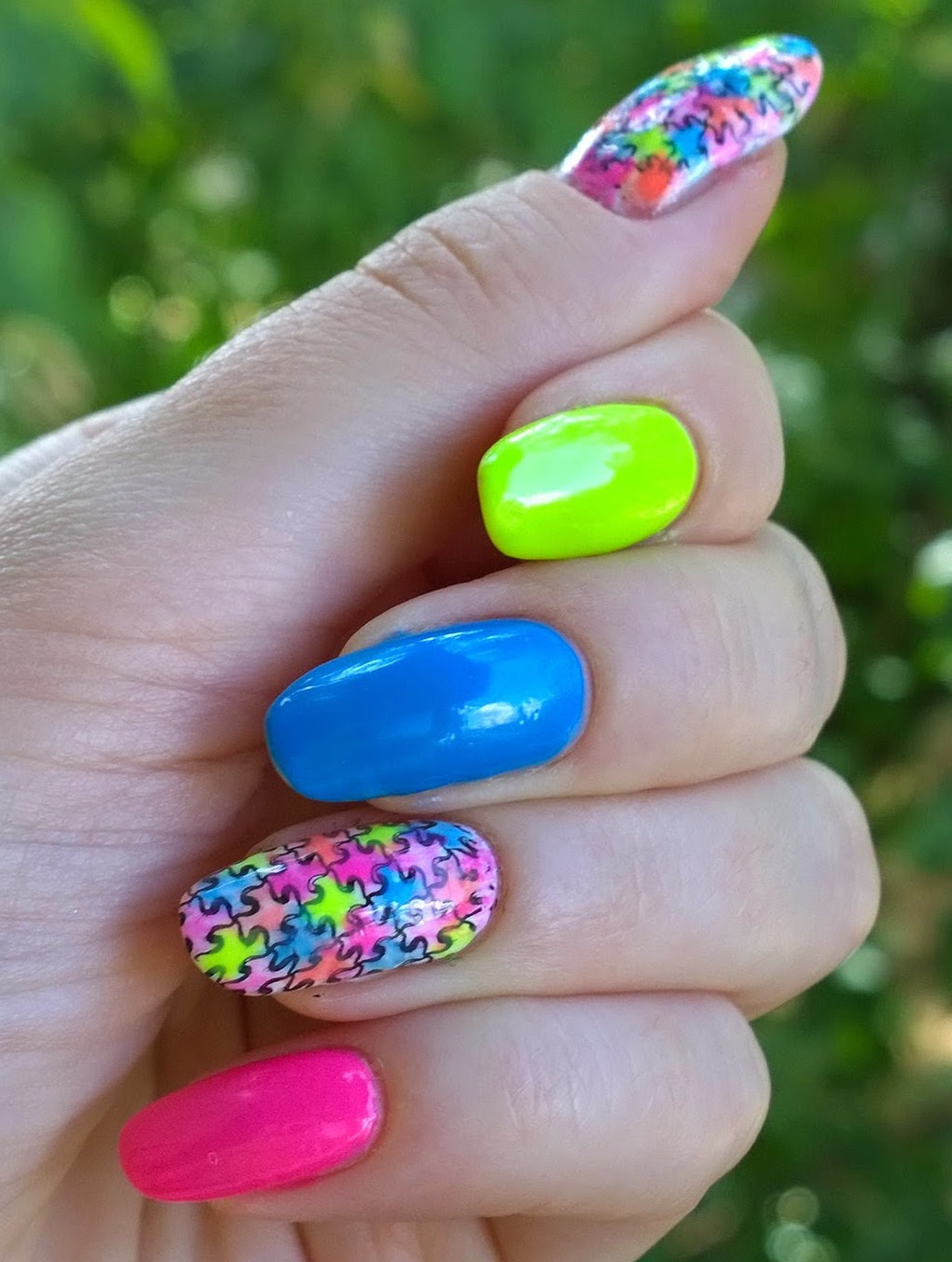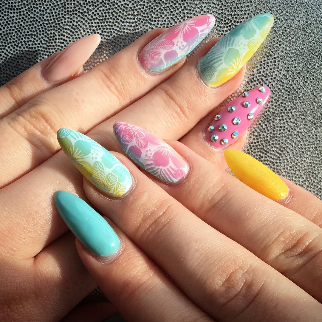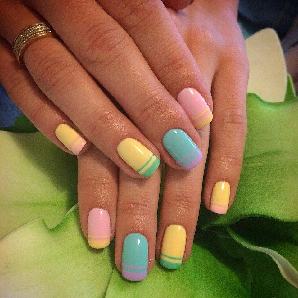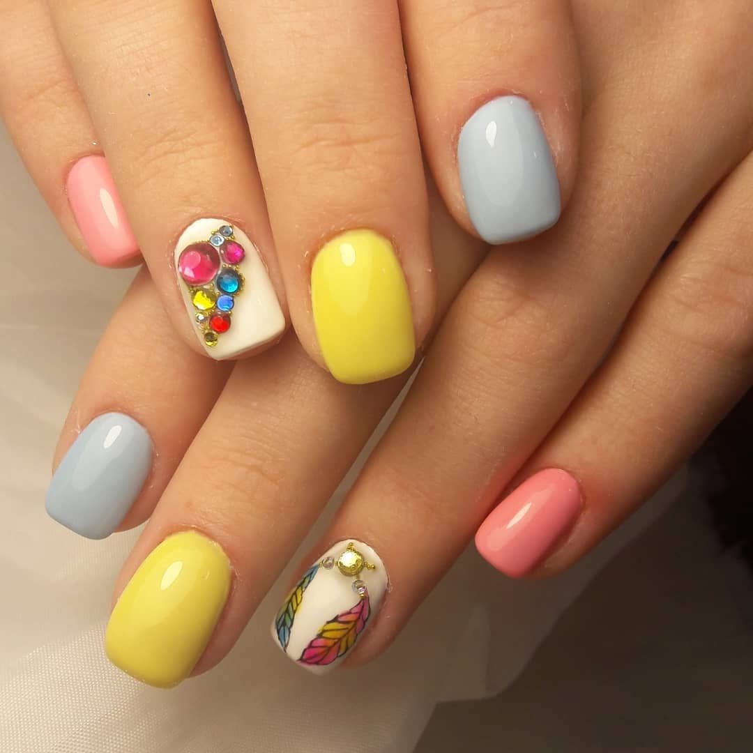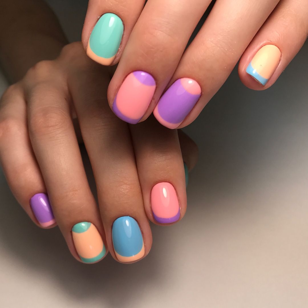 В 2023 году в трендах – цветные островки с растяжкой и окантовкой. Для разноцветных рук подбирают свежие, яркие оттенки и дополняют их нежными, пастельными тонами.