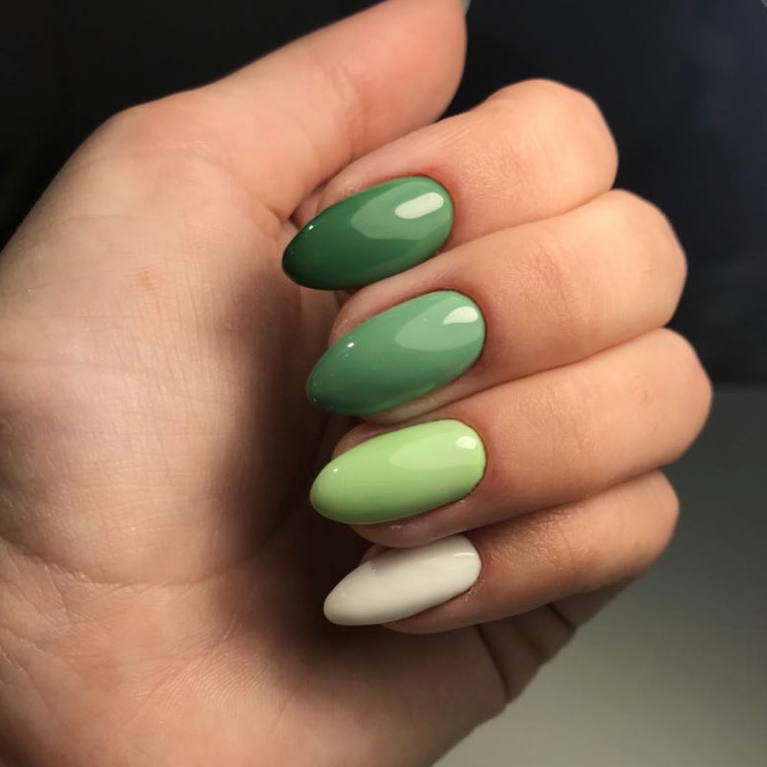 Зеленый — достаточно сложный цвет для носки на ногтях, поэтому начинать с ним эксперименты тоже следует с классических черных и белых тонов либо блестками. Лучше всего зеленый маникюр смотрится тематическим, например: