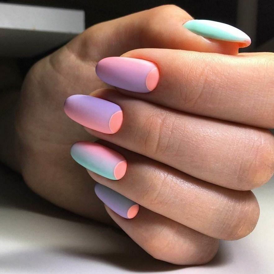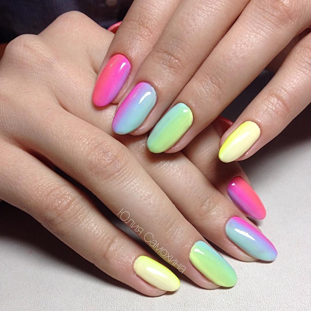 Градиент отличается от омбре тем, что тона необязательно переходят от тёмных к светлым. Его внешний вид предполагает плавное перетекание любого цвета в противоположный или смежный или комбинирование нескольких тонов. Для техники разноцветных рук градиент подходит замечательно. Модными парами в текущем году являются оранжевый и жёлтый, мятный и сиреневый, розовый и голубой.