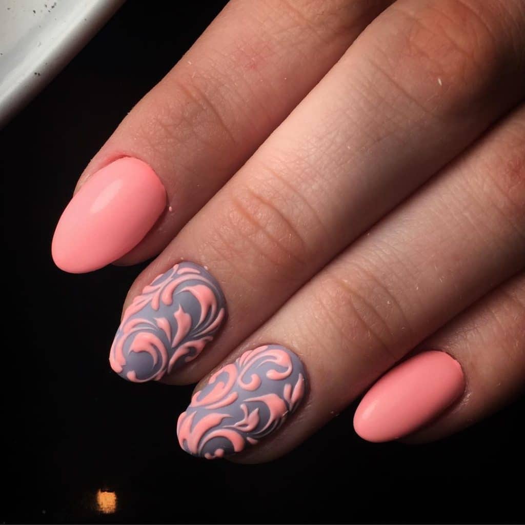 Кайму на миндале лучше выполнять в классическом виде, зато сами ногтевые пластины разрешается покрывать матовым и глянцевым лаком, наносить любые рисунки и применять разнообразный декор.