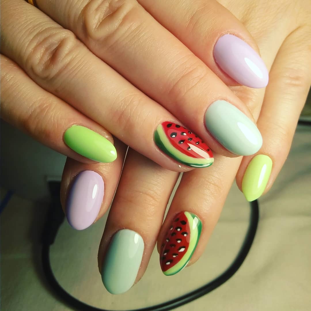 Особенно популярен яркий дизайн на длинные ногти в летнее время, когда все вокруг окутано ароматом отпусков, свежих фруктов и солнечного настроения.