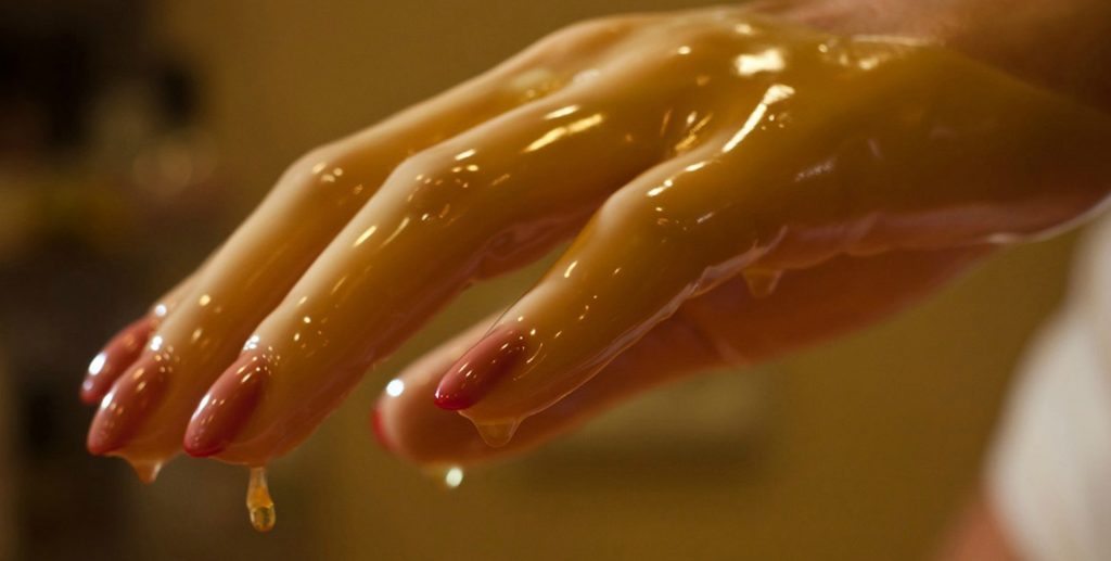 Для этой цели следует растопить парафин (можно взять обычную свечу без красителей), и погрузить пальцы в эту массу. Парафин должен быть не горячим, а теплым