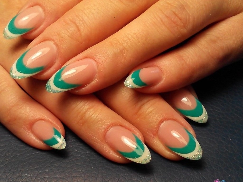 На миндальных ногтях красиво смотрятся треугольные, ассиметричные, ажурные лепестки. Овал зрительно делает пальцы более острыми, а американский вид дополняется блесками, наклейками.